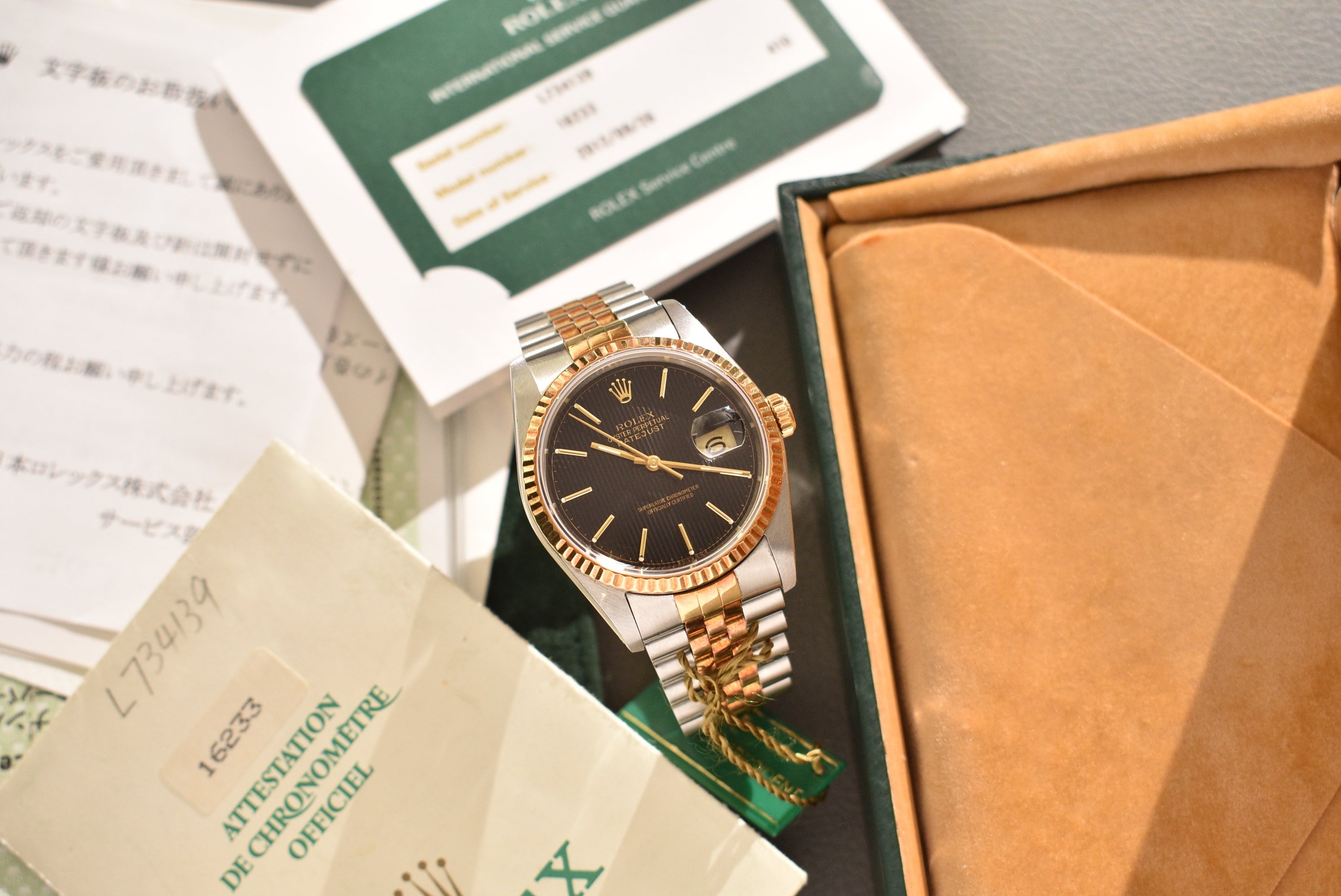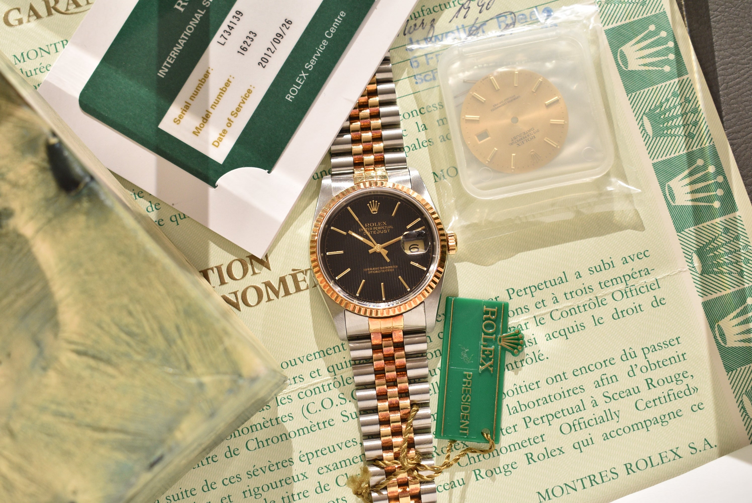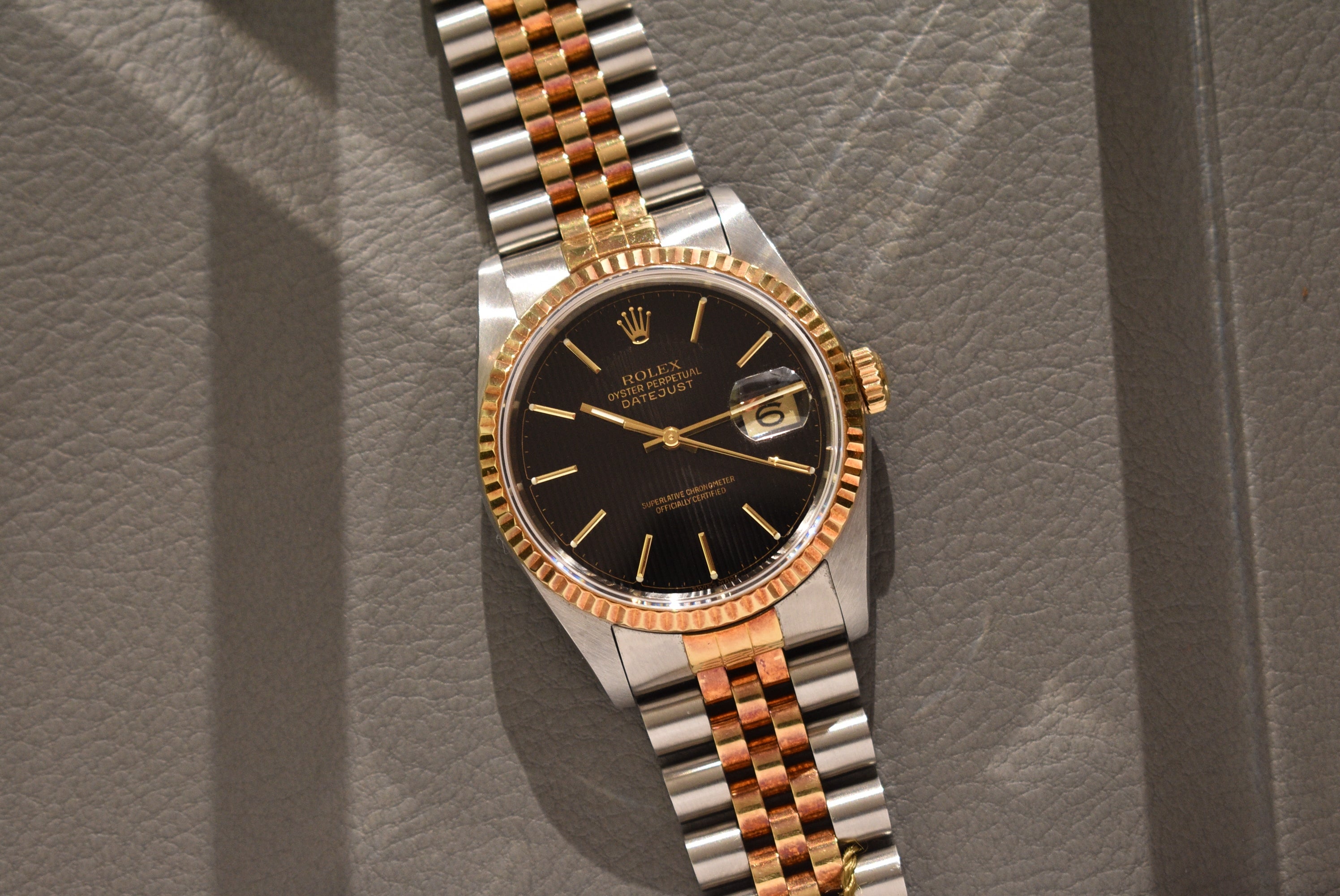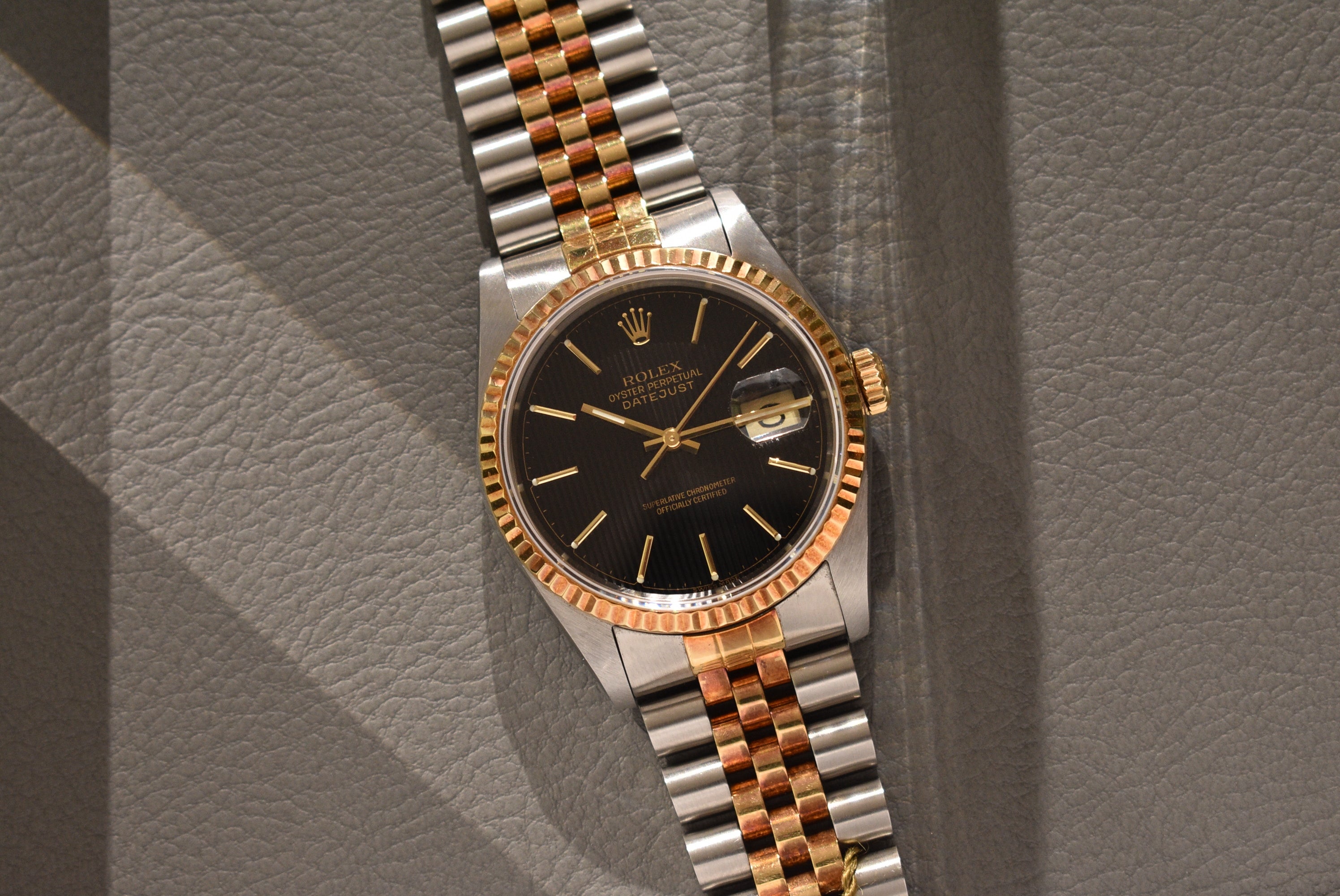 Hands down, the Rolex Datejust has become the most commonly known watch to everyone. The jubilee bracelet and fluted bezel work in harmony with a clean dial and simple date feature. The 16233 is also many people's sweet spot when it comes to Rolex. It is the most affordable Rolex model that can be had today with a sapphire crystal, quickset date, and a two-tone case and bracelet. The tapestry dial on this one gives it an extra bit of pop and class because of the dark black color. The tapestry dial is on of the coolest ones from the era. The way the pattern plays with the light is truly special. This specific example was taken care of so well, being served by Rolex twice and having all its original contents.