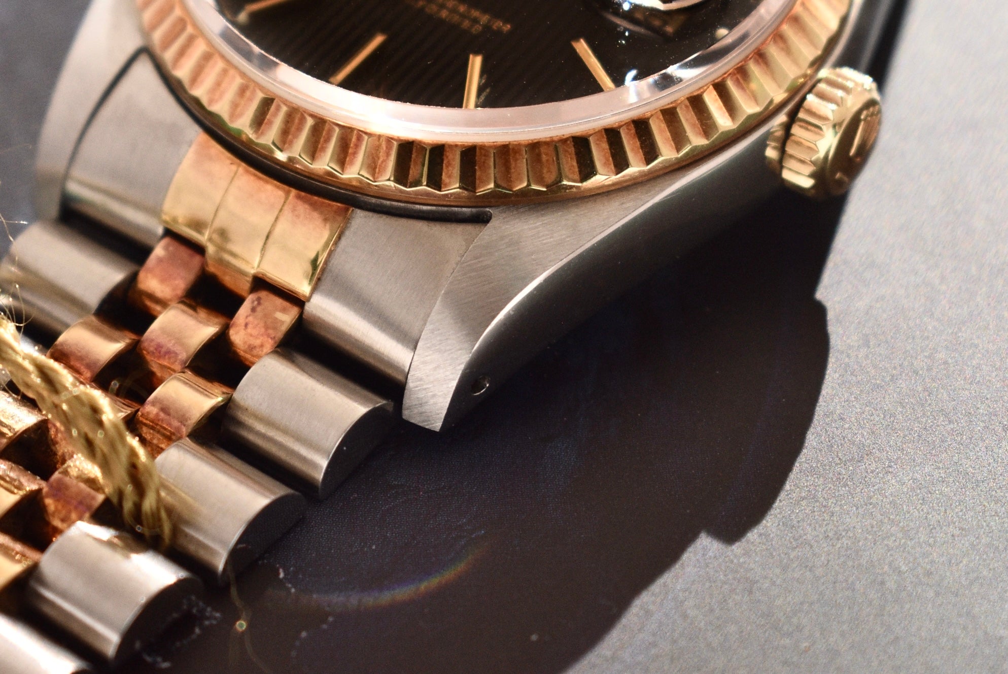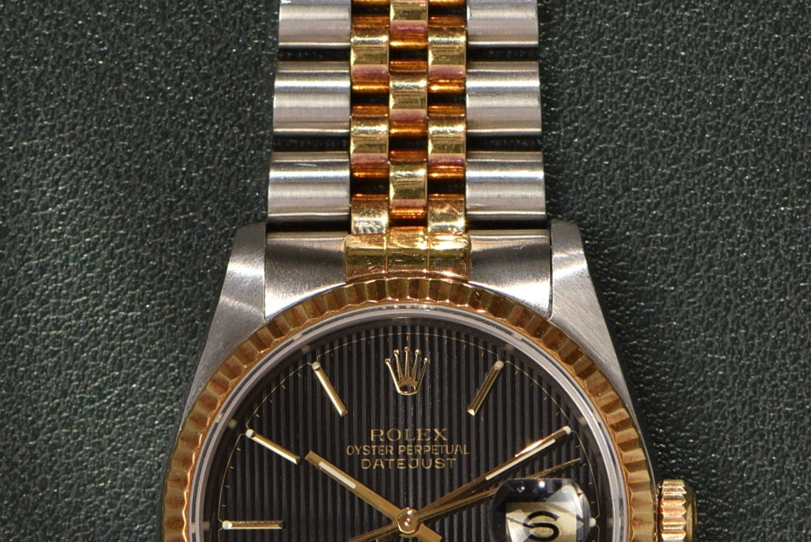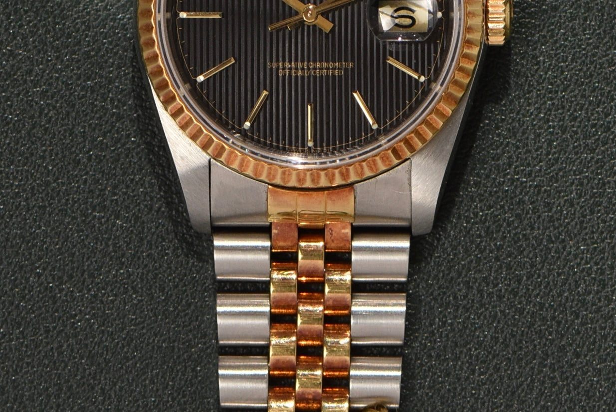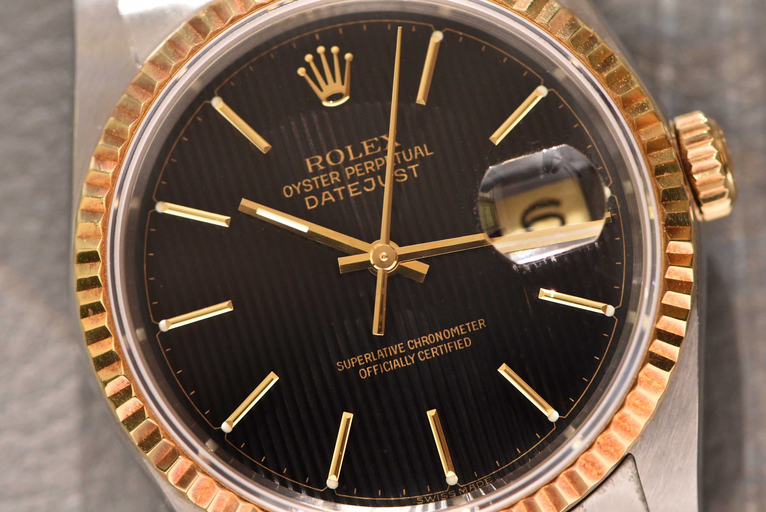 Hands down, the Rolex Datejust has become the most commonly known watch to everyone. The jubilee bracelet and fluted bezel work in harmony with a clean dial and simple date feature. The 16233 is also many people's sweet spot when it comes to Rolex. It is the most affordable Rolex model that can be had today with a sapphire crystal, quickset date, and a two-tone case and bracelet. The tapestry dial on this one gives it an extra bit of pop and class because of the dark black color. The tapestry dial is on of the coolest ones from the era. The way the pattern plays with the light is truly special. This specific example was taken care of so well, being served by Rolex twice and having all its original contents.