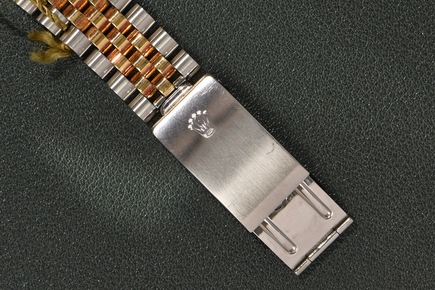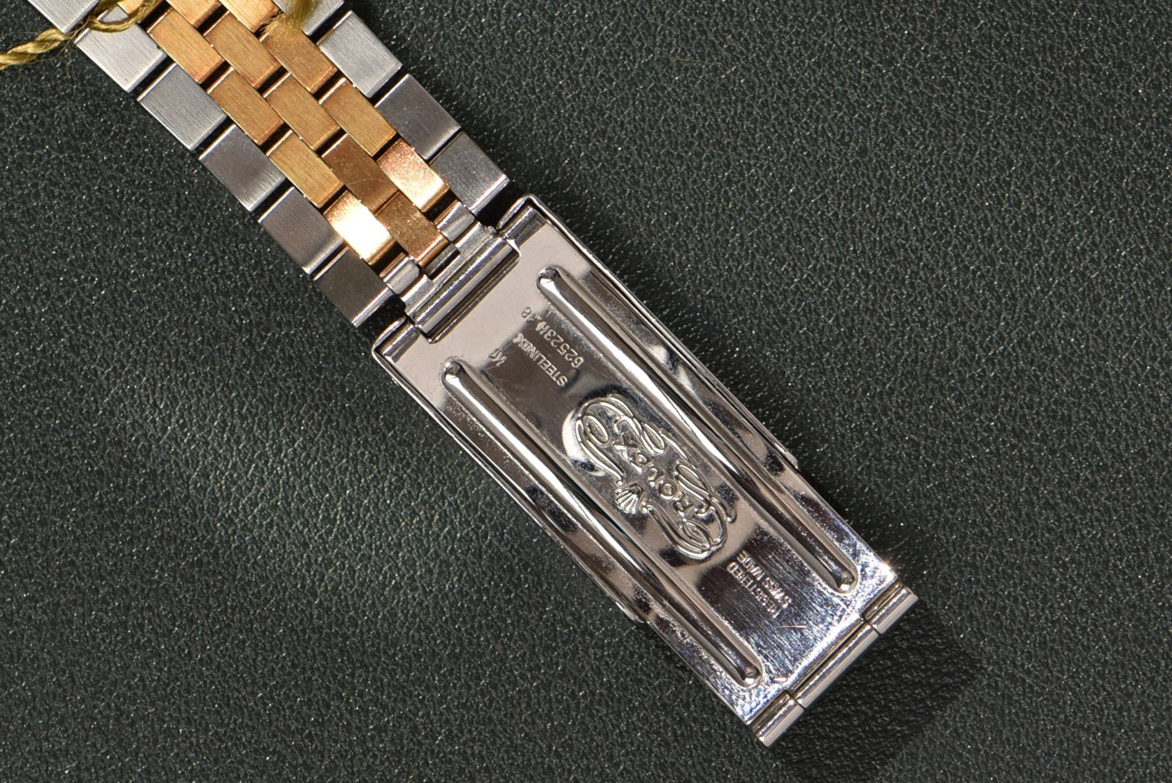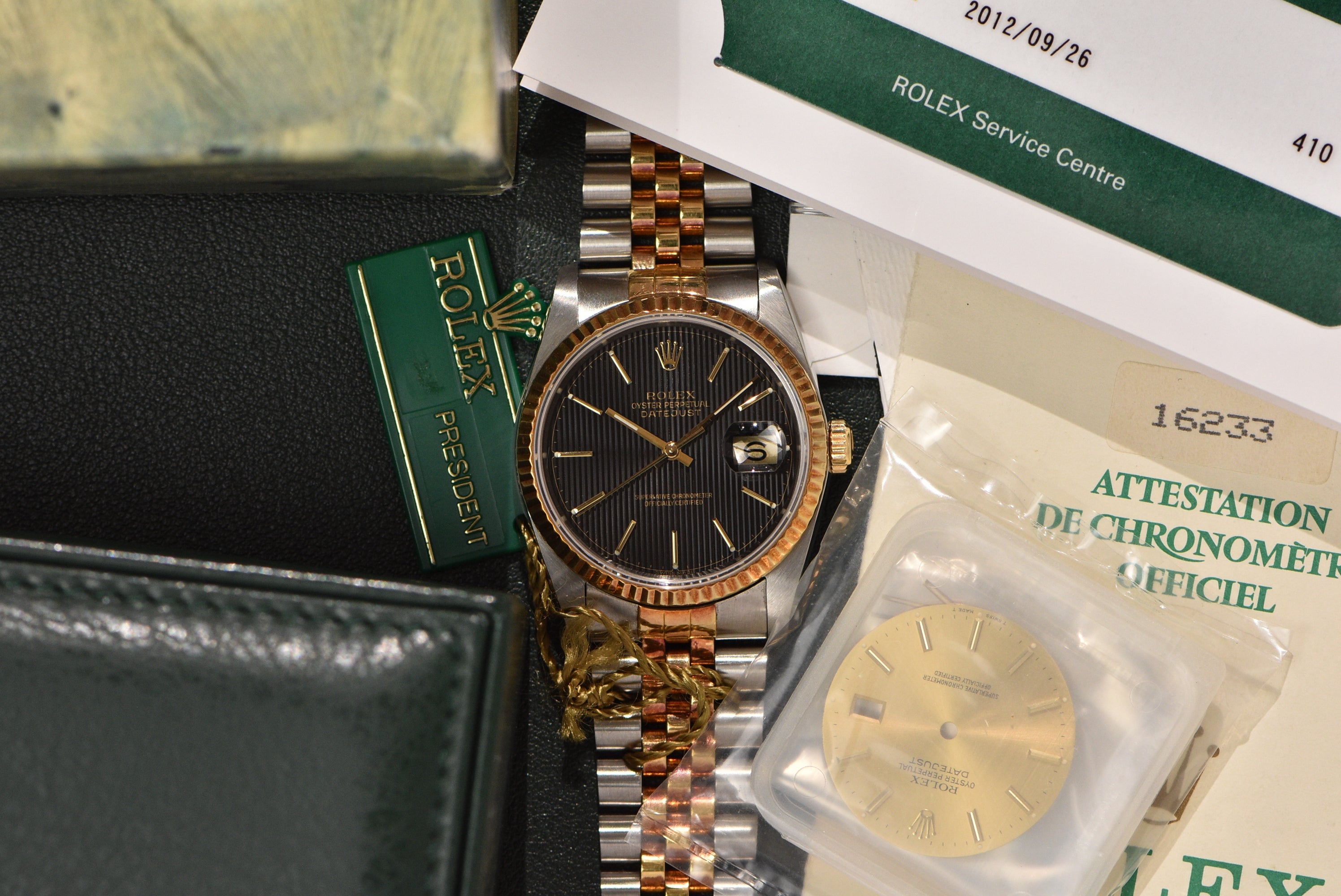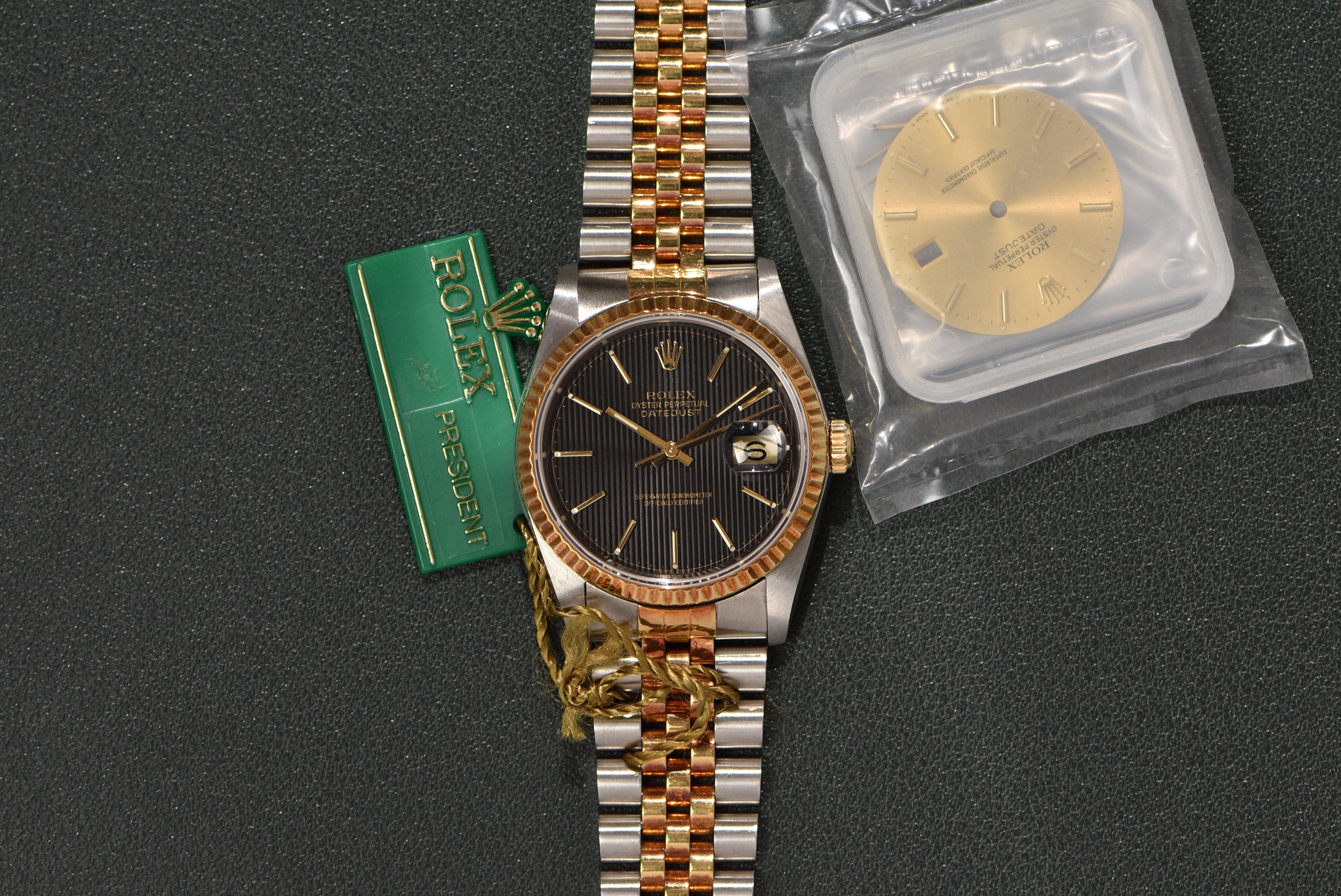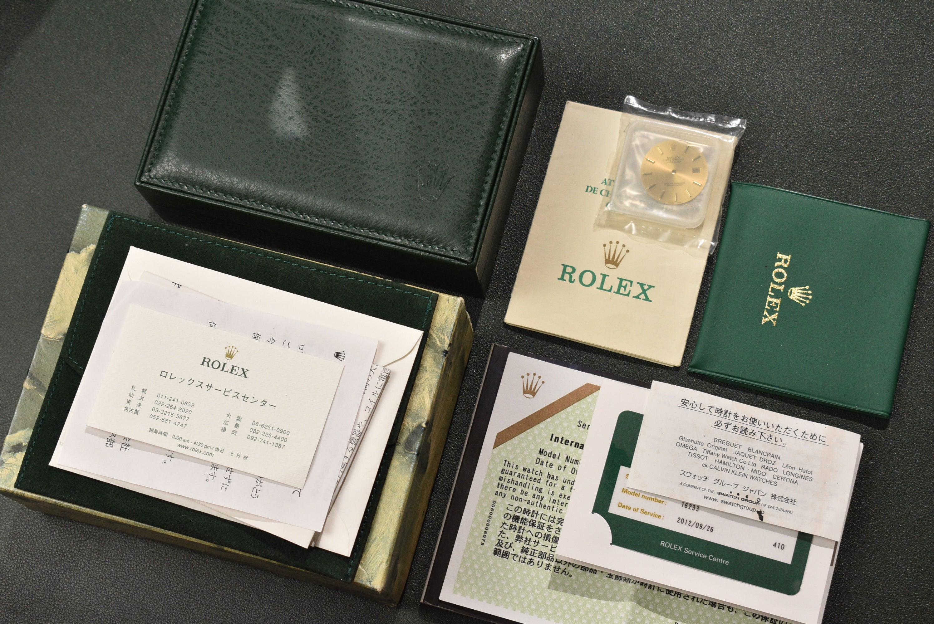 The dial steels the light on this reference. The case is unpolished and in great condition, a for sure, well-preserved example. The watch comes with the original champagne dial and hands still package from the Rolex Service Center, original papers, two Rolex service certificates, both tags and a few booklets and paperwork. The dial is in amazing condition, the bracelet has minimal wear and the case is very thick and even.