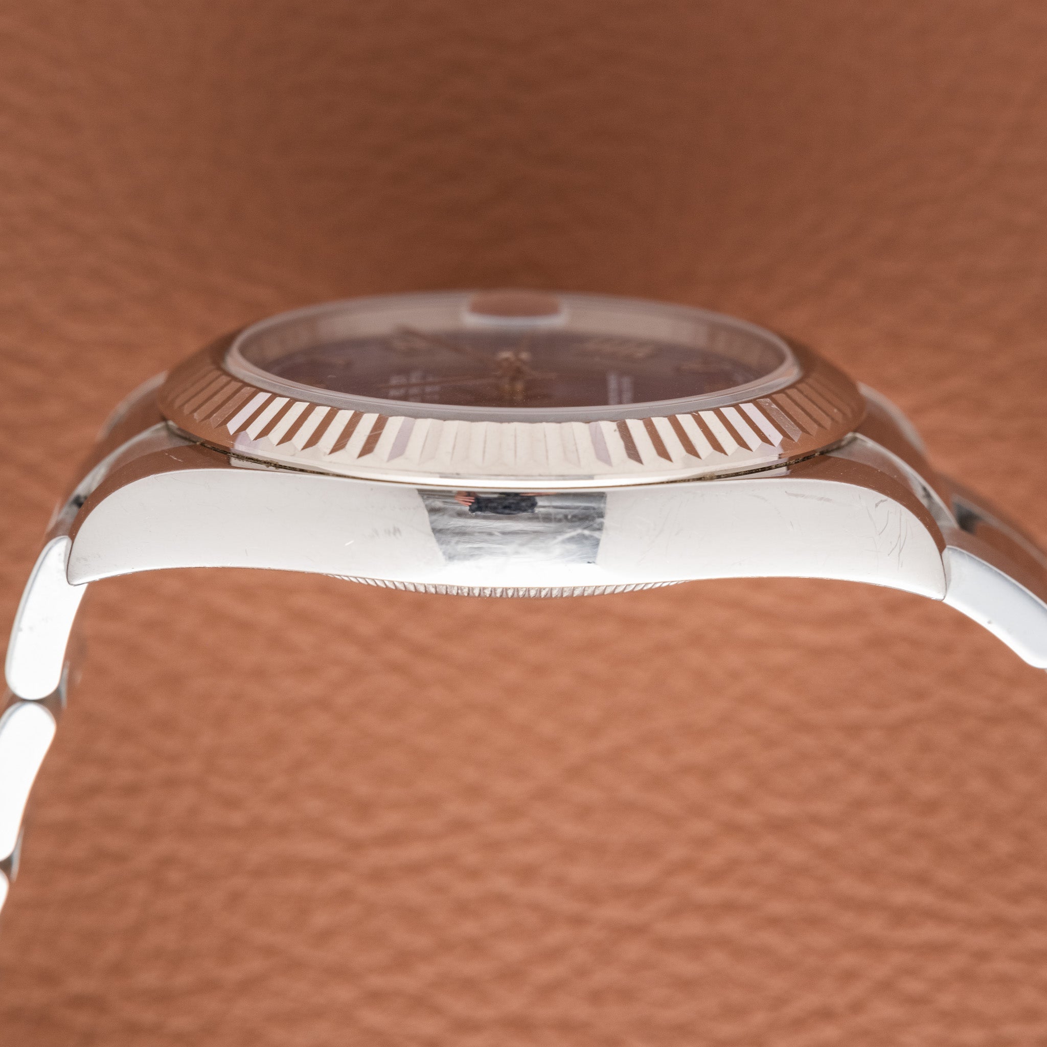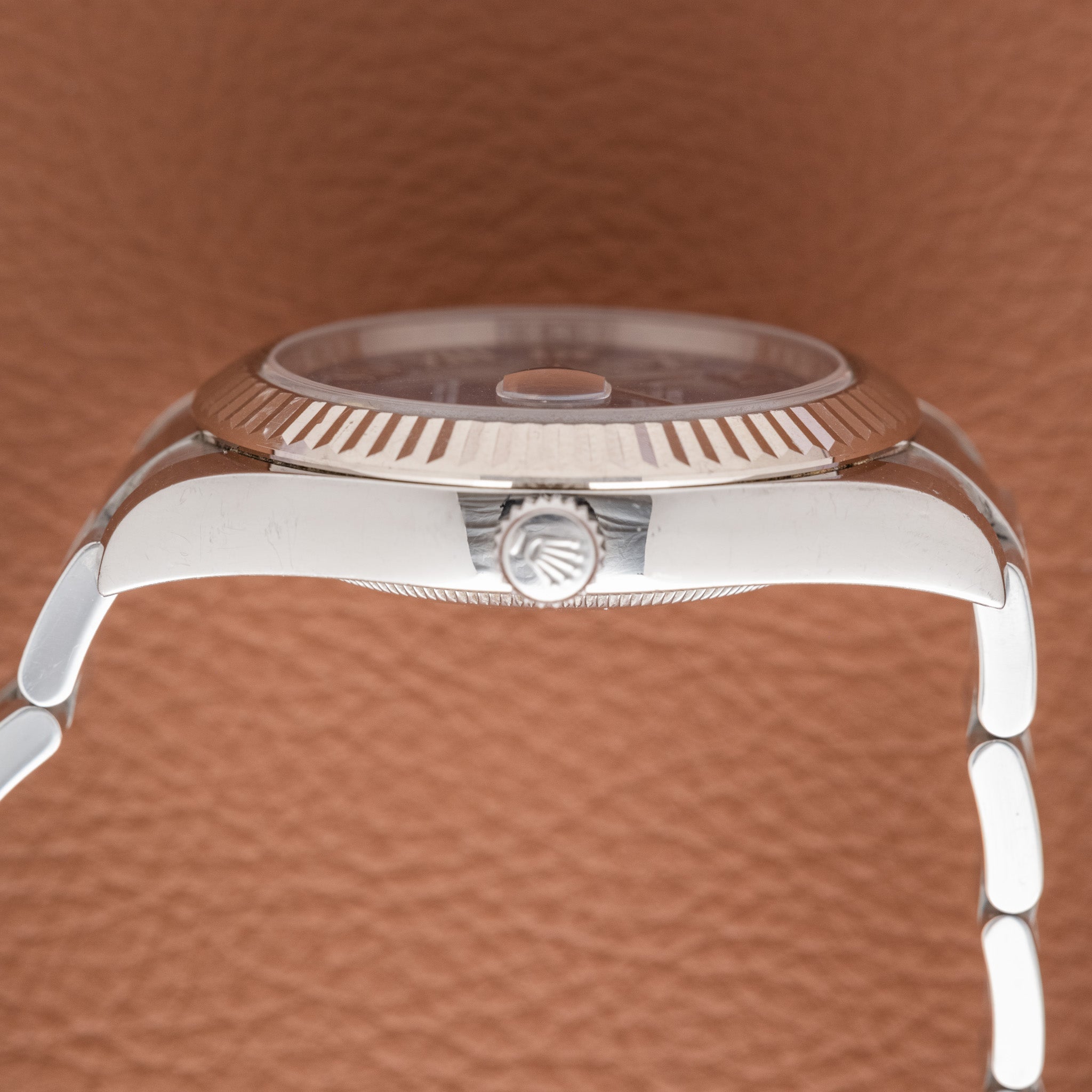 Reference 116334 pairs a stainless steel Oyster case with an 18k white gold fluted bezel, a combination that has long been considered the quintessential Datejust configuration. The blue Roman numeral dial adds a more expressive character compared to standard stick dials, while still remaining unmistakably Rolex. It is a configuration that bridges classic styling with contemporary sizing.