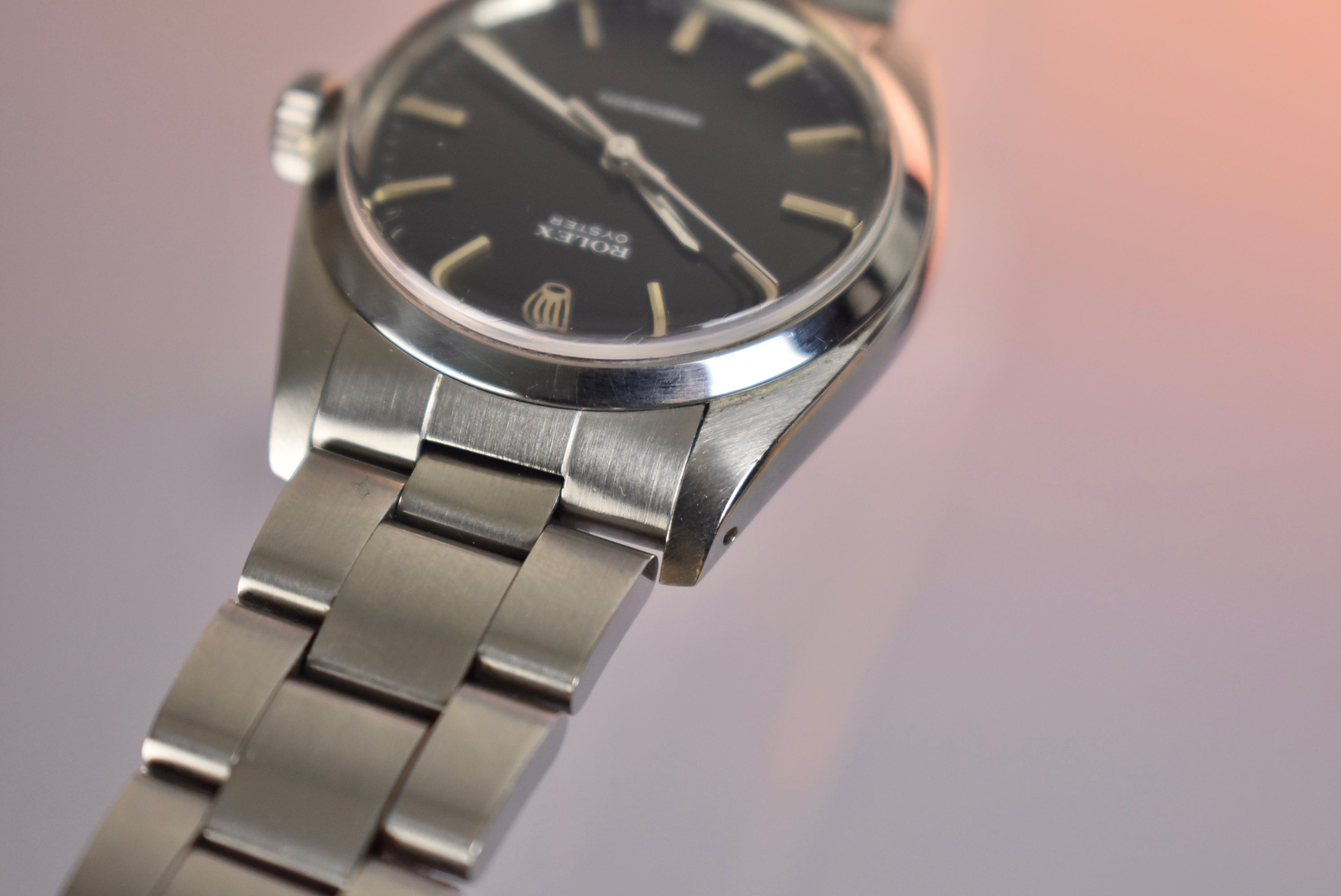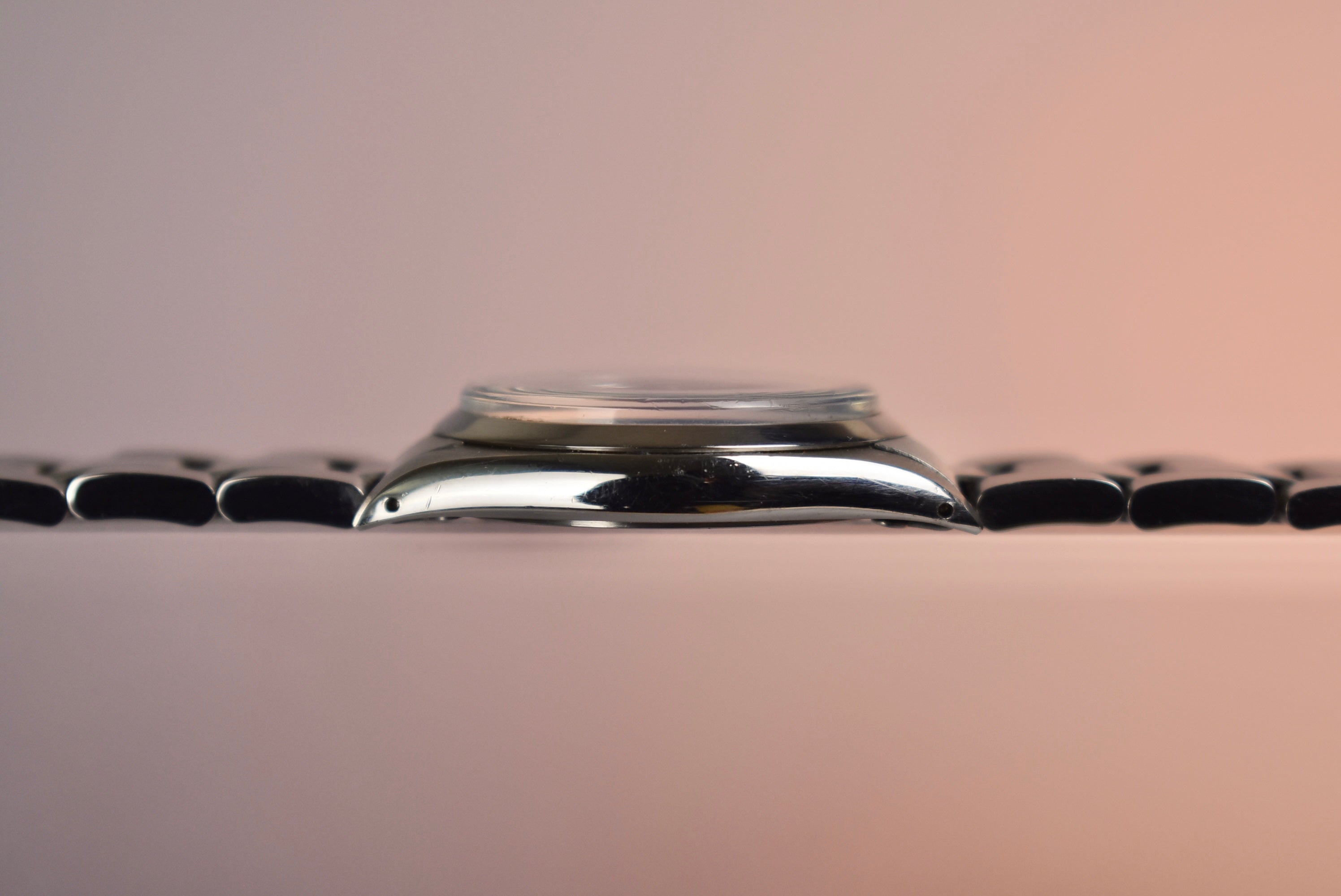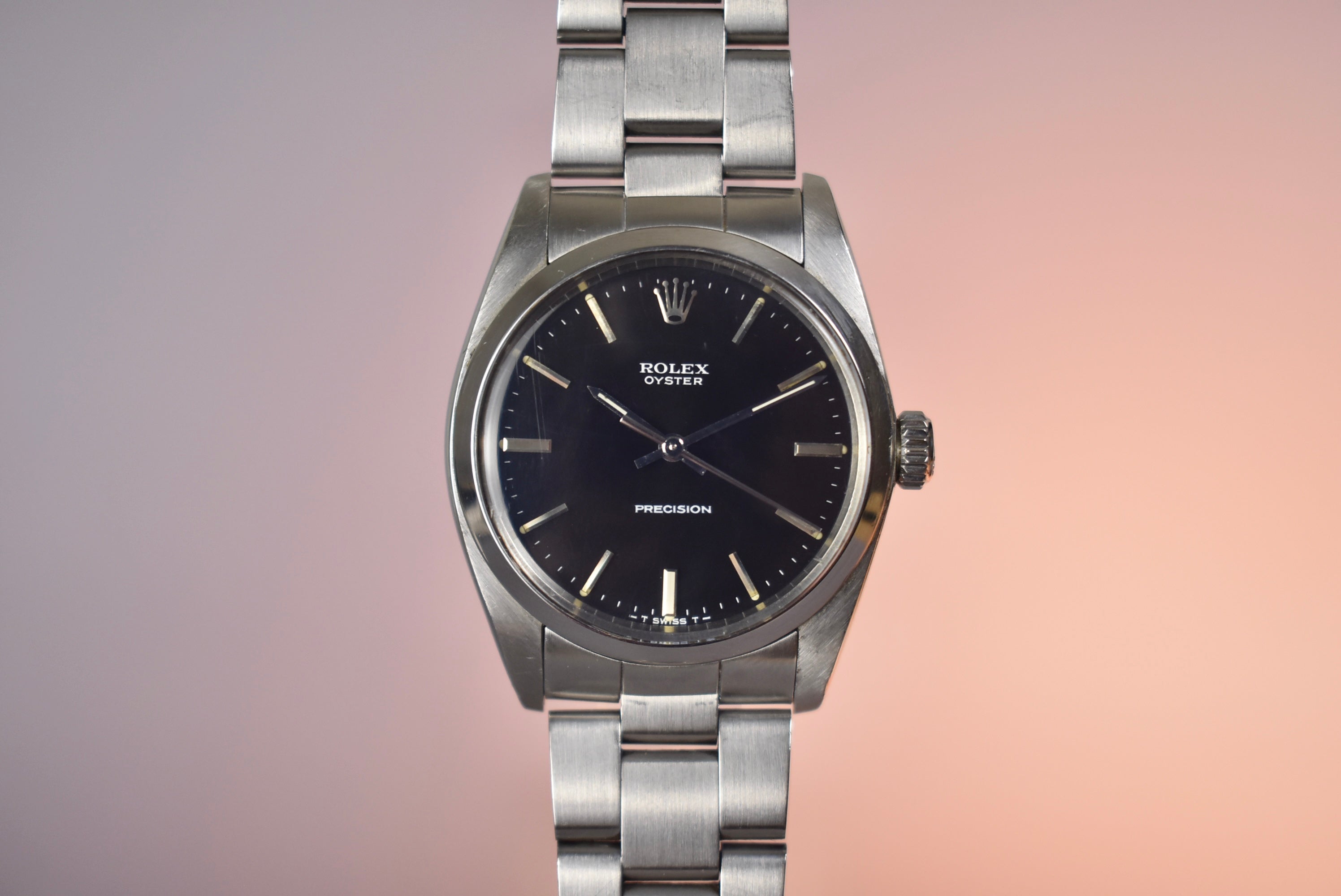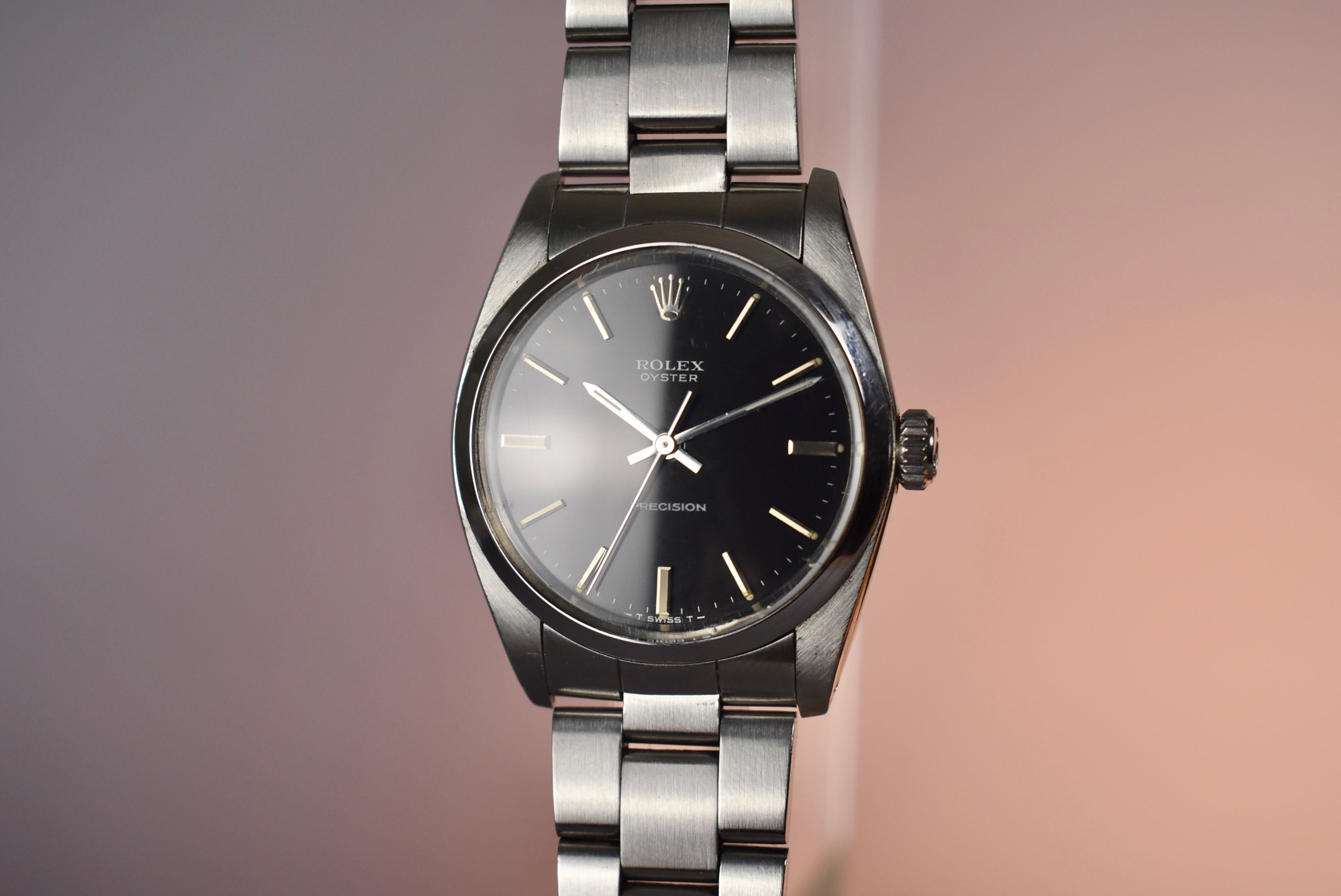 Dating back to the mid '80s, this 6426 was one of the last Rolex No-Date Oysters produced. This example features a super clean and rare gloss black dial. The case is still super sharp and the bracelet is tight. A lot of people shy away from the 34mm cases but i think they wear great for an average wrist. In my opinion, a smooth bezel 34mm is very comfortable and something about them make suede straps the perfect combo.