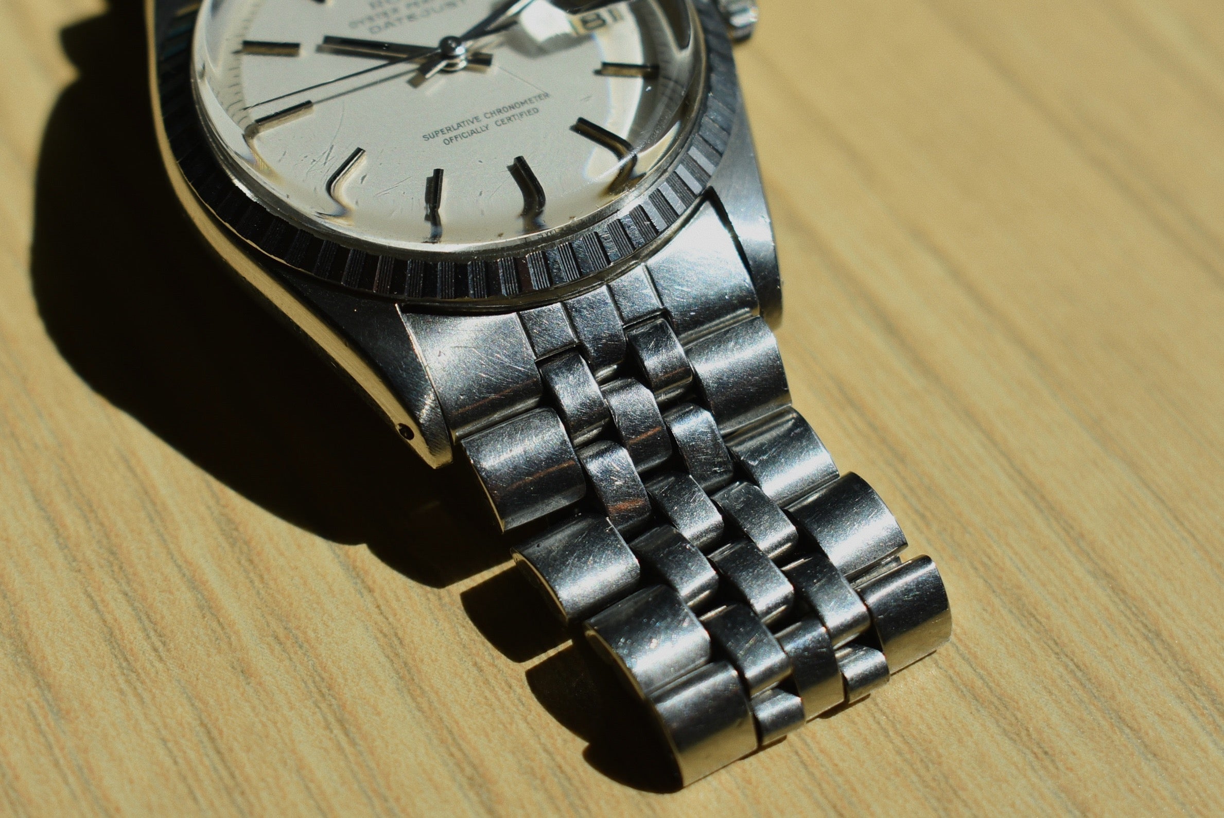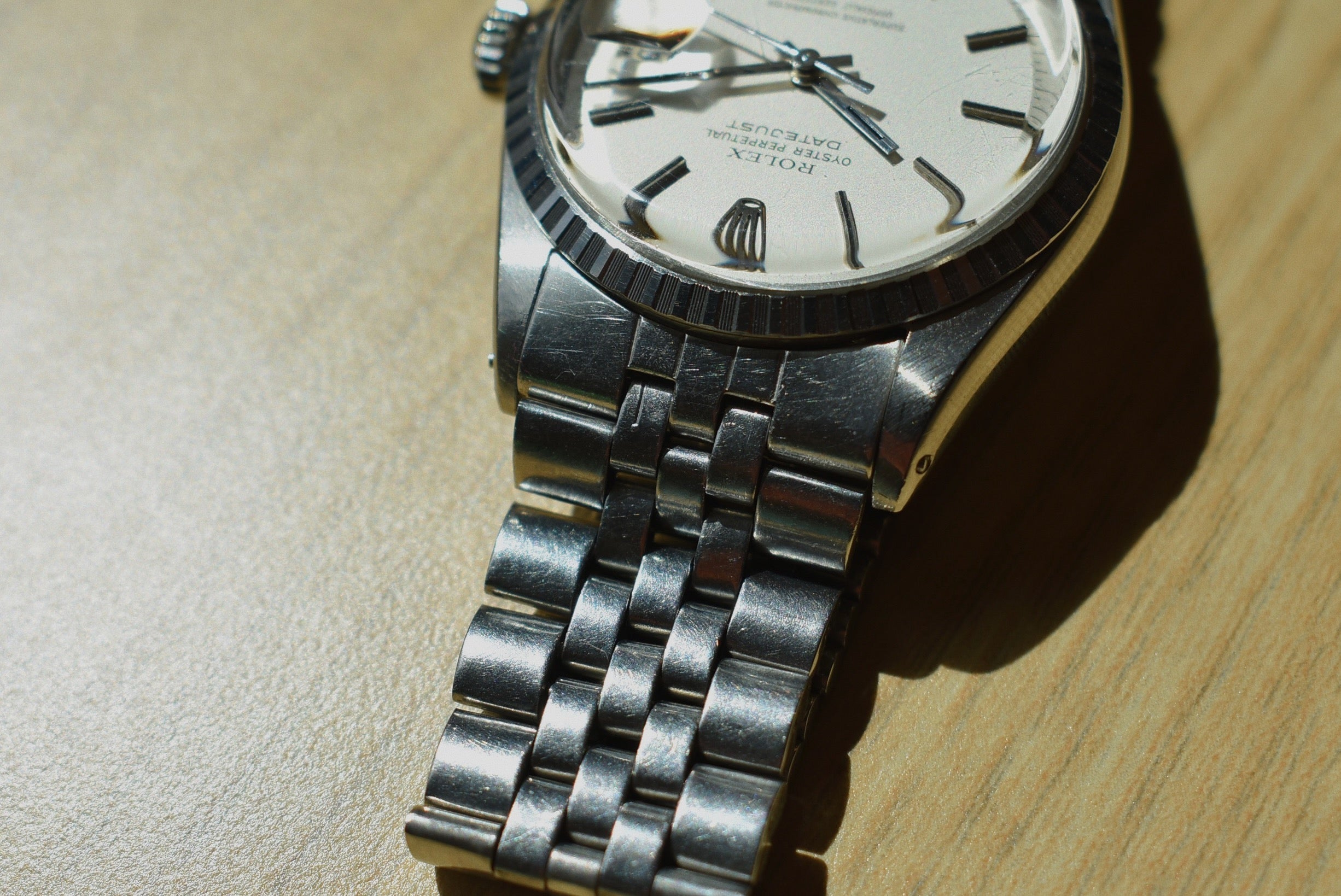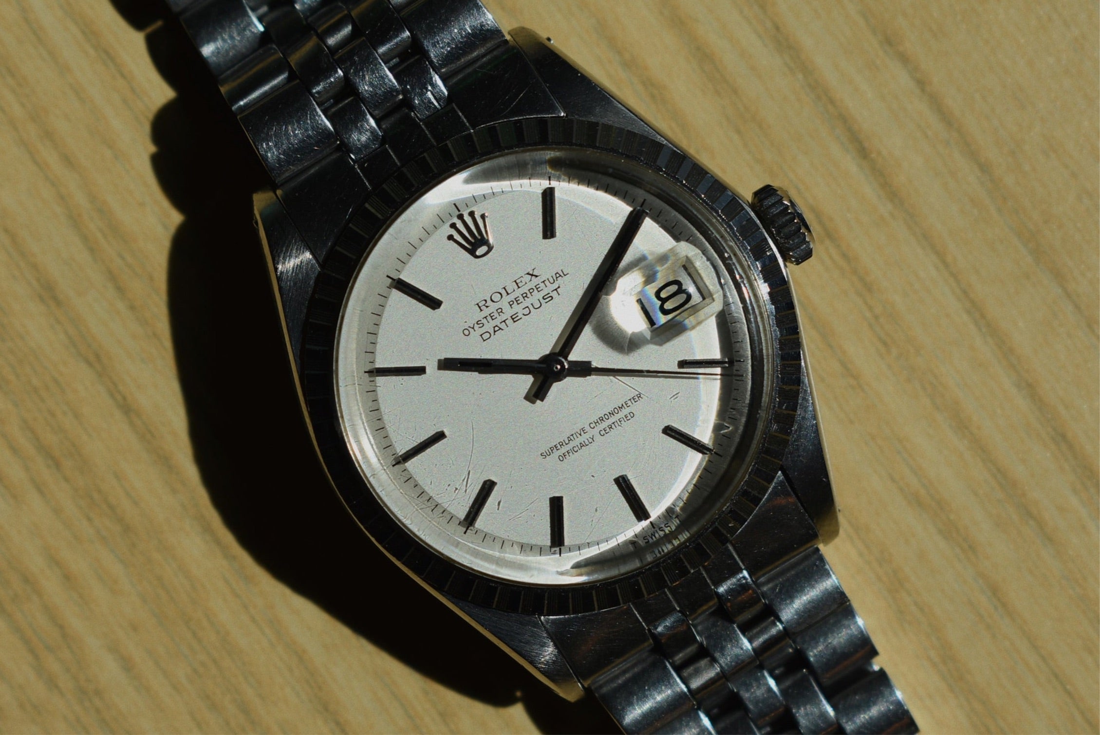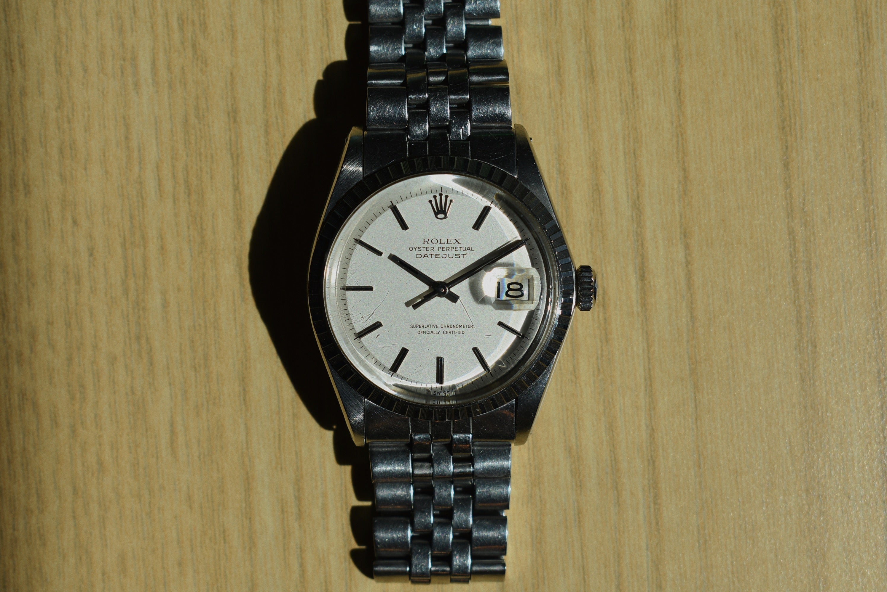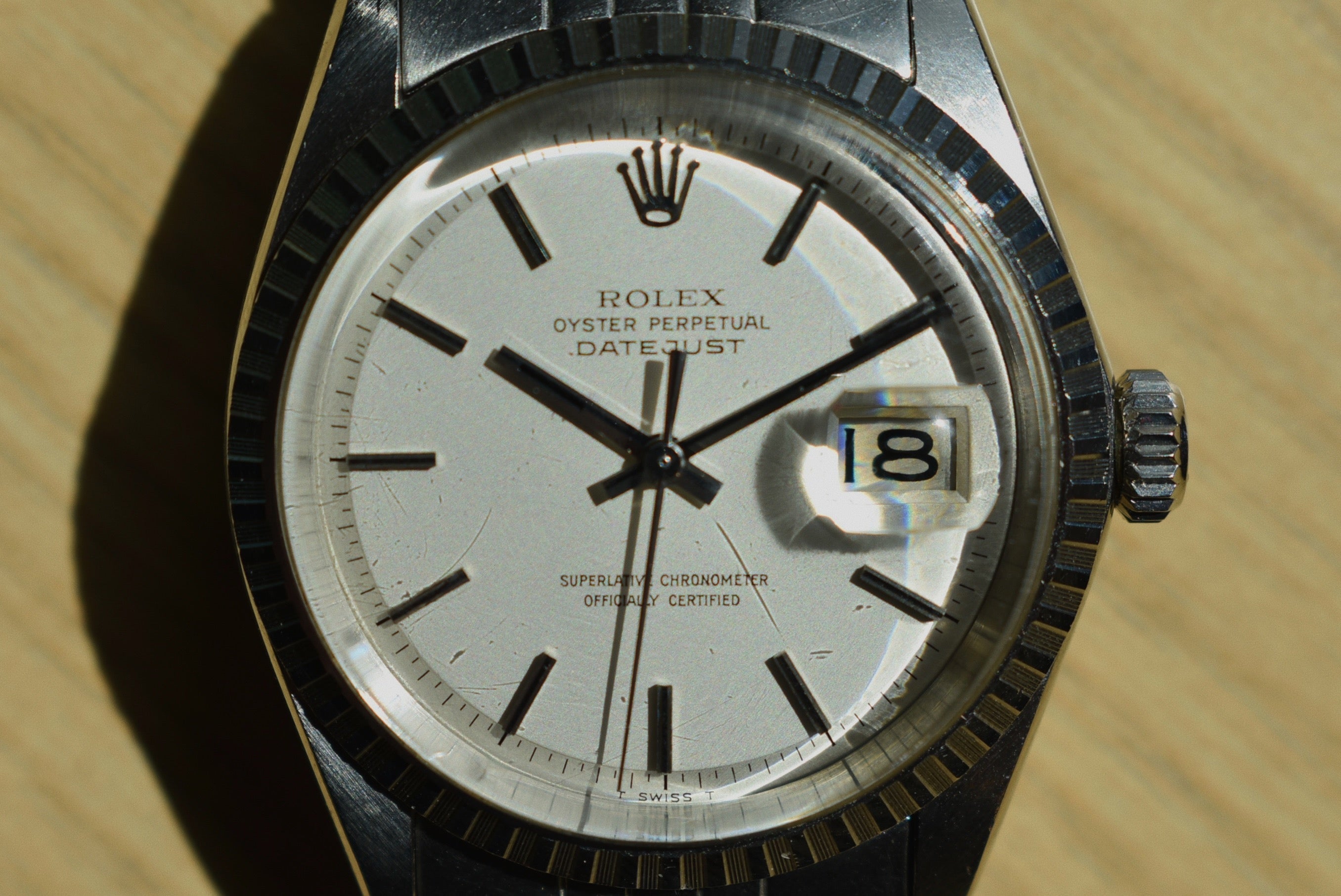 Not your everyday rolex dial. A white dial with a silver hue, non-lume and with a matte texture. A great dial to have if you enjoy wearing your Datejust with a leather strap because this would work great with anything.