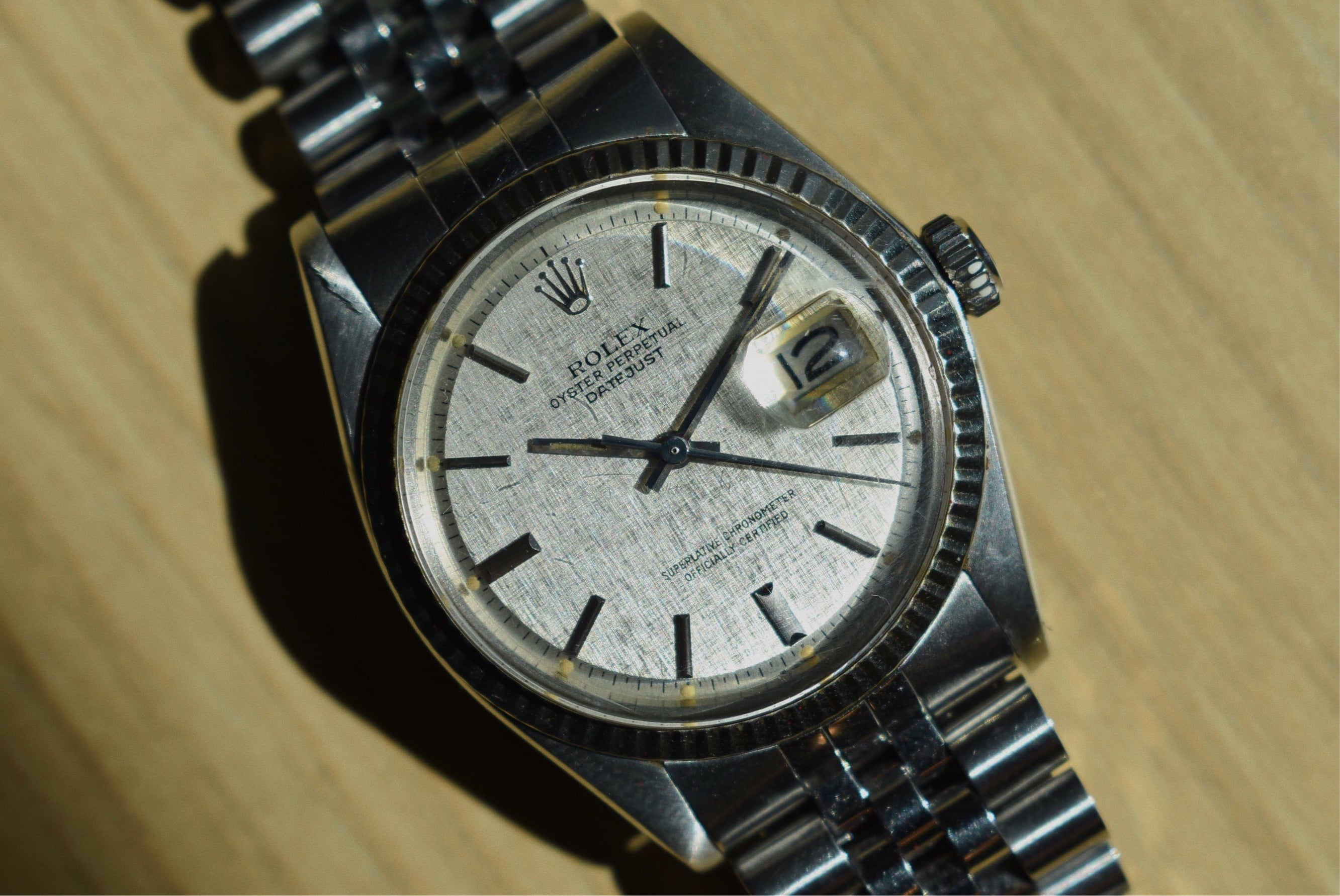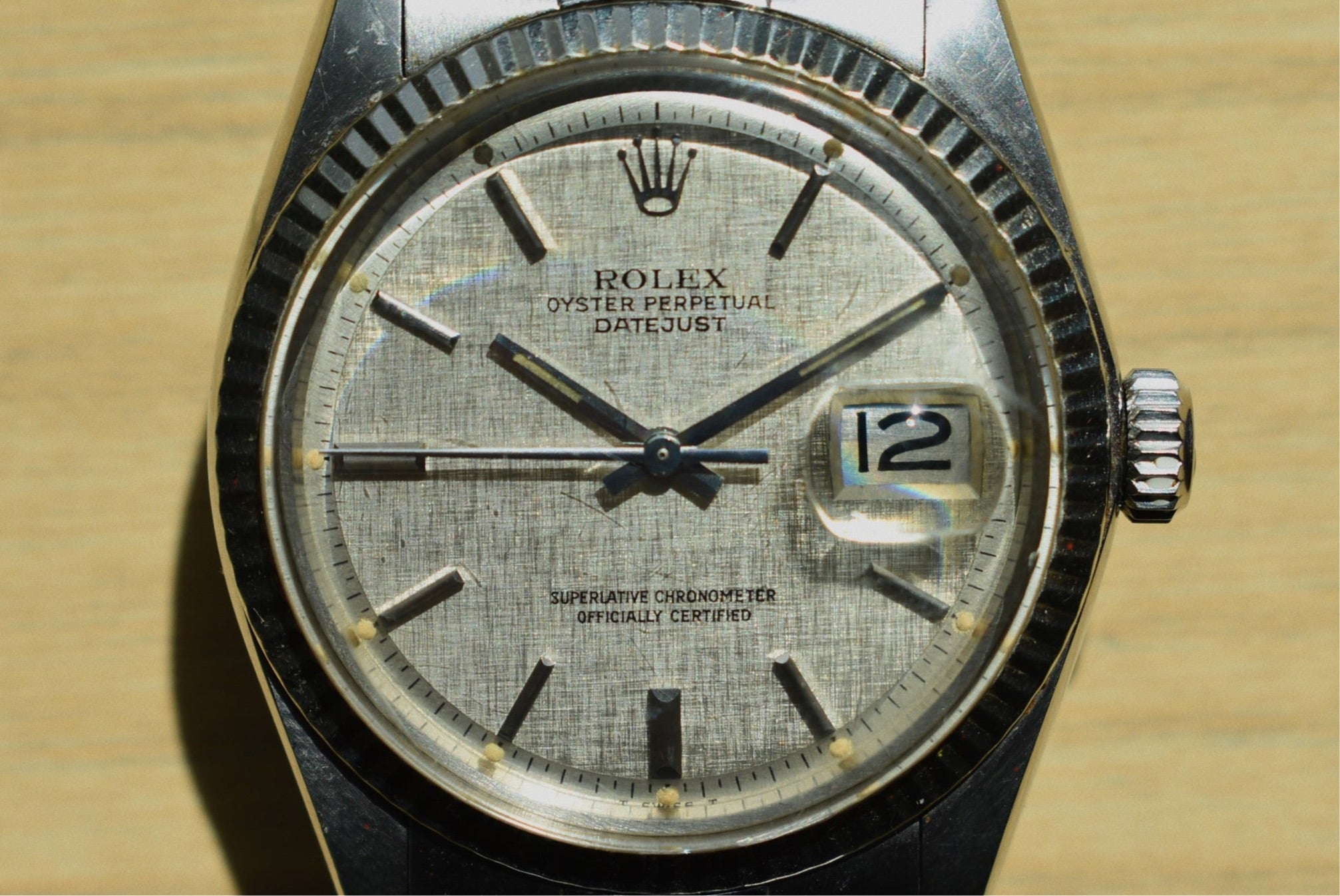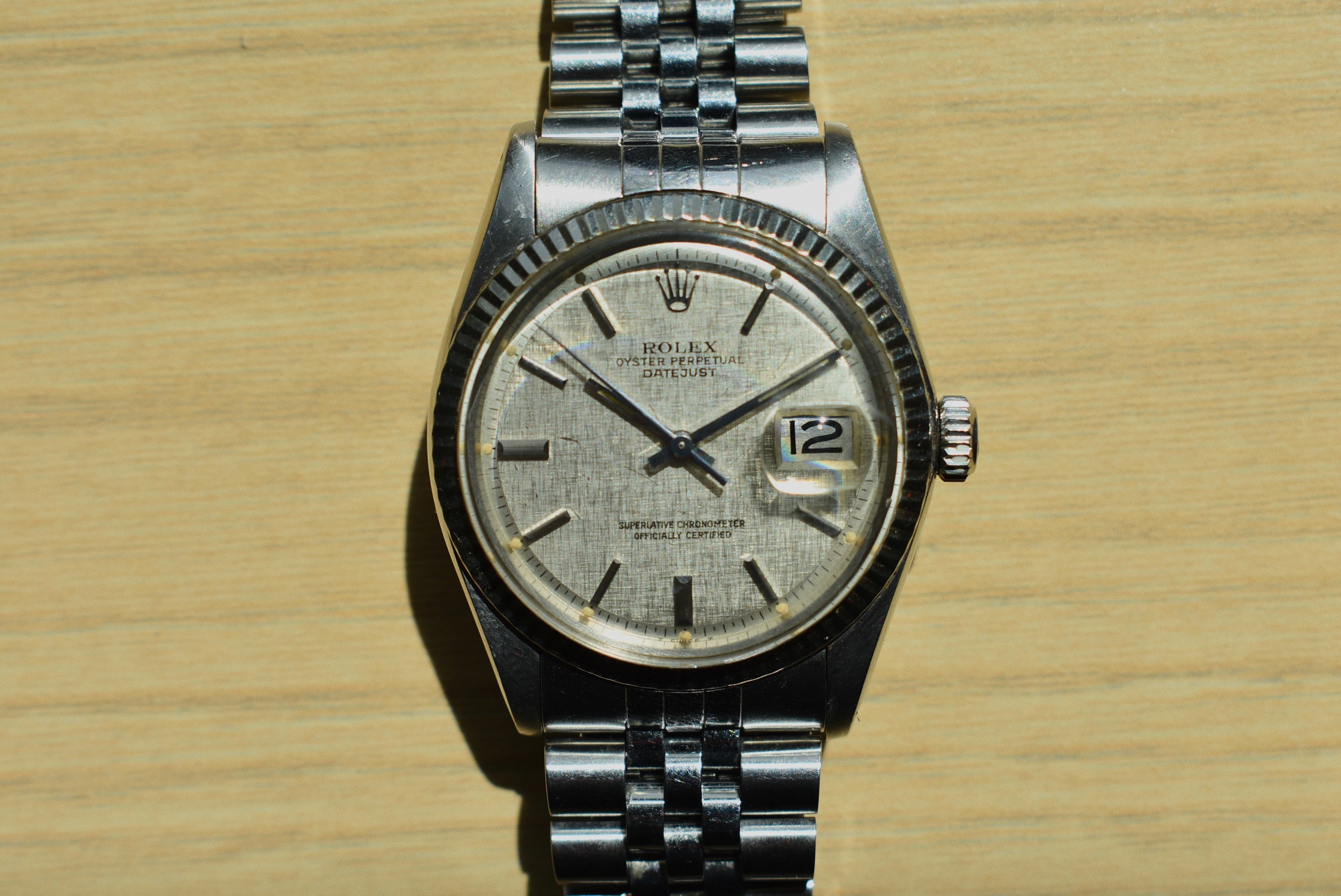 The beloved pie pan dial on the four digit Datejust will always be appreciated for its vintage charm. This feature a perfect linen dial on top of the pie pan style which makes it so much better. A fun fact, the pie pan linen dials catch the light so much better then the flat five digit Datejusts