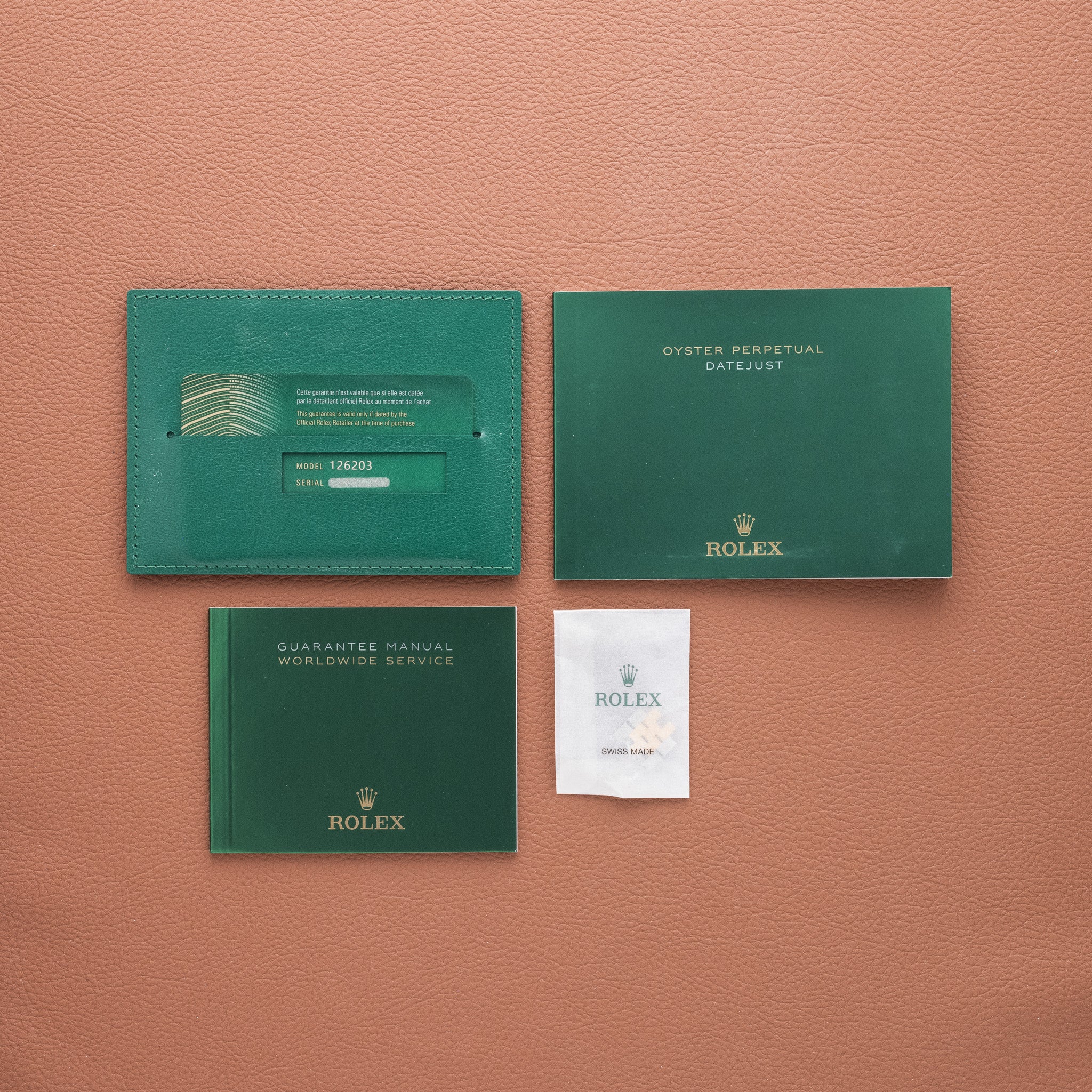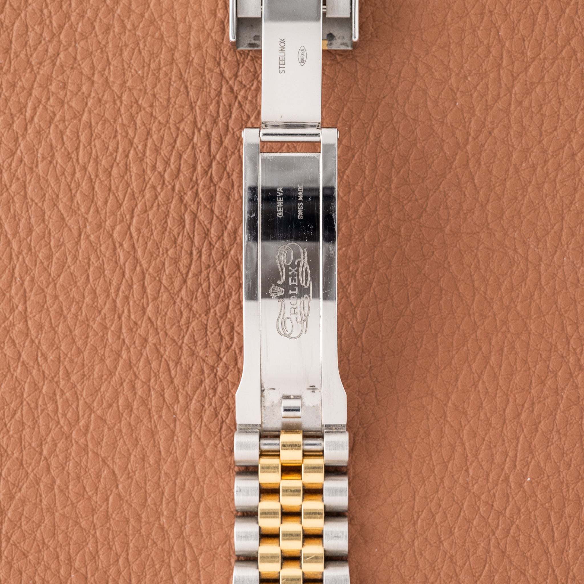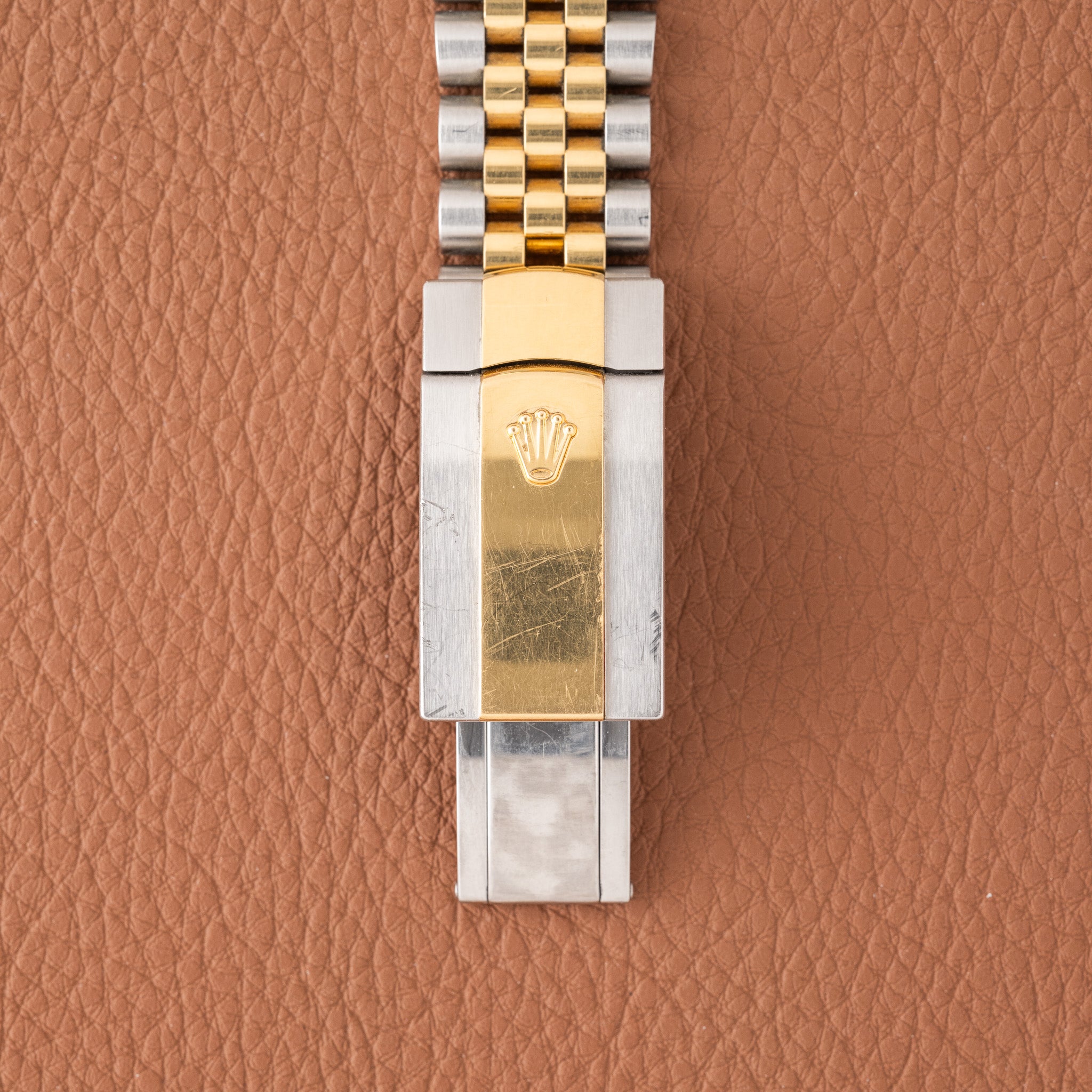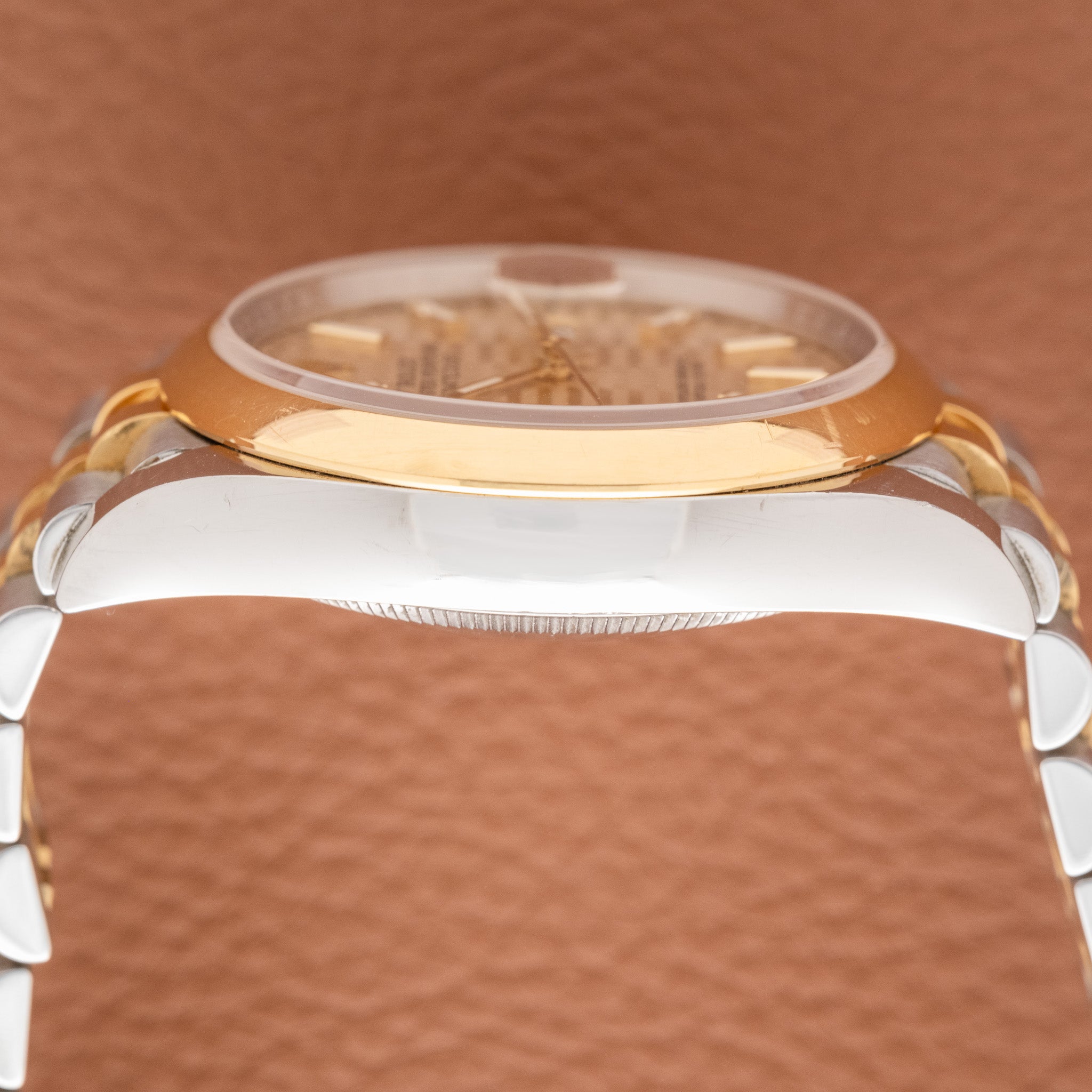 The ref. 126203 represents the modern evolution of the two-tone Datejust, pairing a smooth yellow-gold bezel with an Oystersteel case and an updated movement. While most two tone Datejusts are ordered with a fluted bezel, the smooth bezel configuration is less common and gives the watch a more contemporary feel. The champagne motif dial is also an uncommon variant within the current catalog, adding a distinctive texture that sets it apart from the traditional sunburst champagne tone. This example retains its original factory finish and shows honest wear from use.