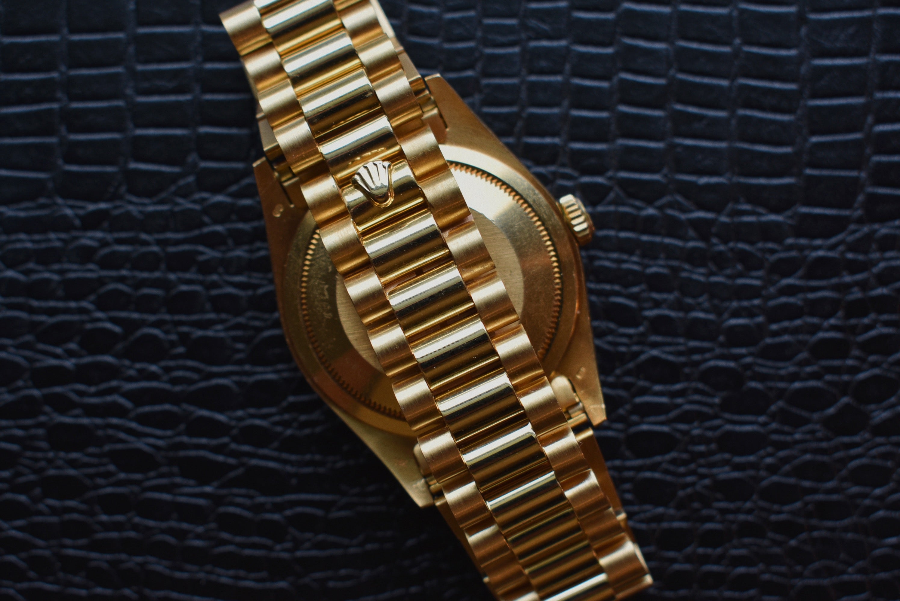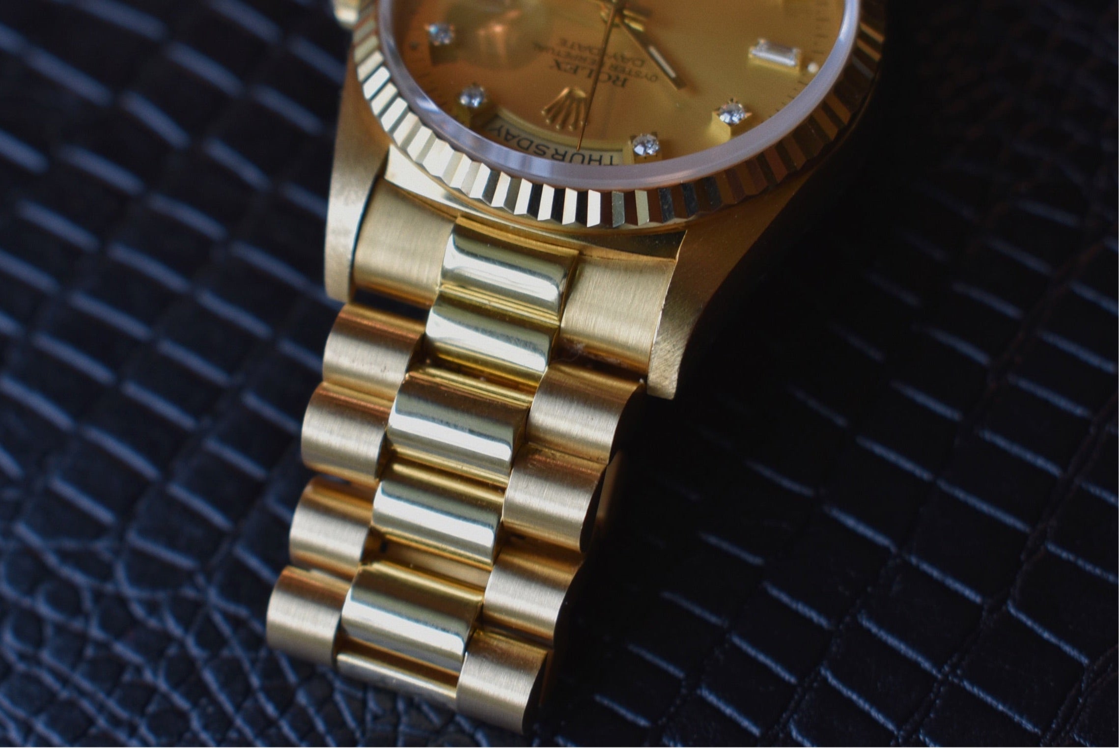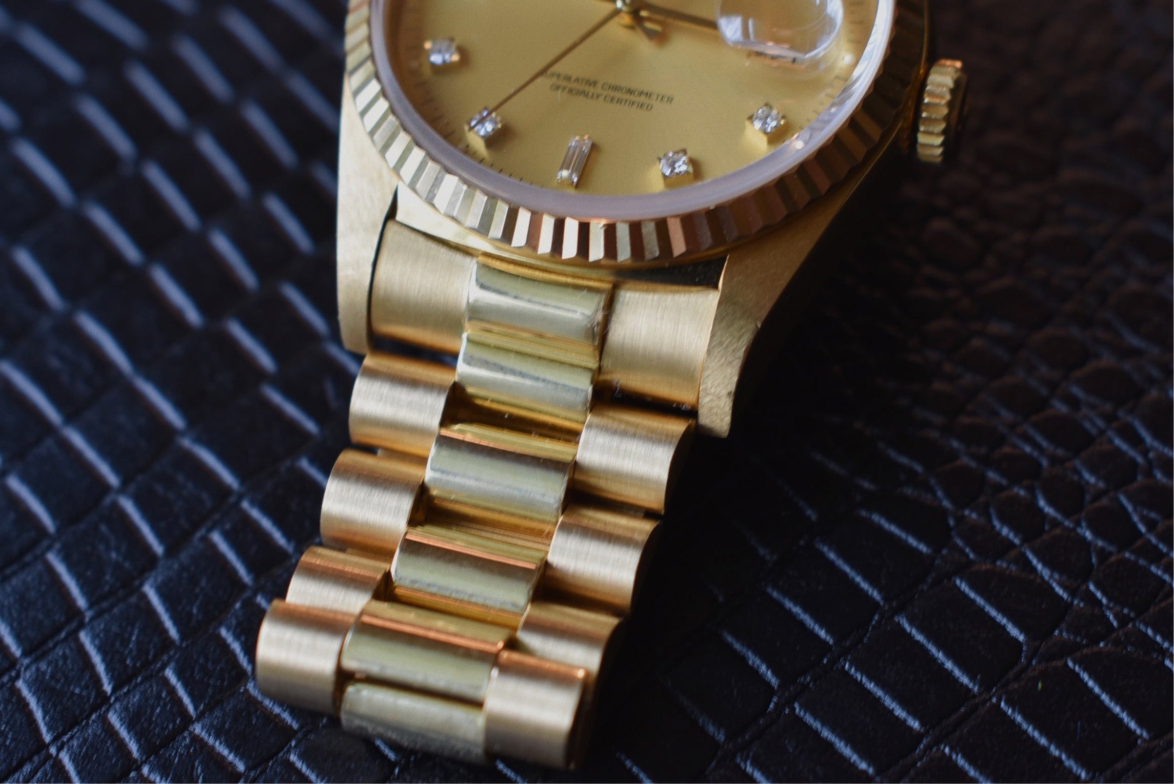 Even Tony Soprano didn’t have a DayDate this nice! Yes, he did have a beautiful Solid Gold Rolex but his didn’t come with a beautiful factory diamond dial like this one. The dial gives it a bit more pop, not like a solid gold Rolex needed more anyways.