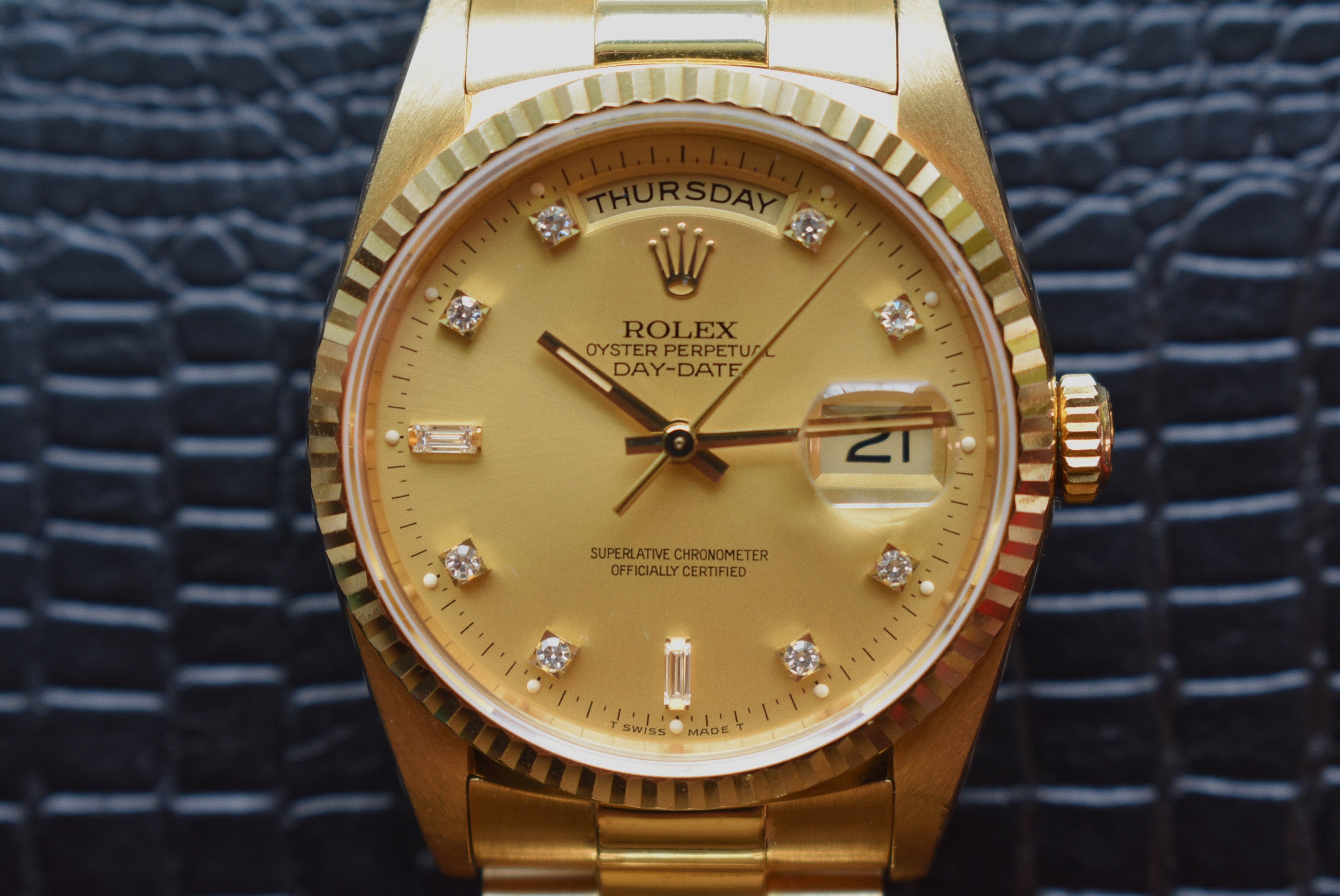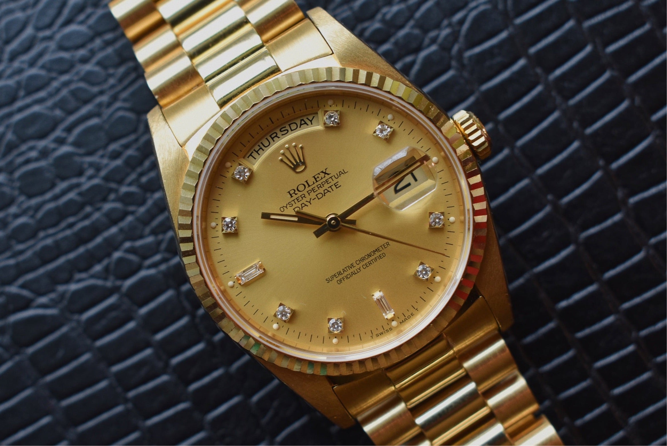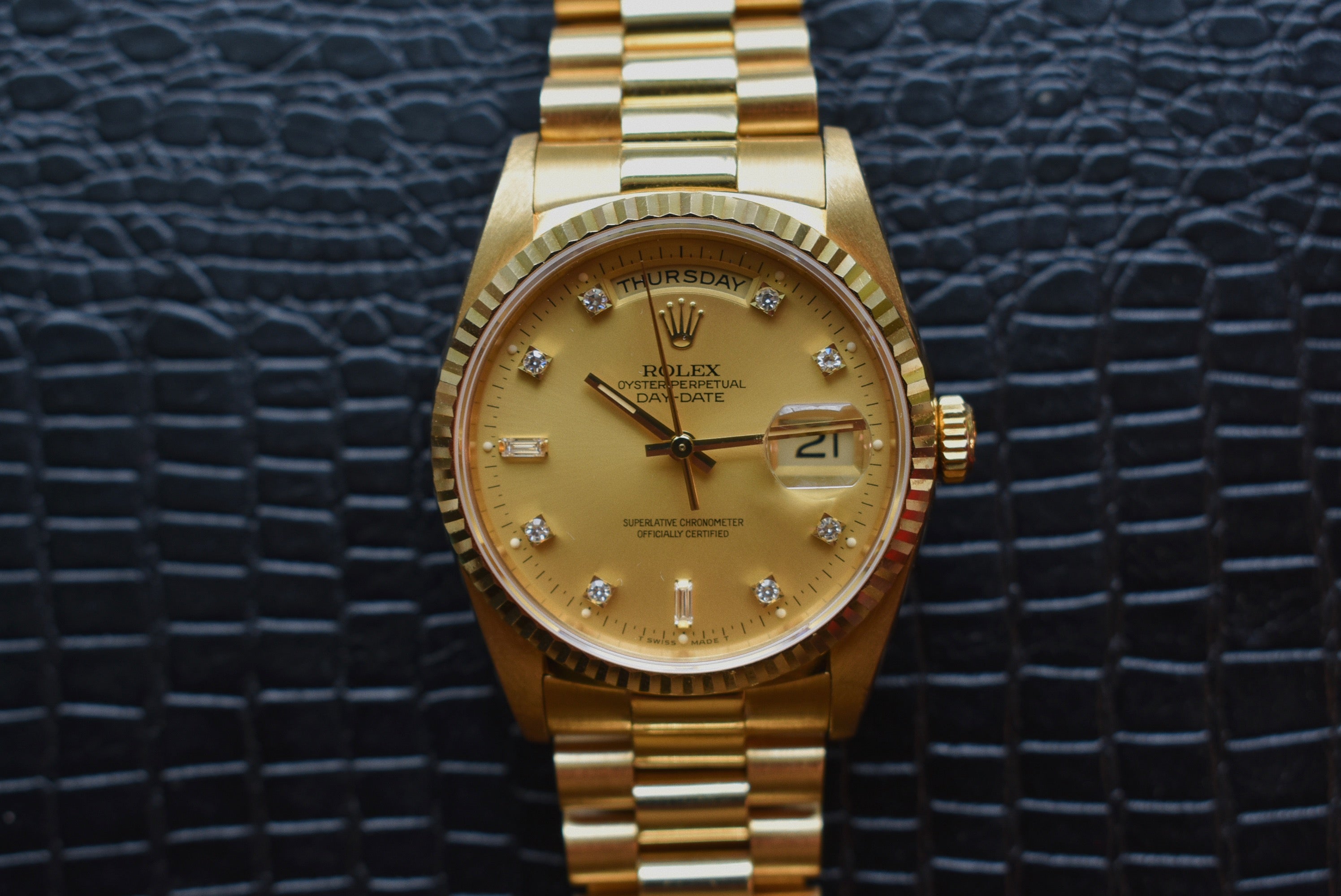 Even Tony Soprano didn’t have a DayDate this nice! Yes, he did have a beautiful Solid Gold Rolex but his didn’t come with a beautiful factory diamond dial like this one. The dial gives it a bit more pop, not like a solid gold Rolex needed more anyways.