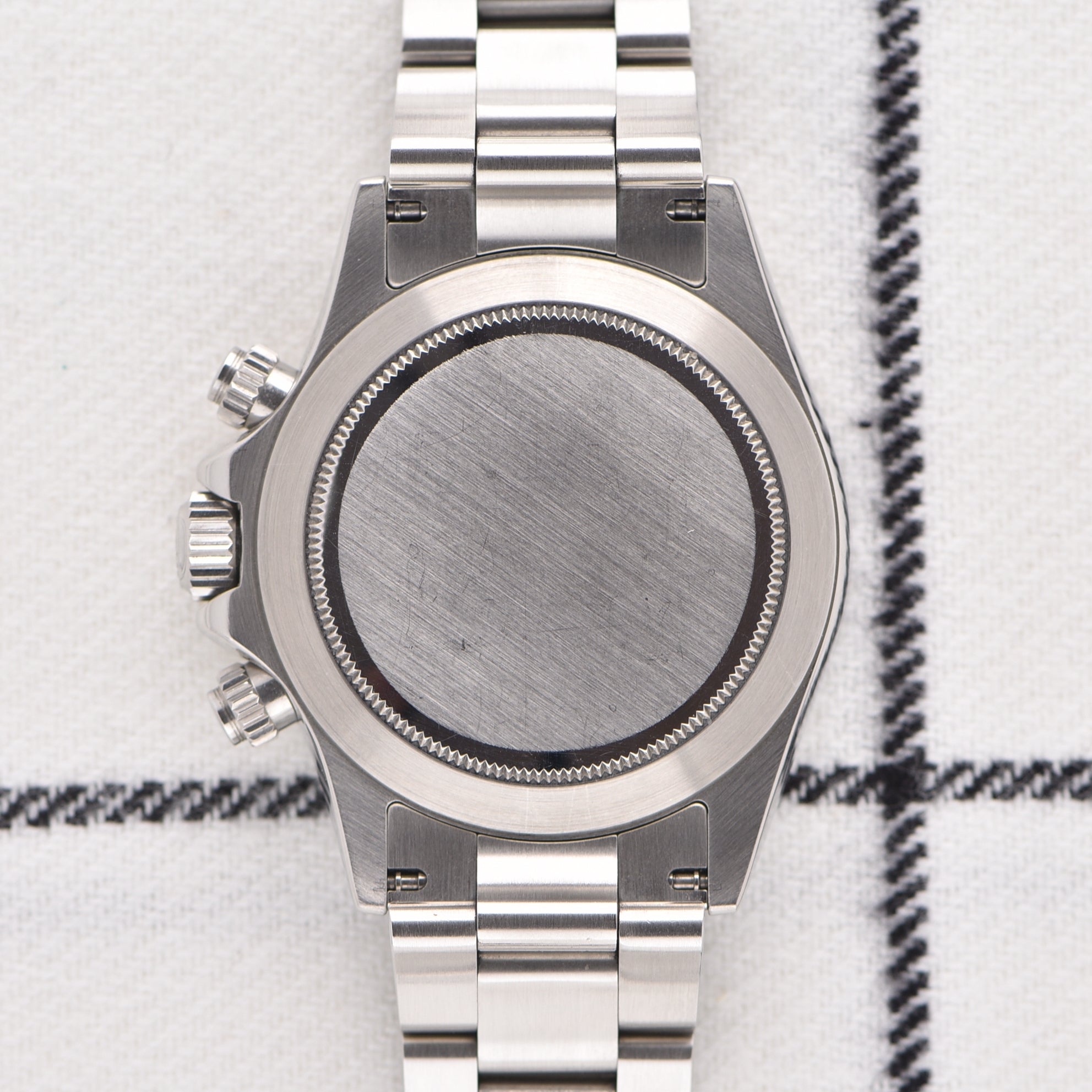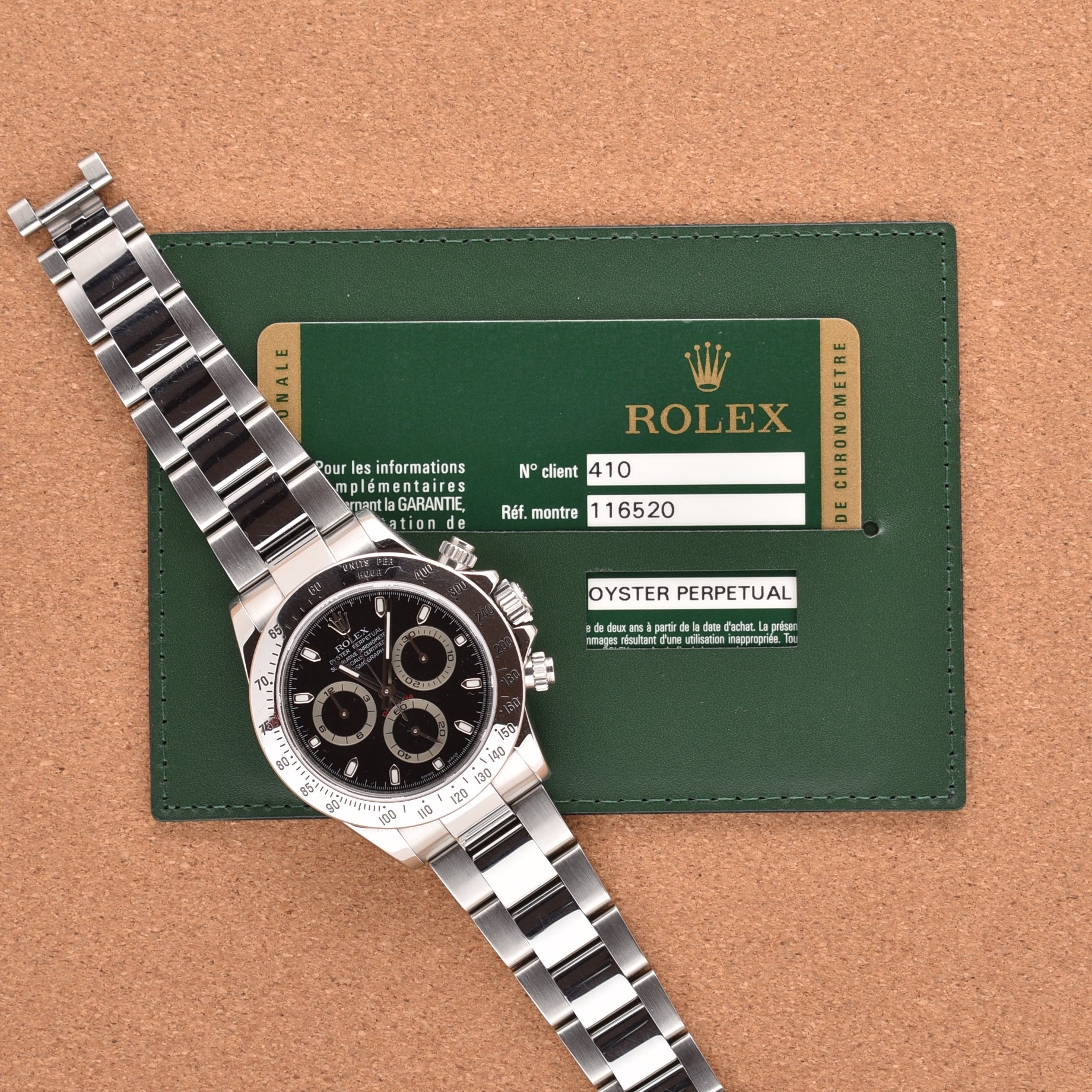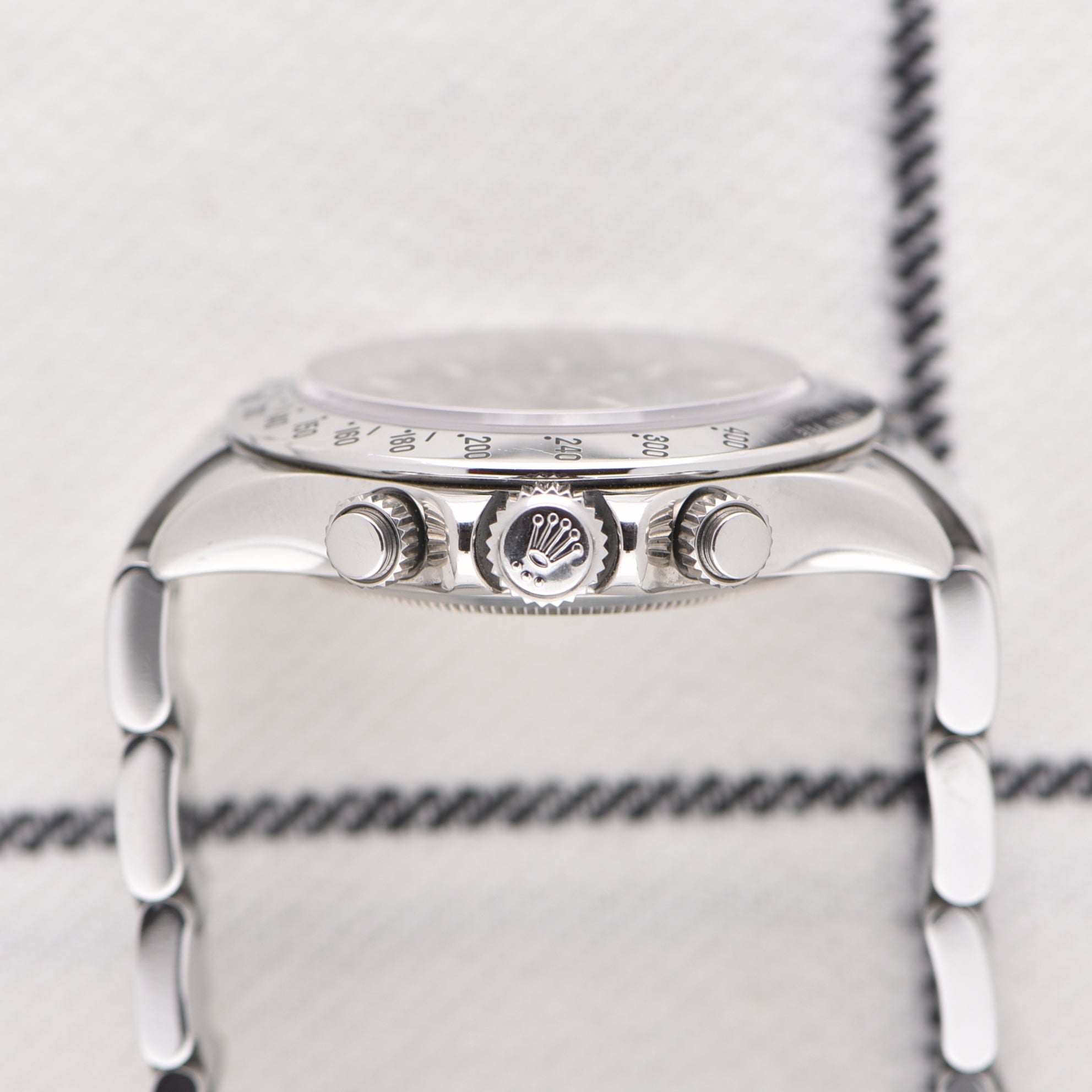 This, being the reference 116520, features a steel bezel and closer similarities to the Zenith Daytona. The example for sale comes with its original box and papers, with all the booklets and contents seen.