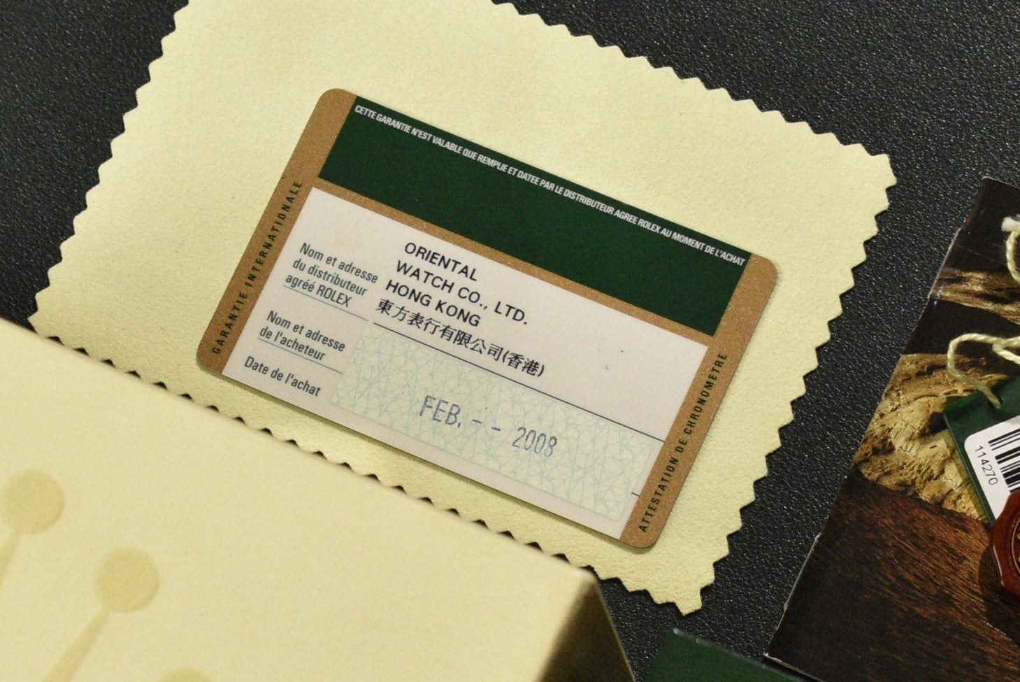 The case has nice thick lugs that look to be unpolished. The condition throughout is very honest and clean. With faint wear marks and a clean sapphire crystal, this is ready for anyone's wrist. The watch also has an engraved rehaut and comes complete with Box, papers, and a more uncommon warranty card for this reference.