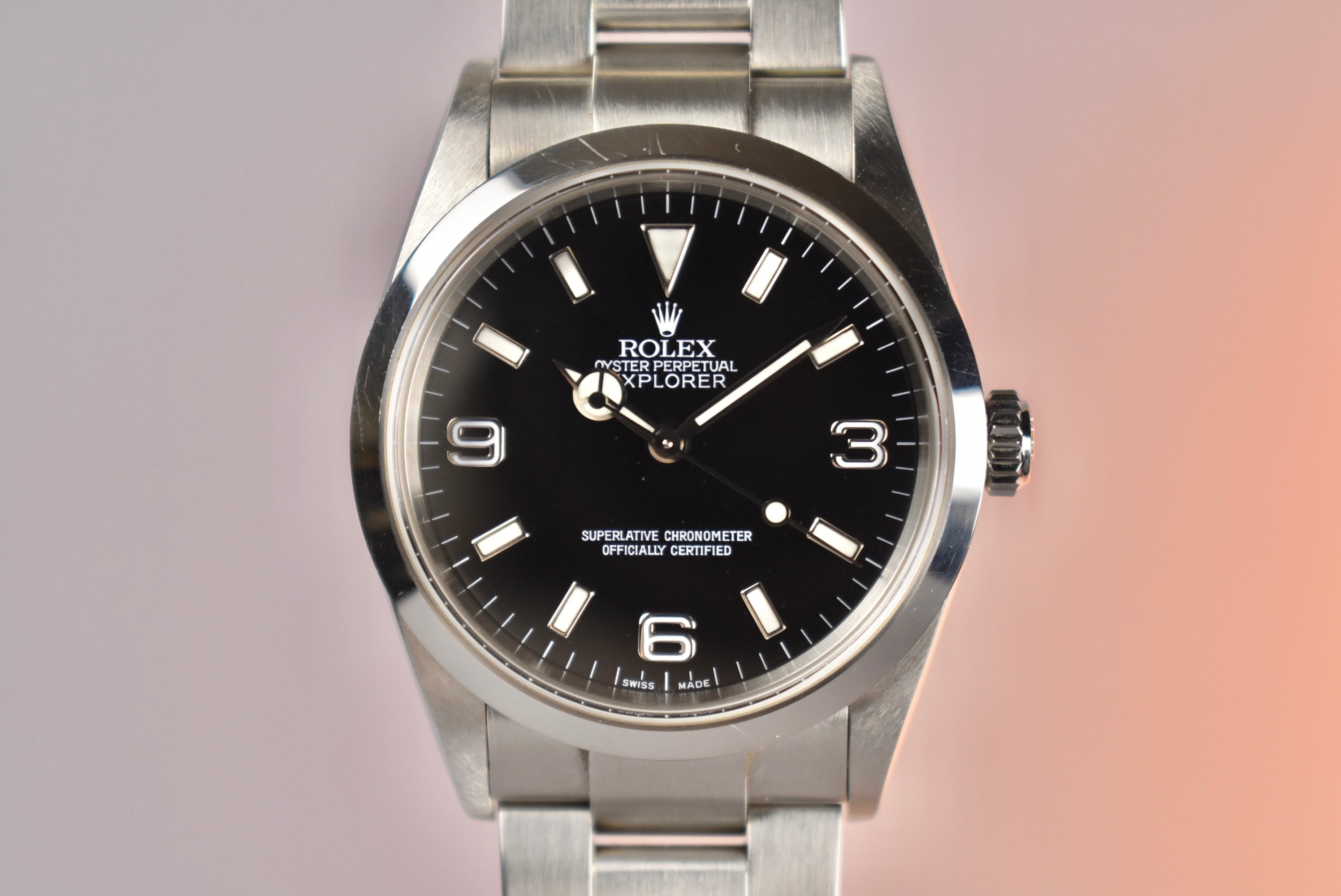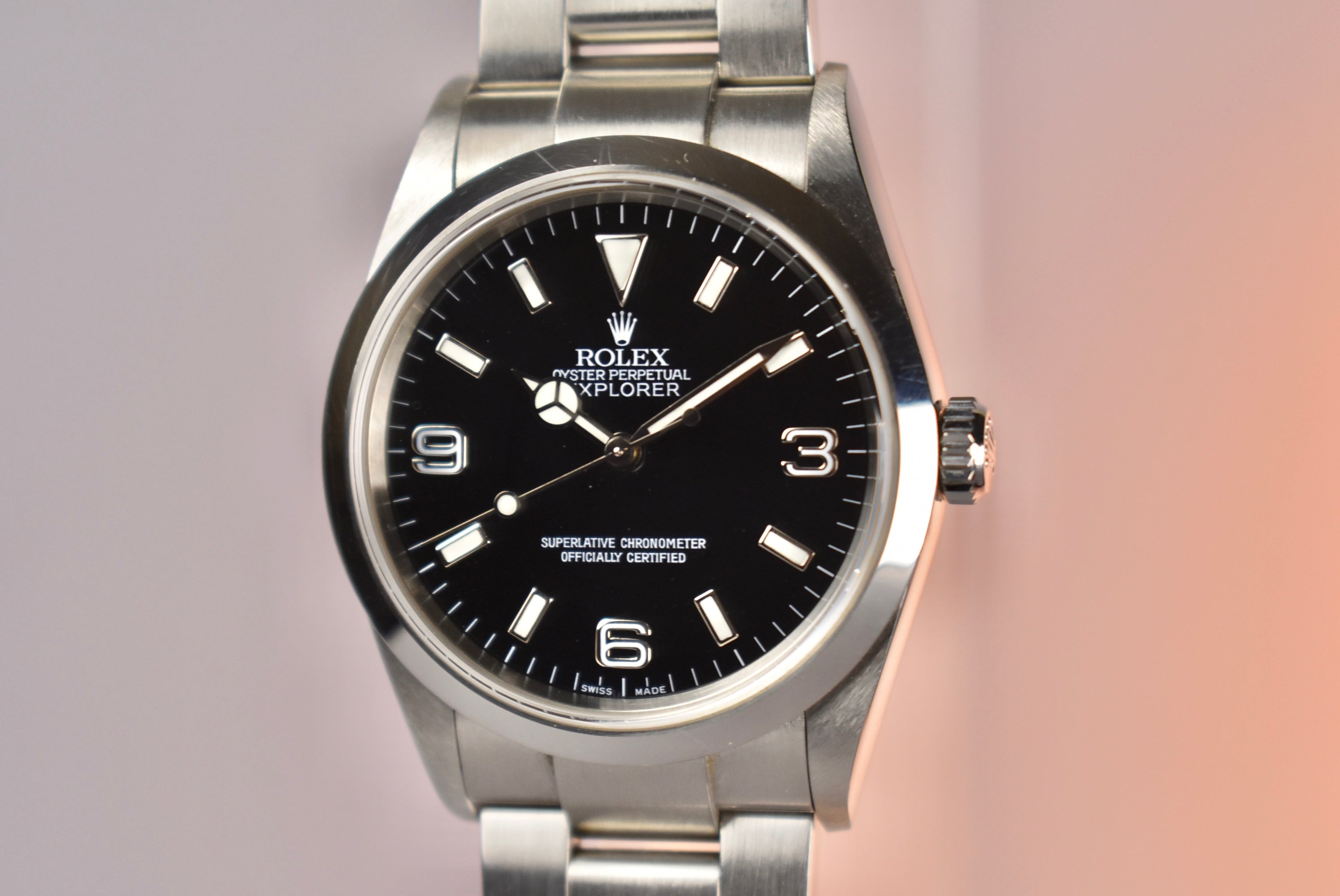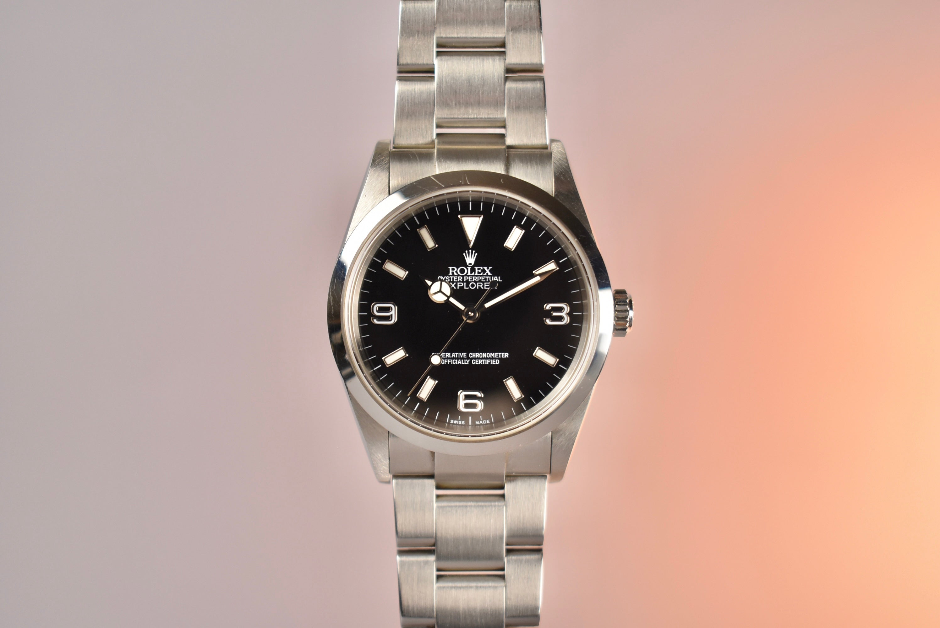 The Rolex Explorer is simple, but something about it feels so right when it’s on the wrist. Maybe its simplicity is so perfect that it feels just right. Whatever it is, all we know is we love it! A high gloss black dial that is easy to read, a smooth bezel, and its comfortable oyster bracelet make the Explorer 1 such an easy pick for a daily wearer. What we have here is a 114270 which means solid end links and a few slight changes. This example also comes with its complete set, from its papers to both of the original hangtags.