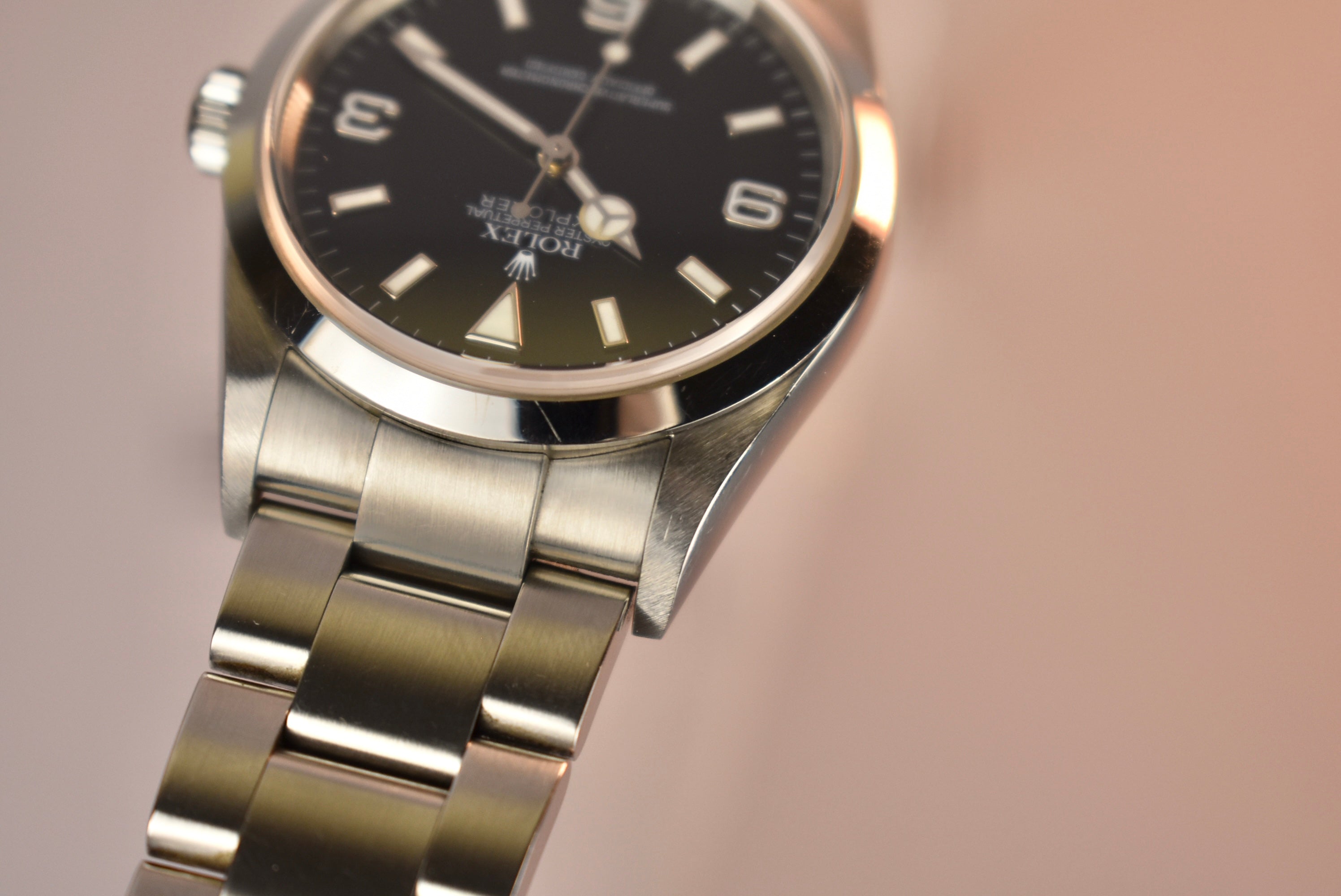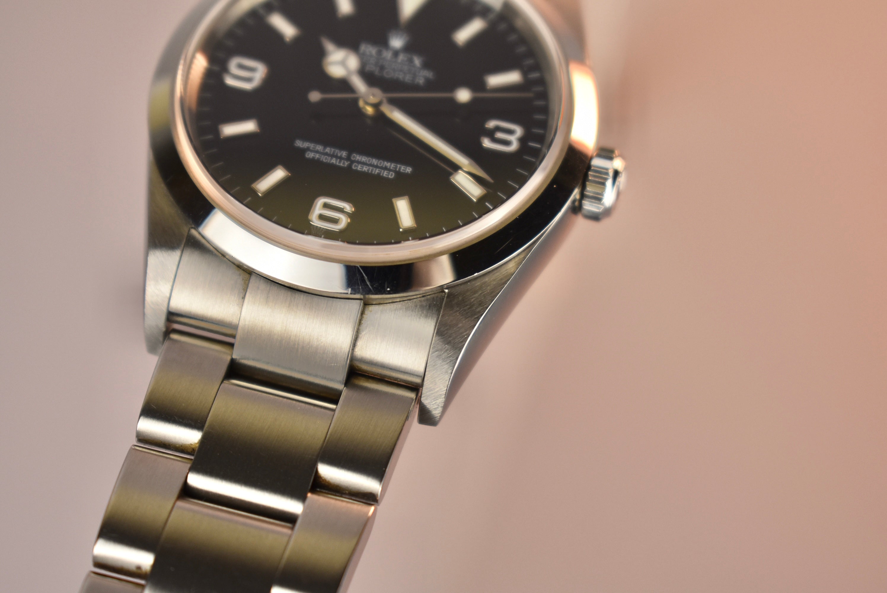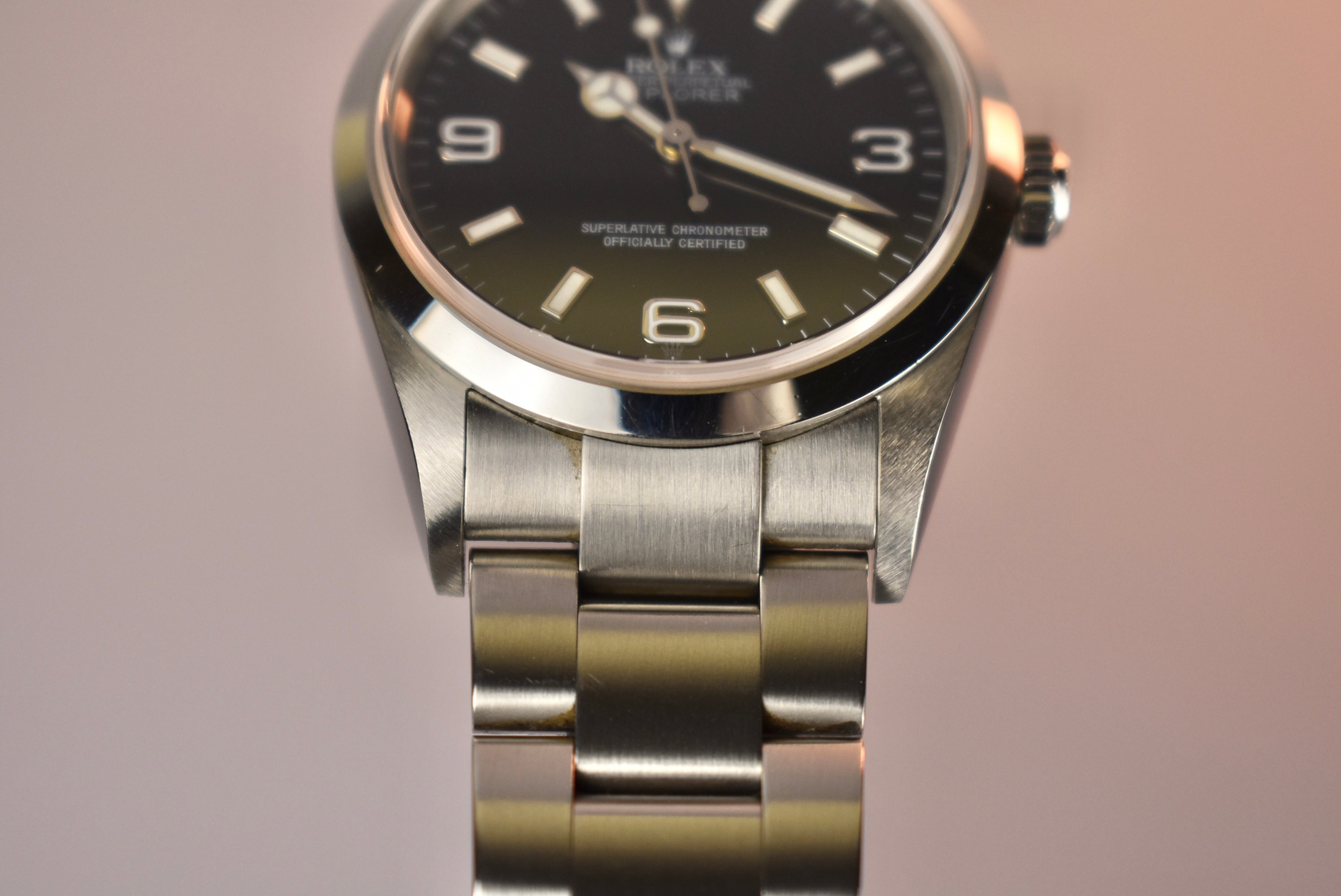 The Rolex Explorer is simple, but something about it feels so right when it’s on the wrist. Maybe its simplicity is so perfect that it feels just right. Whatever it is, all we know is we love it! A high gloss black dial that is easy to read, a smooth bezel, and its comfortable oyster bracelet make the Explorer 1 such an easy pick for a daily wearer. What we have here is a 114270 which means solid end links and a few slight changes. This example also comes with its complete set, from its papers to both of the original hangtags.