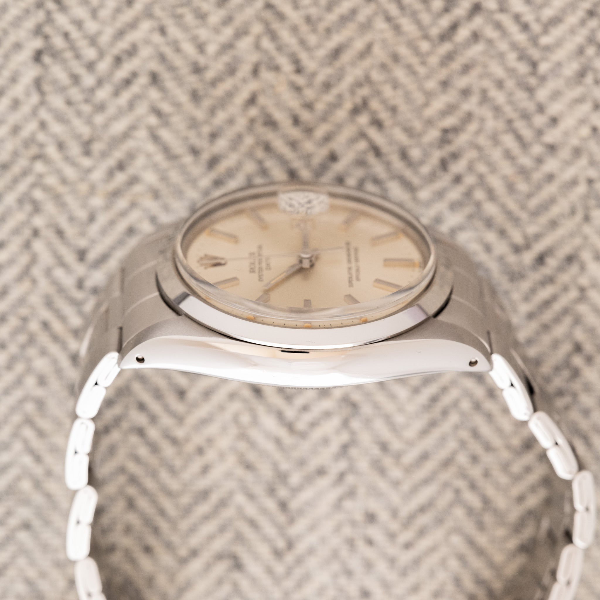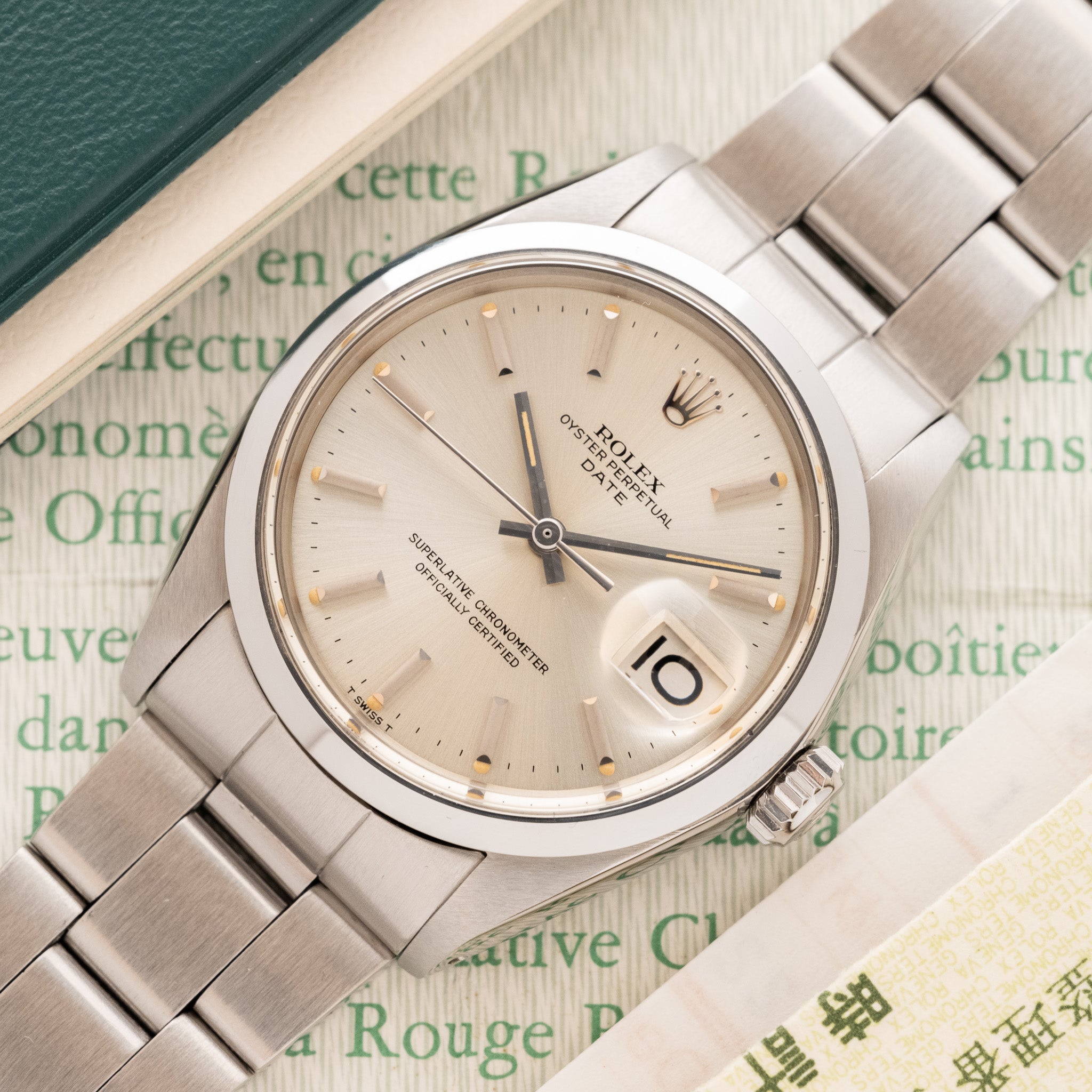 The key features of the Rolex Date 1500 include its slightly smaller case, which measures 34mm, similar to the Air-King and Oyster Perpetual models produced at that time. The Oyster case of the reference 1500 Rolex Date offers the same legendary water resistance as Rolex watches, achieved through a screw-down crown and case-back.