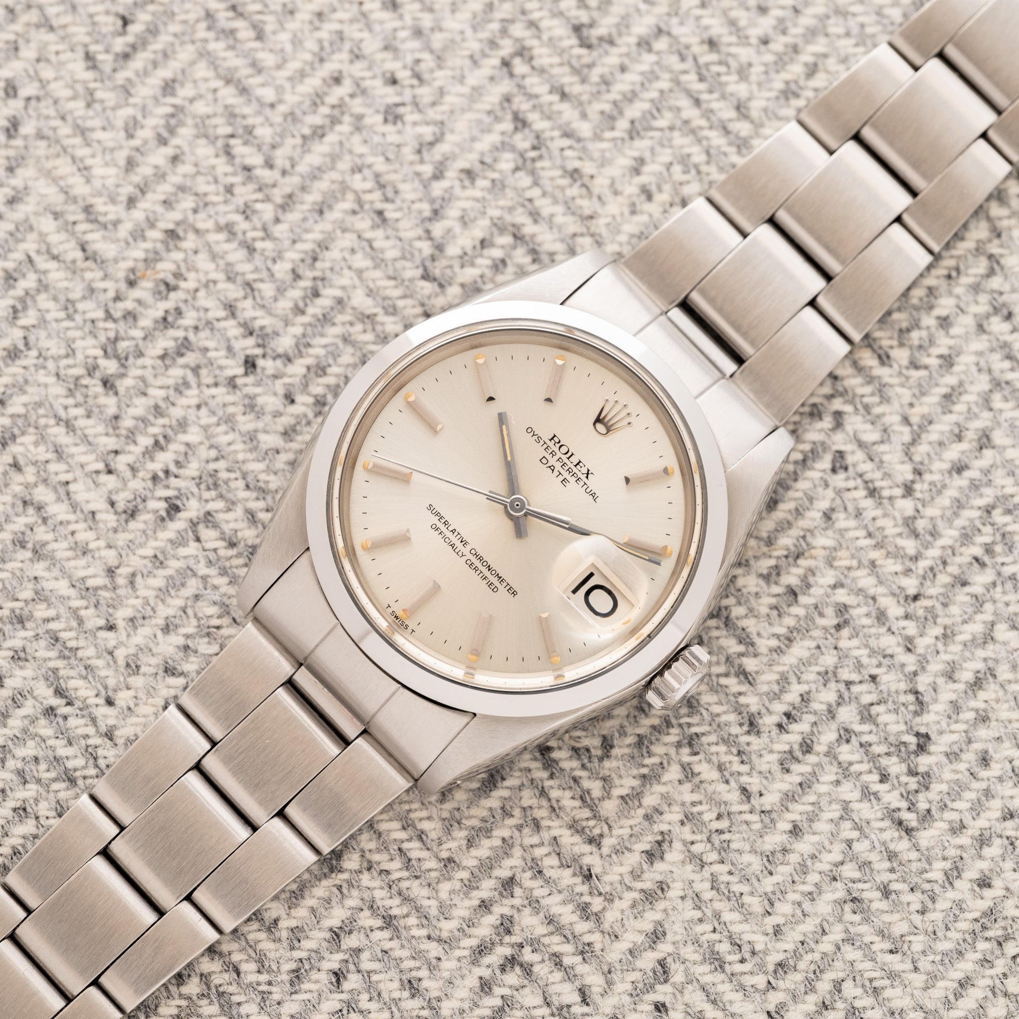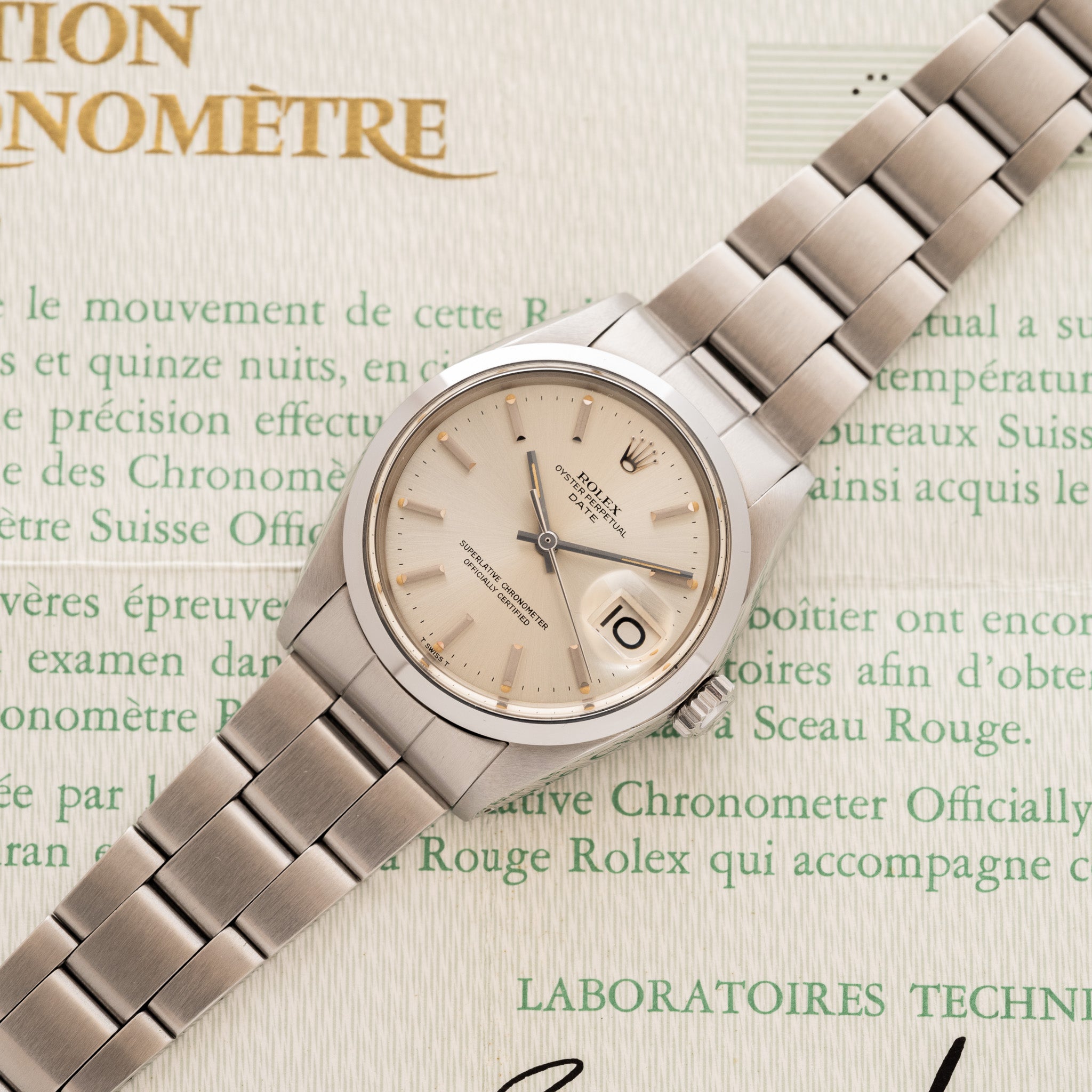 The 1500 is a chronometer-certified Perpetual movement, designed and manufactured in-house by Rolex and tested by the Official Swiss Chronometer Testing Institute (COSC). It can be powered by the Caliber 1565 or 1575 movements, with the latter offering a higher frequency and longer power reserve. Both Caliber 1565 and 1575 are COSC-certified chronometers, offering nearly identical real-world timekeeping performance. The movements are engraved with either "1560" or "1570" as they are date-displaying versions of the Caliber 1560 and Caliber 1570. The classic configuration for the reference 1500 is paired with the brand's signature three-link Oyster bracelet, but the dressier 5-link Jubilee bracelet is also available. The Rolex Date has a case that measures 2mm smaller than the standard-size Datejust, but the two watches have different lug width measurements and bracelets.