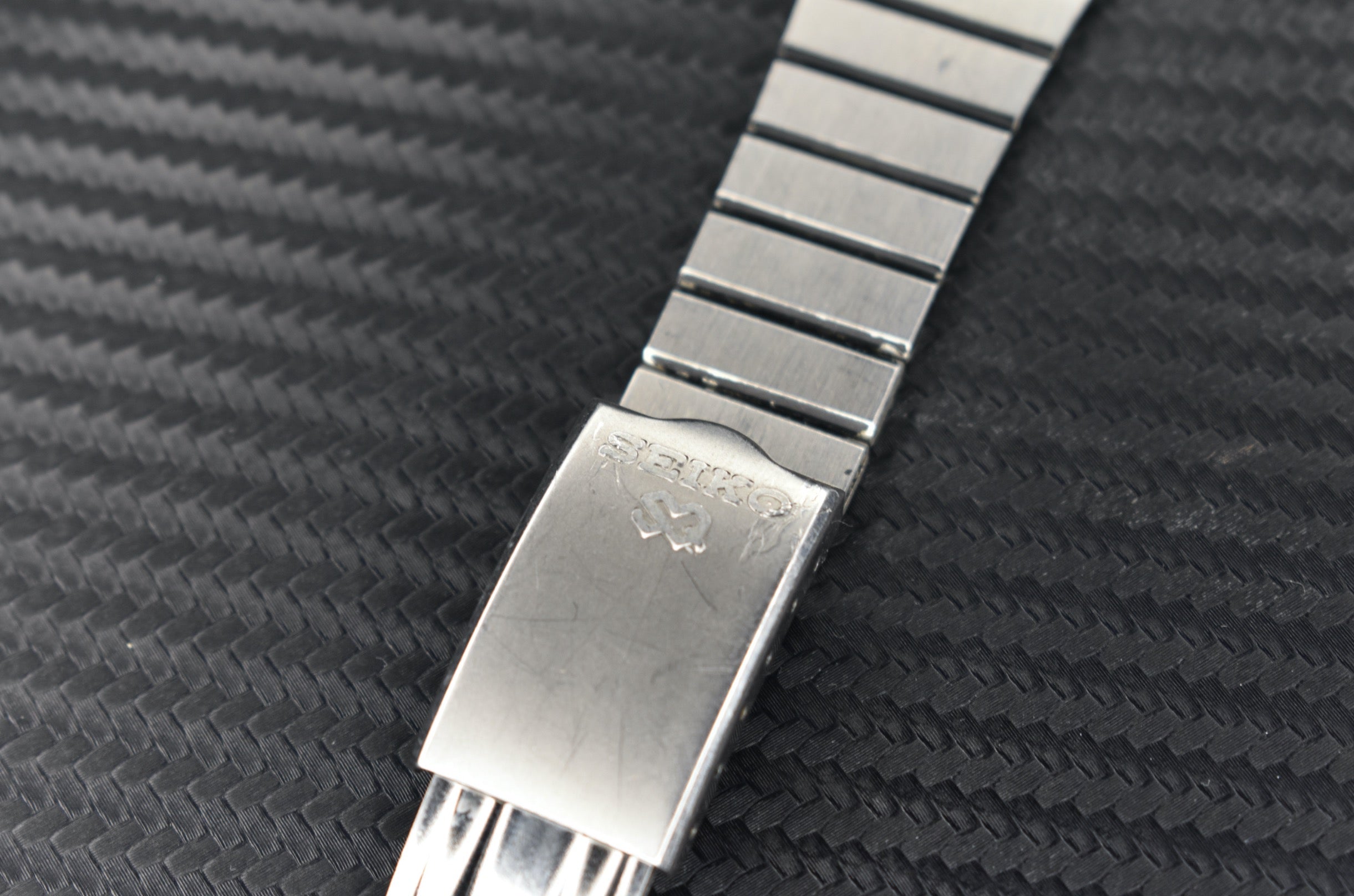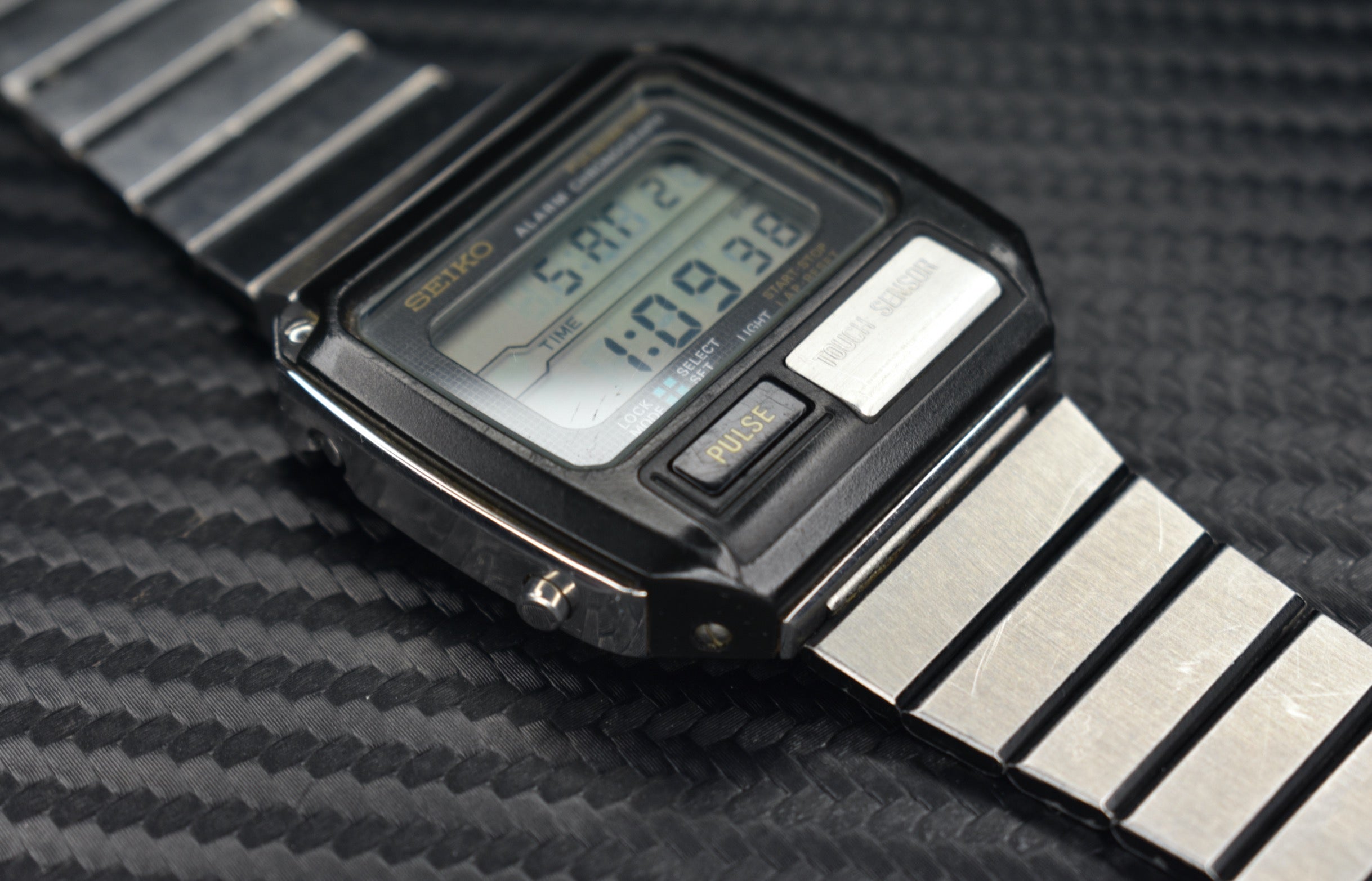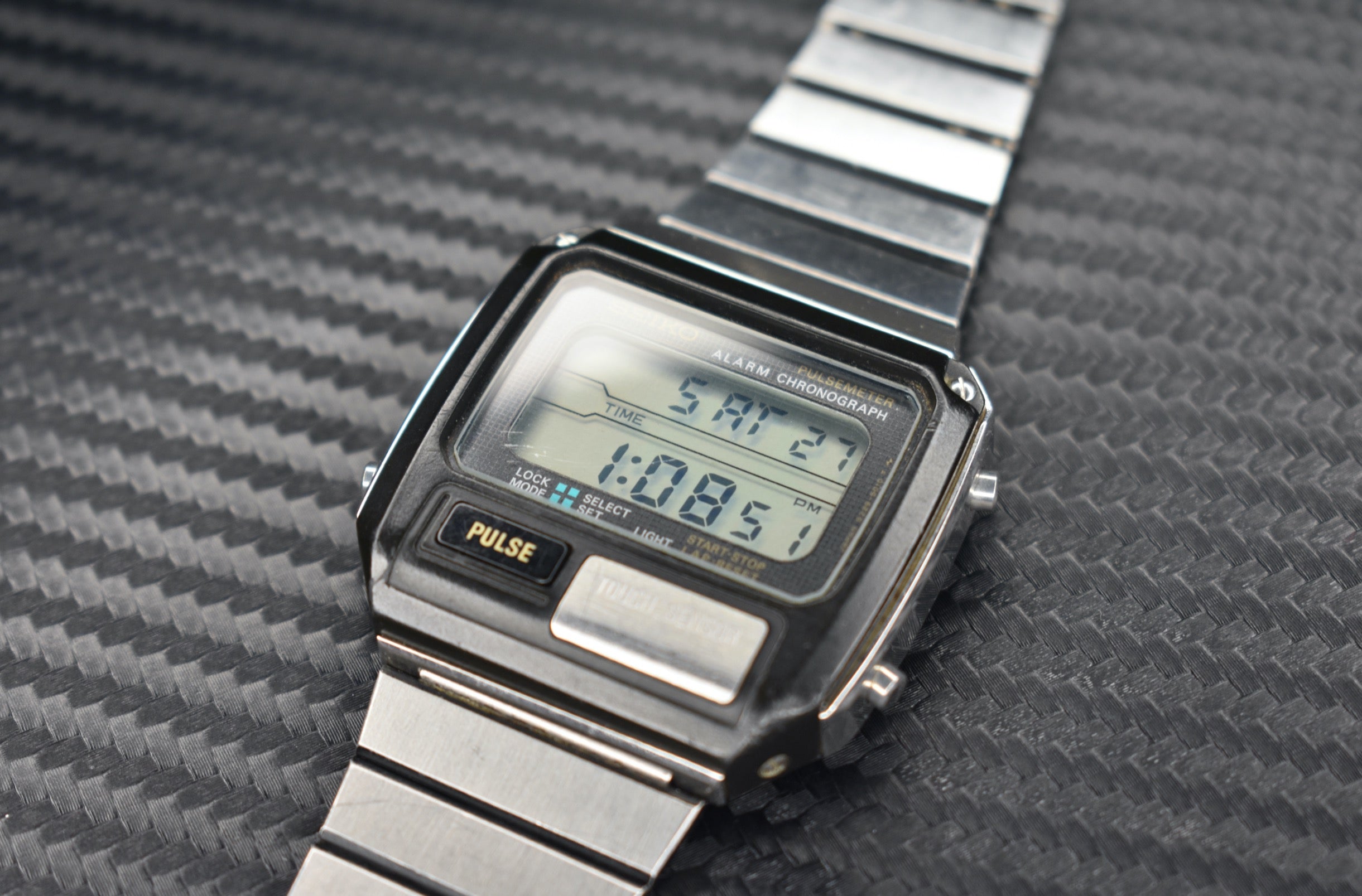 This is the very cool and rare vintage Seiko Pulse Sensor Digital watch. The watch case measures a reasonable 37mm, excluding the pushers. Please note that the pulse checking function is 1980‘s technology. The pulse is determined via electrical impulses, with the current path being between your fingertip and the skin of your wrist. The watch comes with its original bracelet and is running fine including its backlight LED.