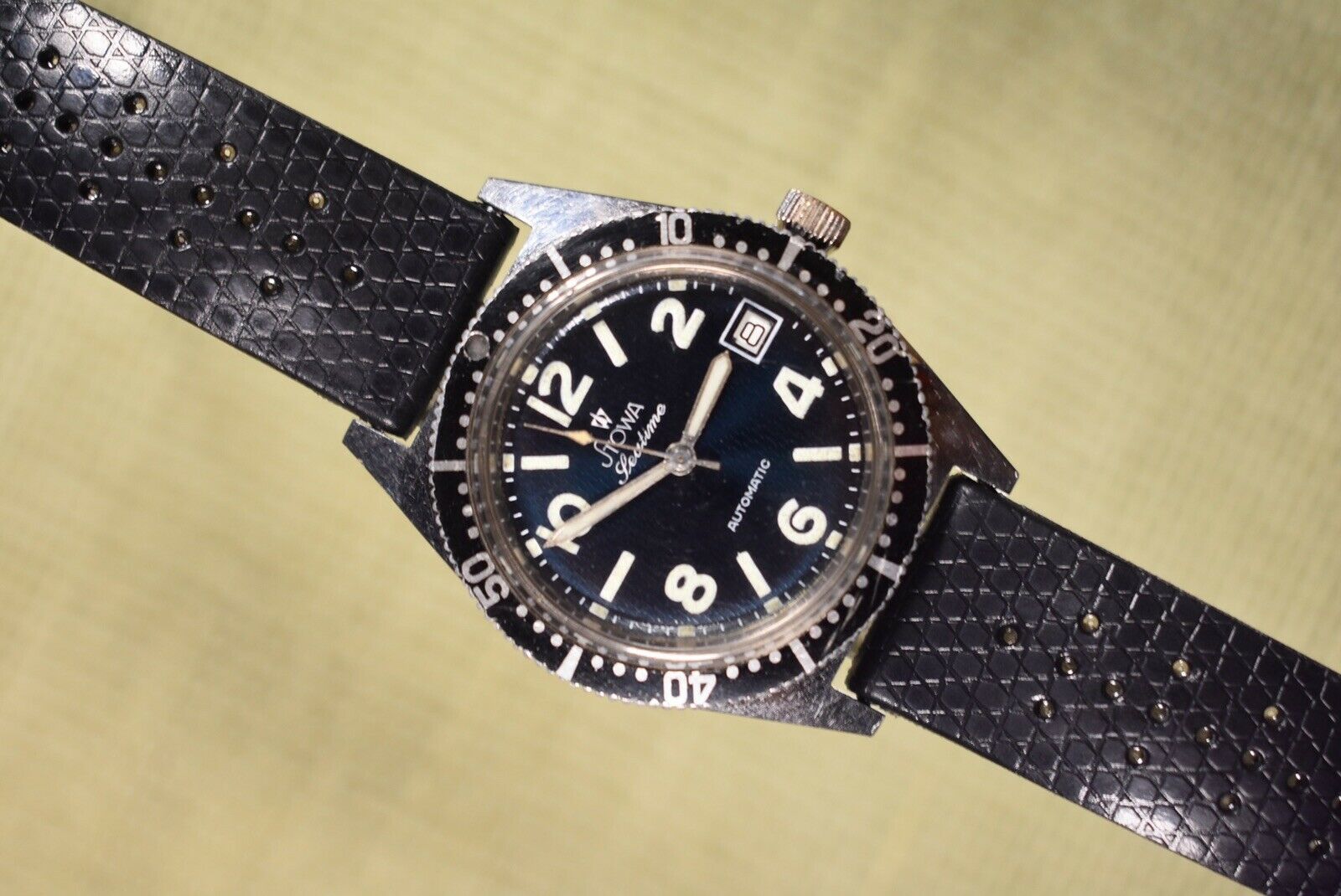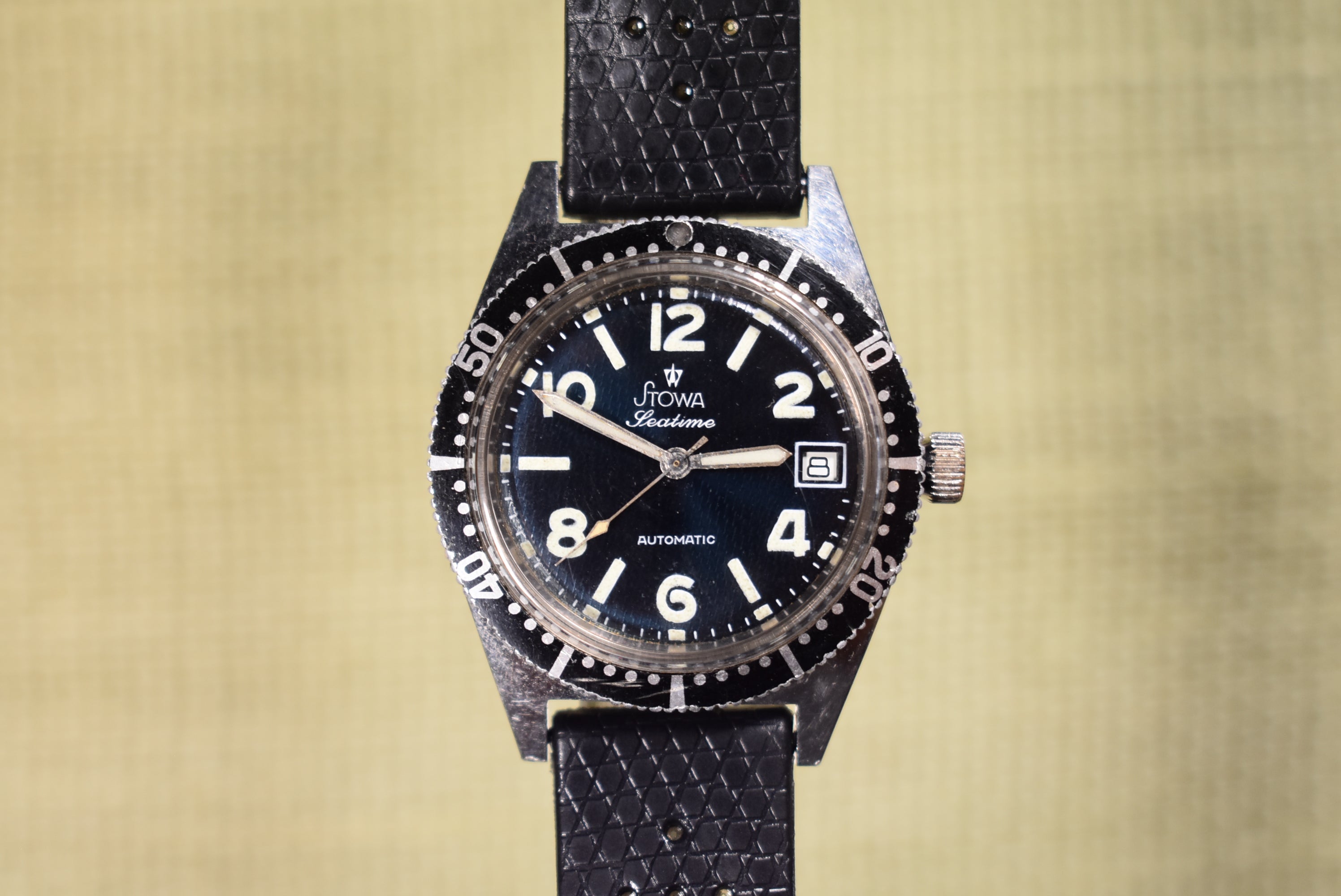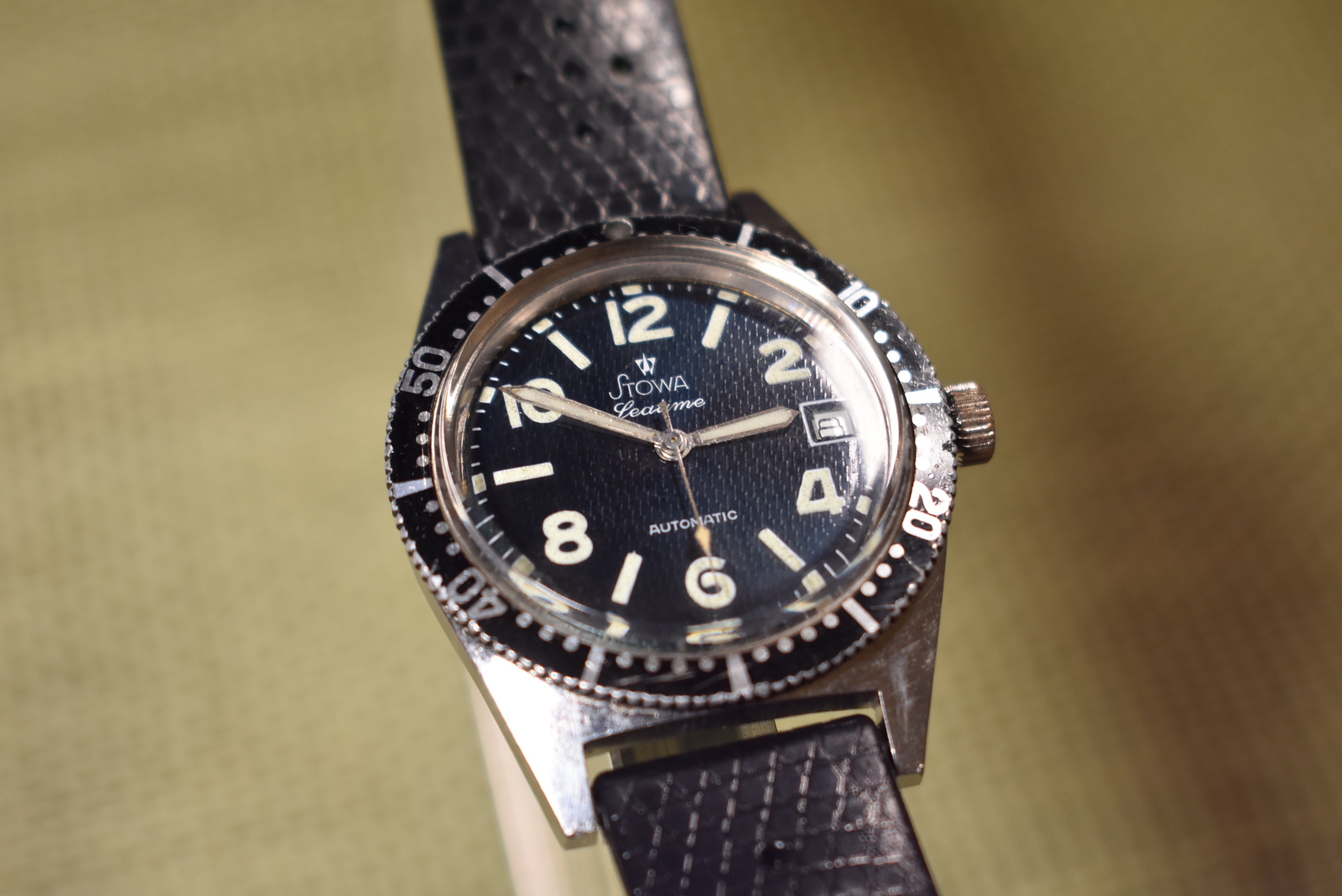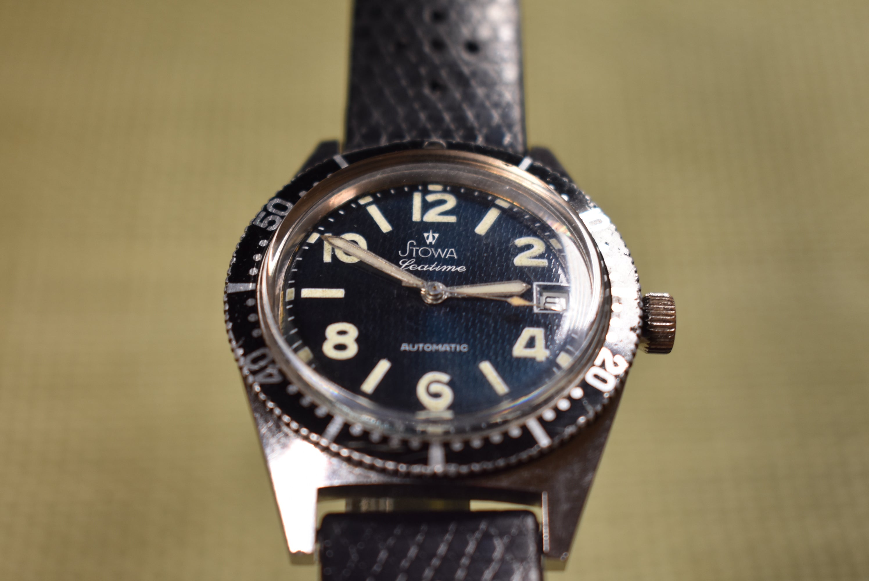 This is a stunning Stowa Seatime with a very rare green textured dial. The watch has been serviced previously and is running and keeping good time. The watch is a true stunner and deserves to be seen in person. In good light, the dial turns into vibrant emerald green. The dial also has a very unique texture to it with a very uncommon pattern. The watch sits on a very comfortable tropic strap and it really ties the piece together. The large hour markers and faded lume gives this piece a real tool watch feel and even a slightly military look to it.