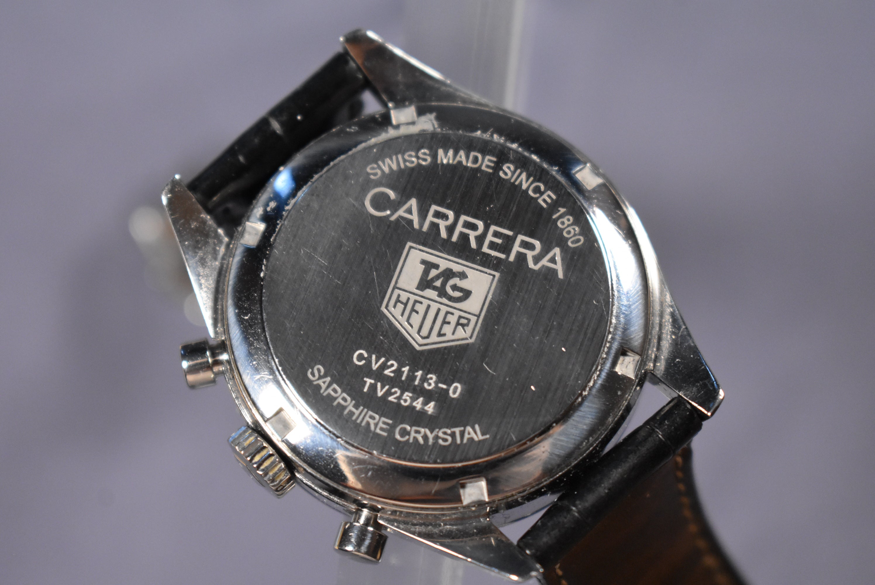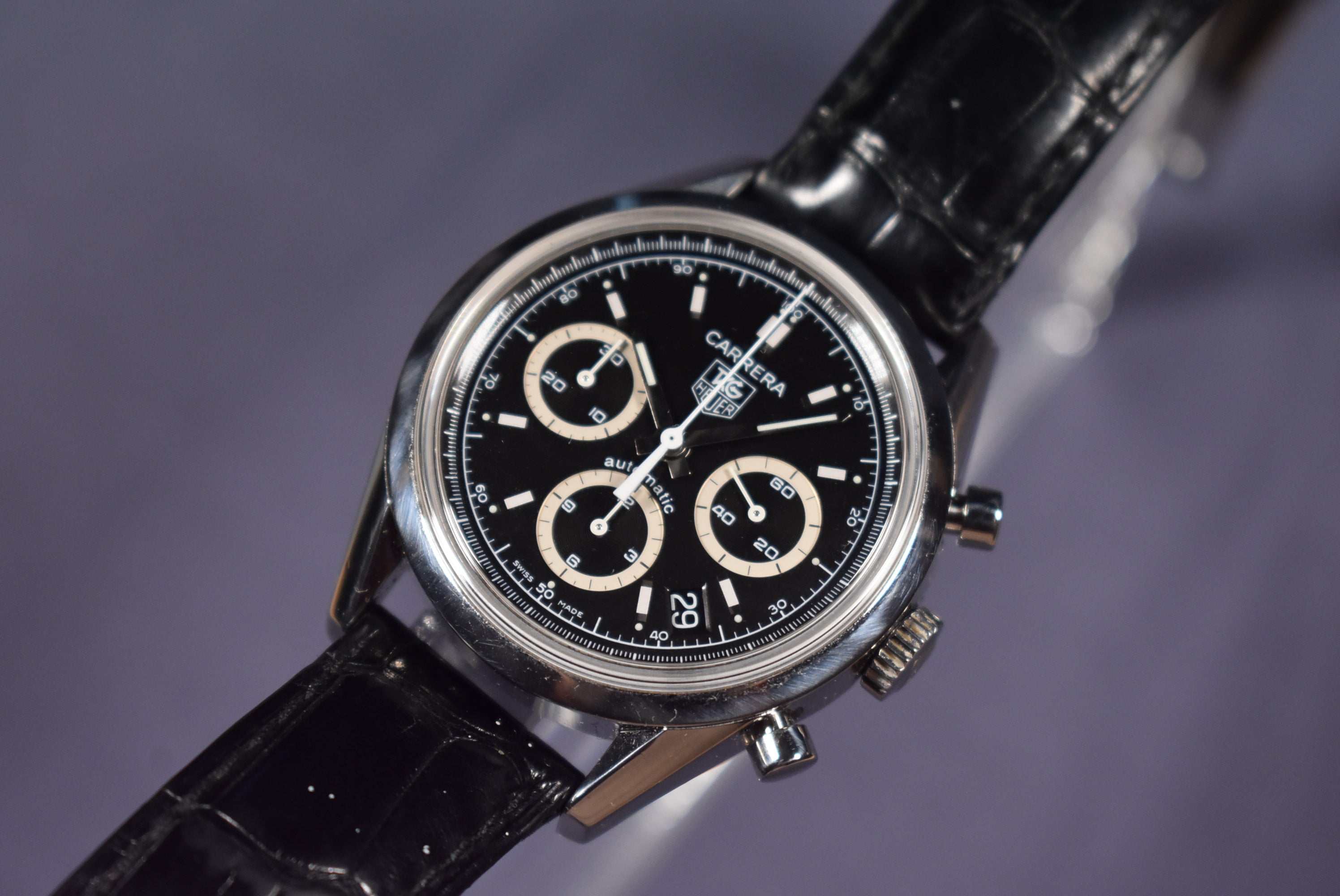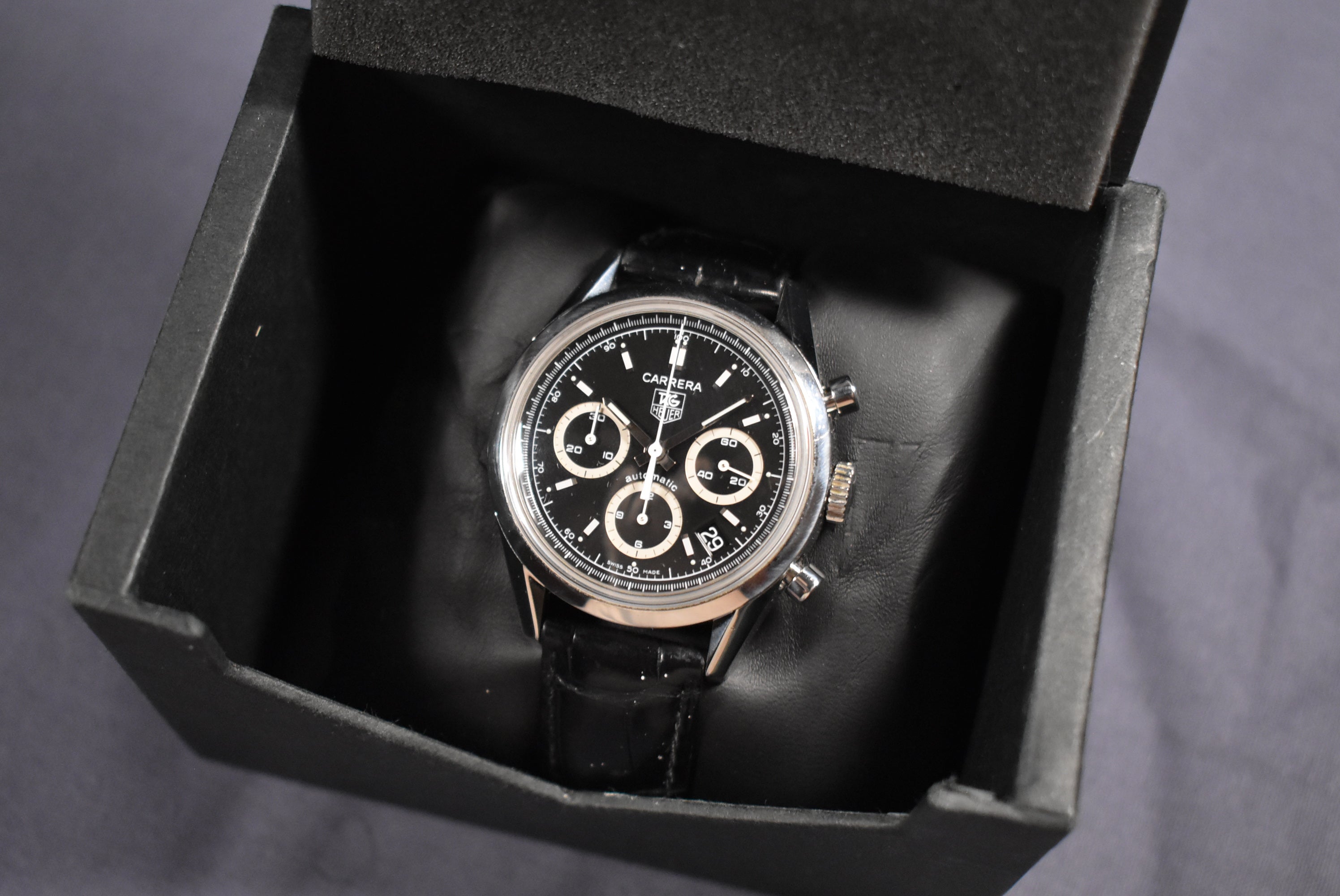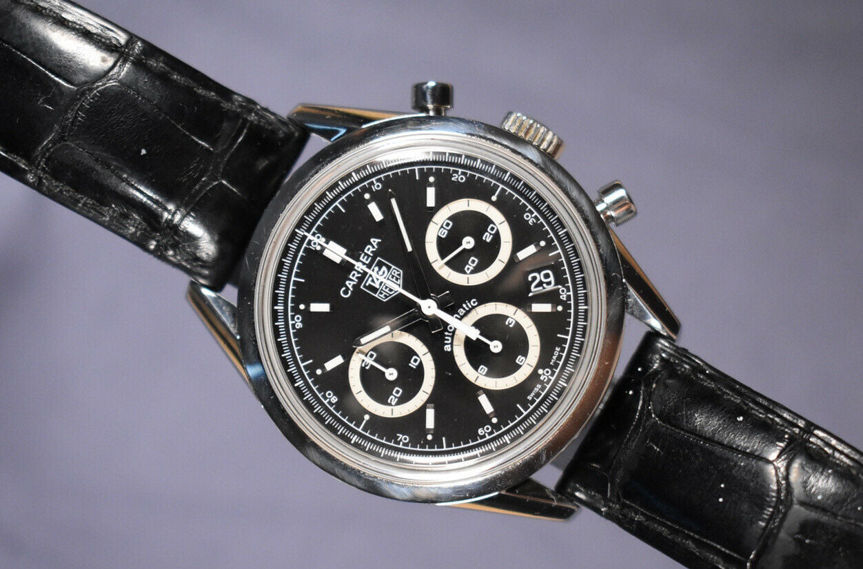 This stunning Tag Heuer features an automatic chronograph movement. The watch just came from a $650 overhaul and is running great. The watch still features it’s original strap but does have wear to it, however, the watch itself is in great condition. The watch comes with its service box and original warranty card. The reference on this model is CV2113-0.