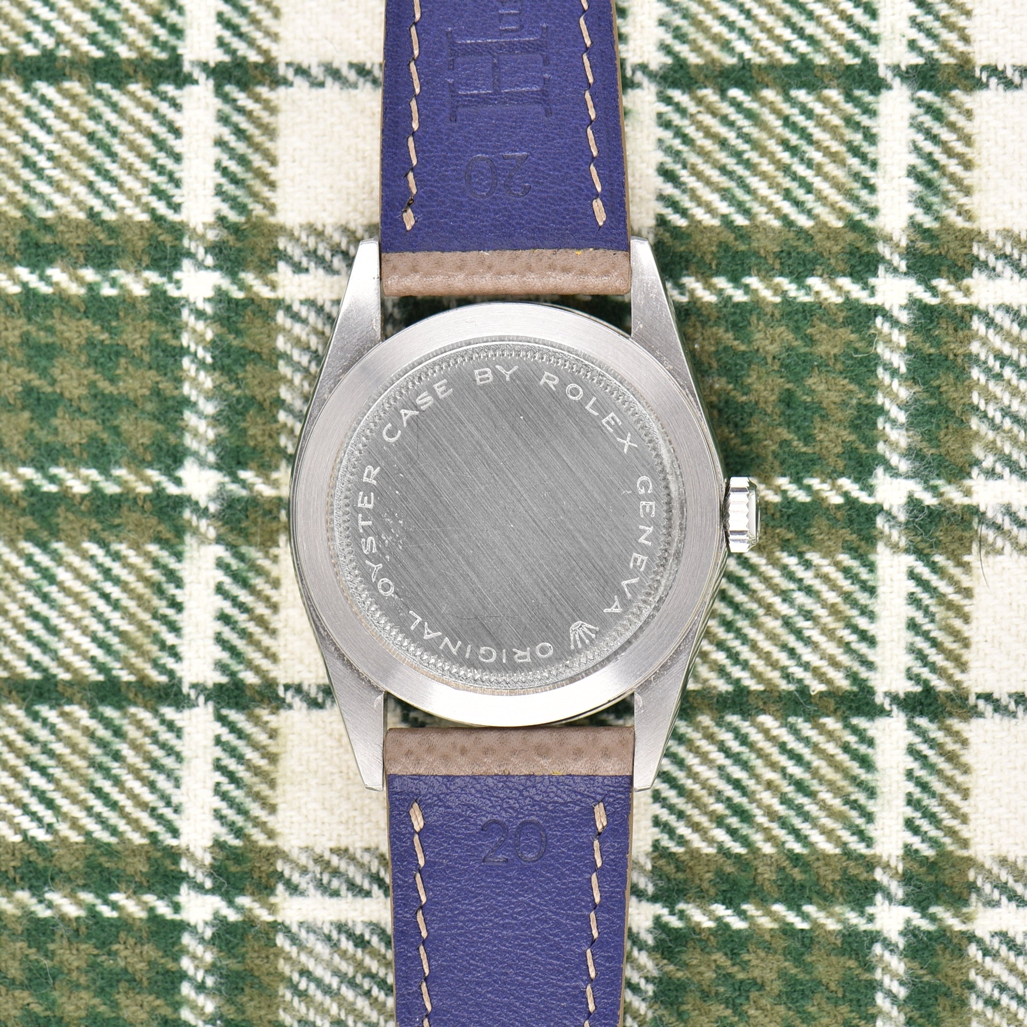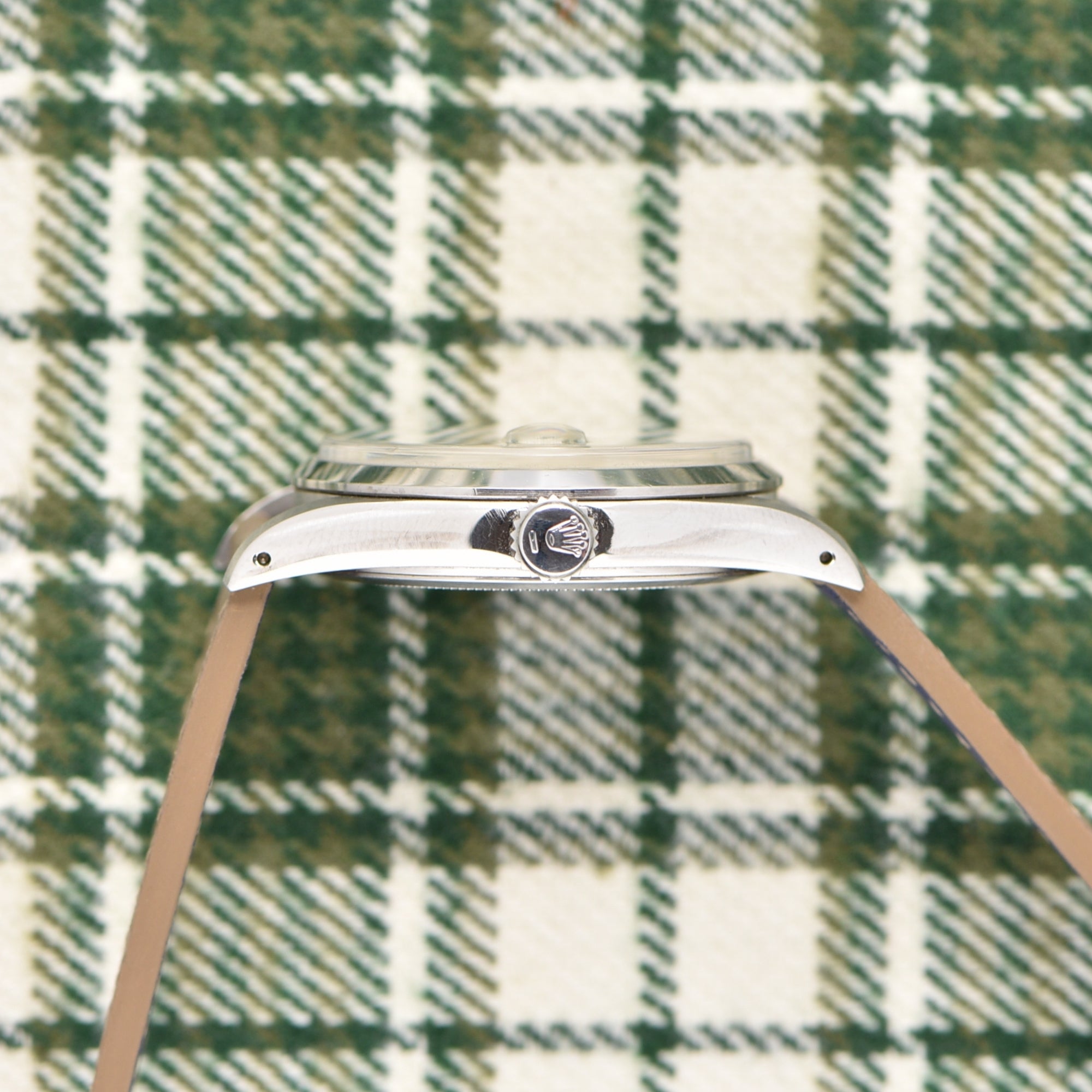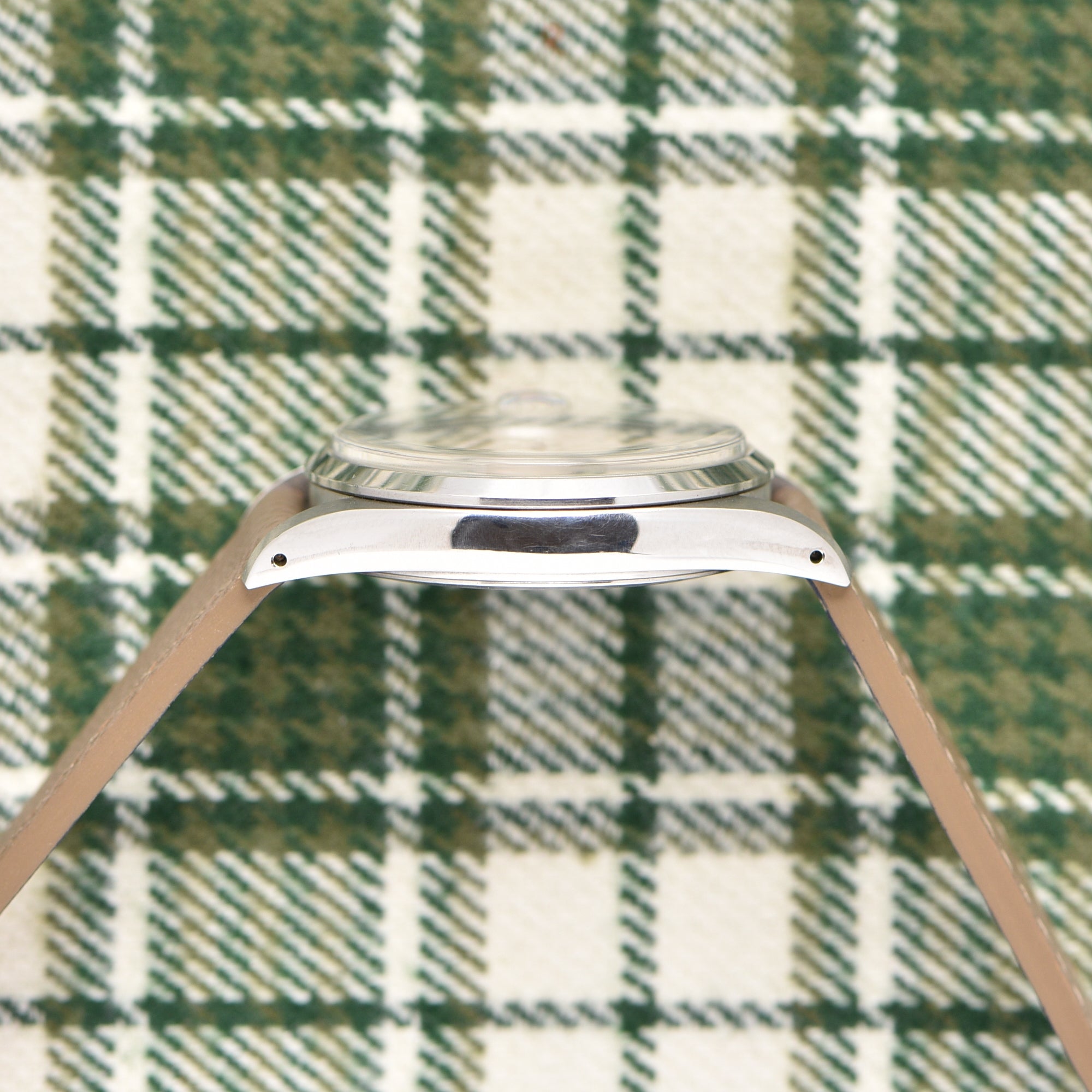 The case has little wear with even, sharp, lugs that look unpolished. The linen dial has a very light tropical patina happening around the outside near the hour markers. The watch is on one of our handmade French straps with a steel buckle.