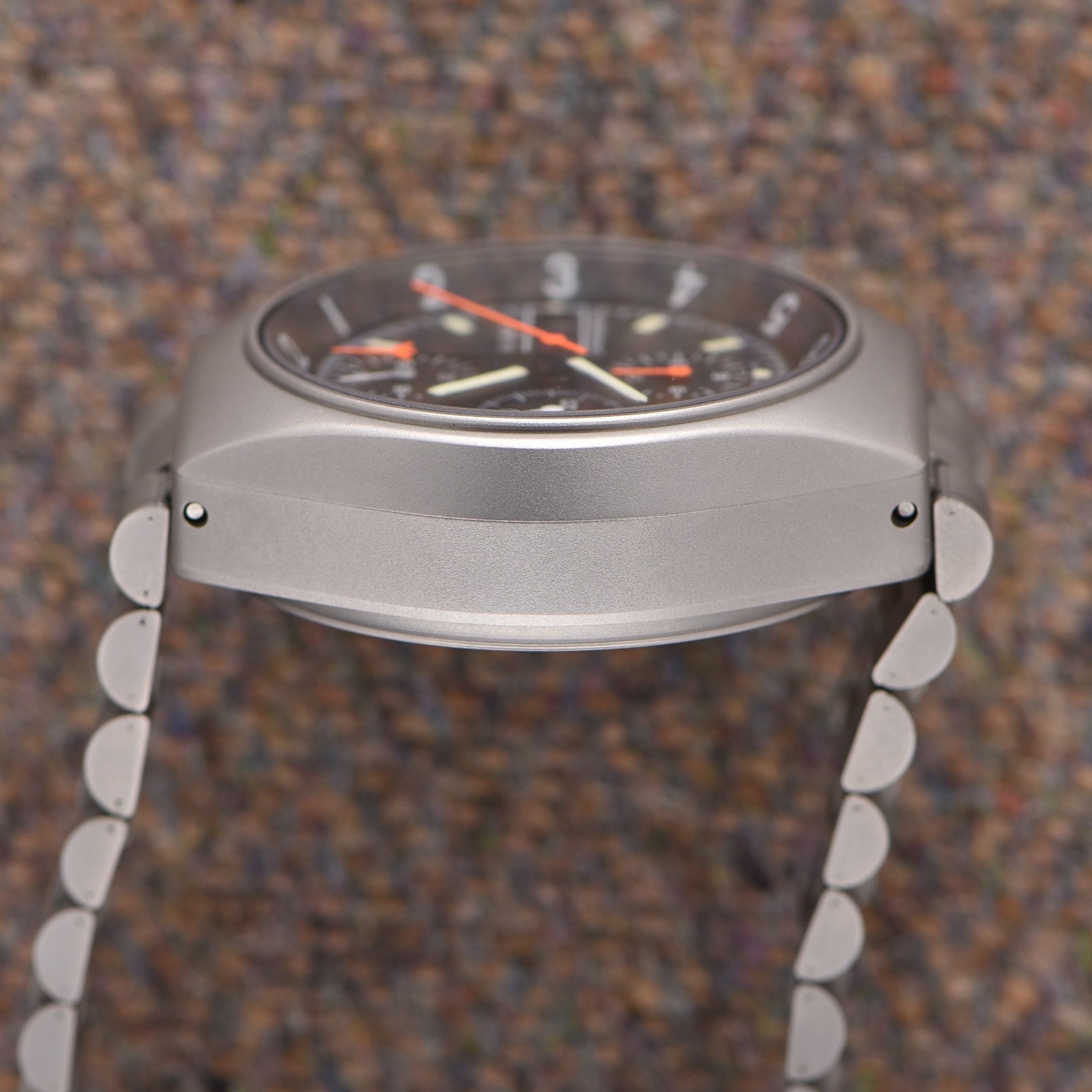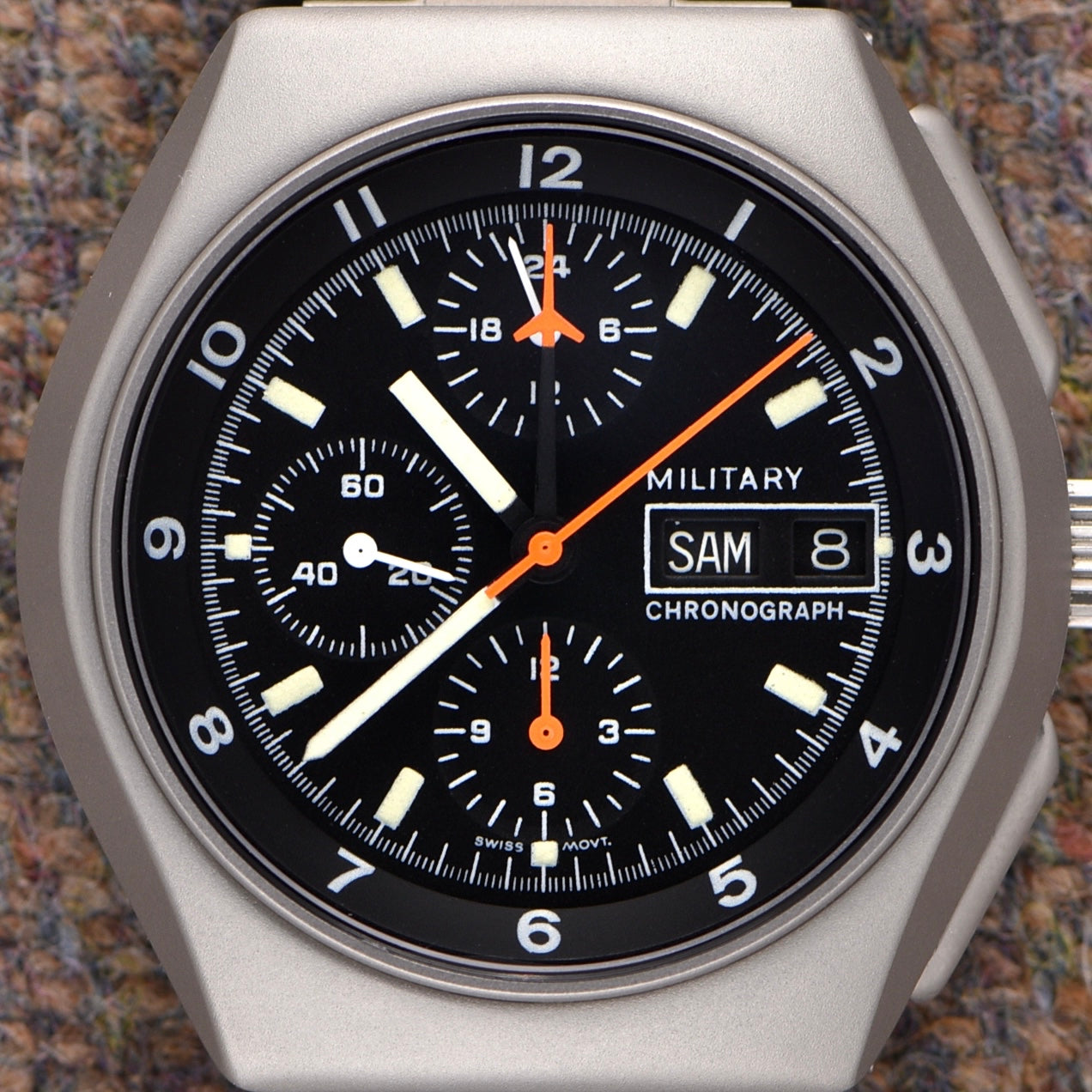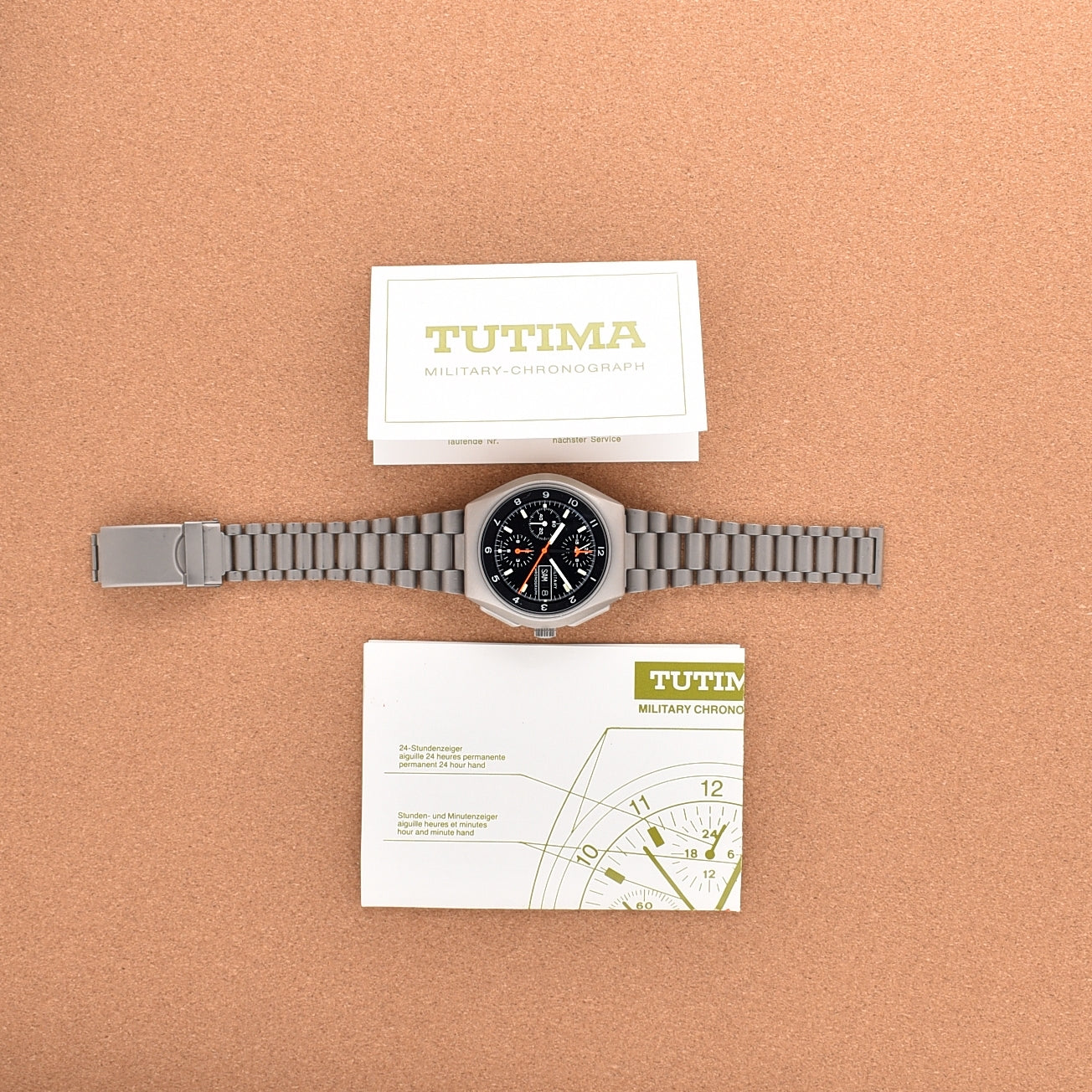 In 1983, Tutima won a contract with the German Air Force and began working on the NATO, famously using the Lemania 5100 as the base caliber. The NATO was launched two years later and formed the basis of Tutima's Military line. The Military chronograph has been available in various configurations during the intervening years, including with and without rotating bezel, various inner bezel markings, with gold bezel and center bracelet links, and in a unique "Commando" form featuring only one sub-dial, the 12-hour totalizer.