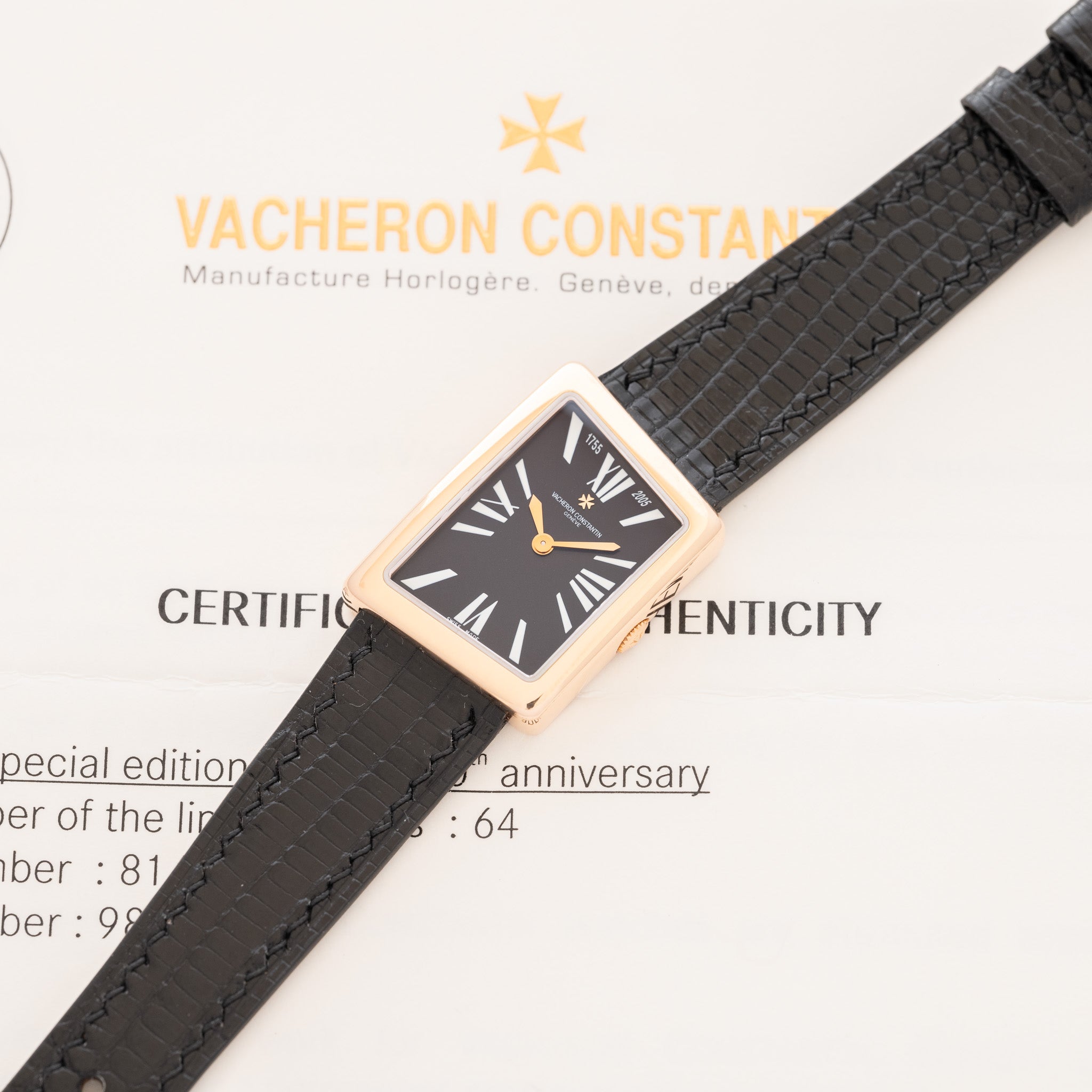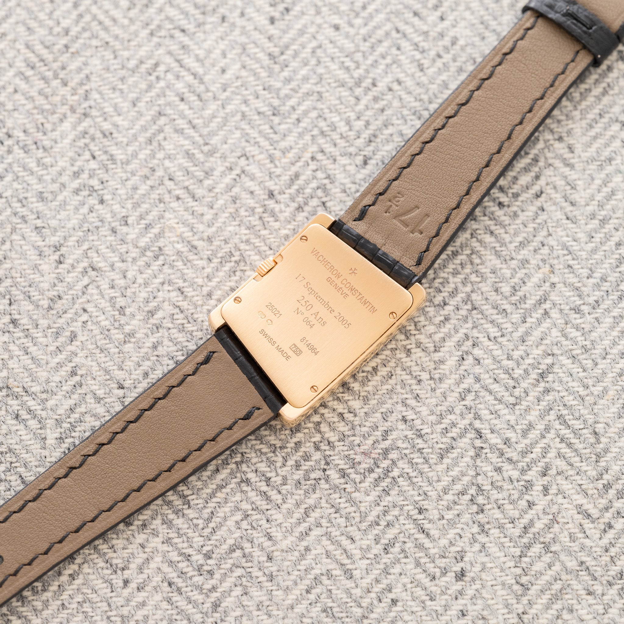 In 2005, two limited editions of the 1972 model were released for the brand's partners and employees, commemorating its 250th anniversary. One of these limited editions features a pink gold rectangular asymmetrical case with a quartz movement. The dial is in dark anthracite grey with painted white Roman numerals and the anniversary dates '1755' and '2005' at 12 o'clock. The caseback is engraved with the date '17 September 2005 250'.