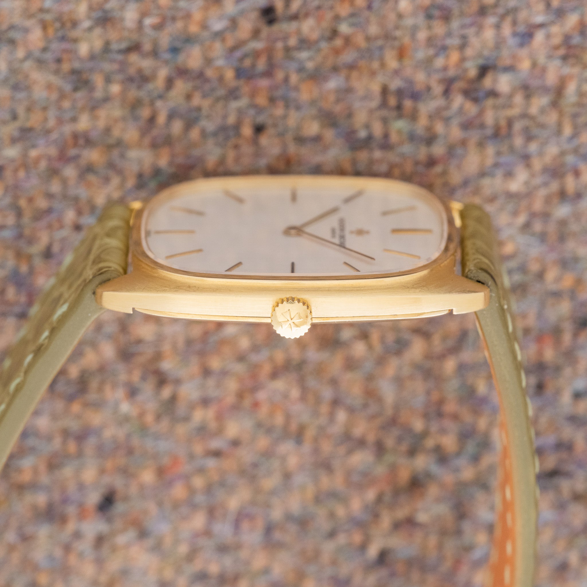 Case: The 18k gold case is 38 by 32 millimeters, but don't let that fool you. The Case wears very large thanks to the thin case and large dial. The watch also has a 20mm lug width, when most dress watches from the 70s were seen with 16-18mm lug width. The extra few millimeters make a big difference in the way this watch wears.