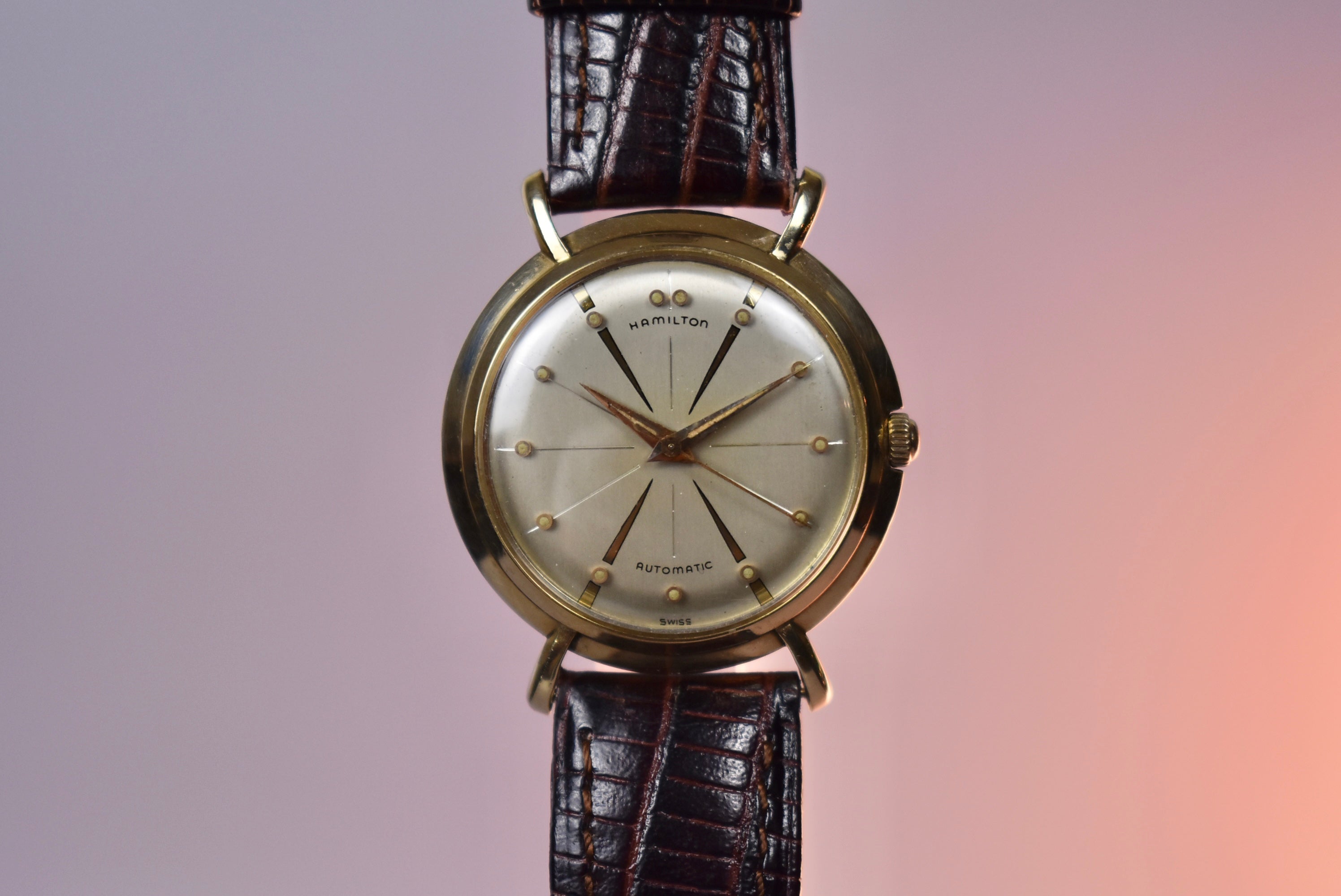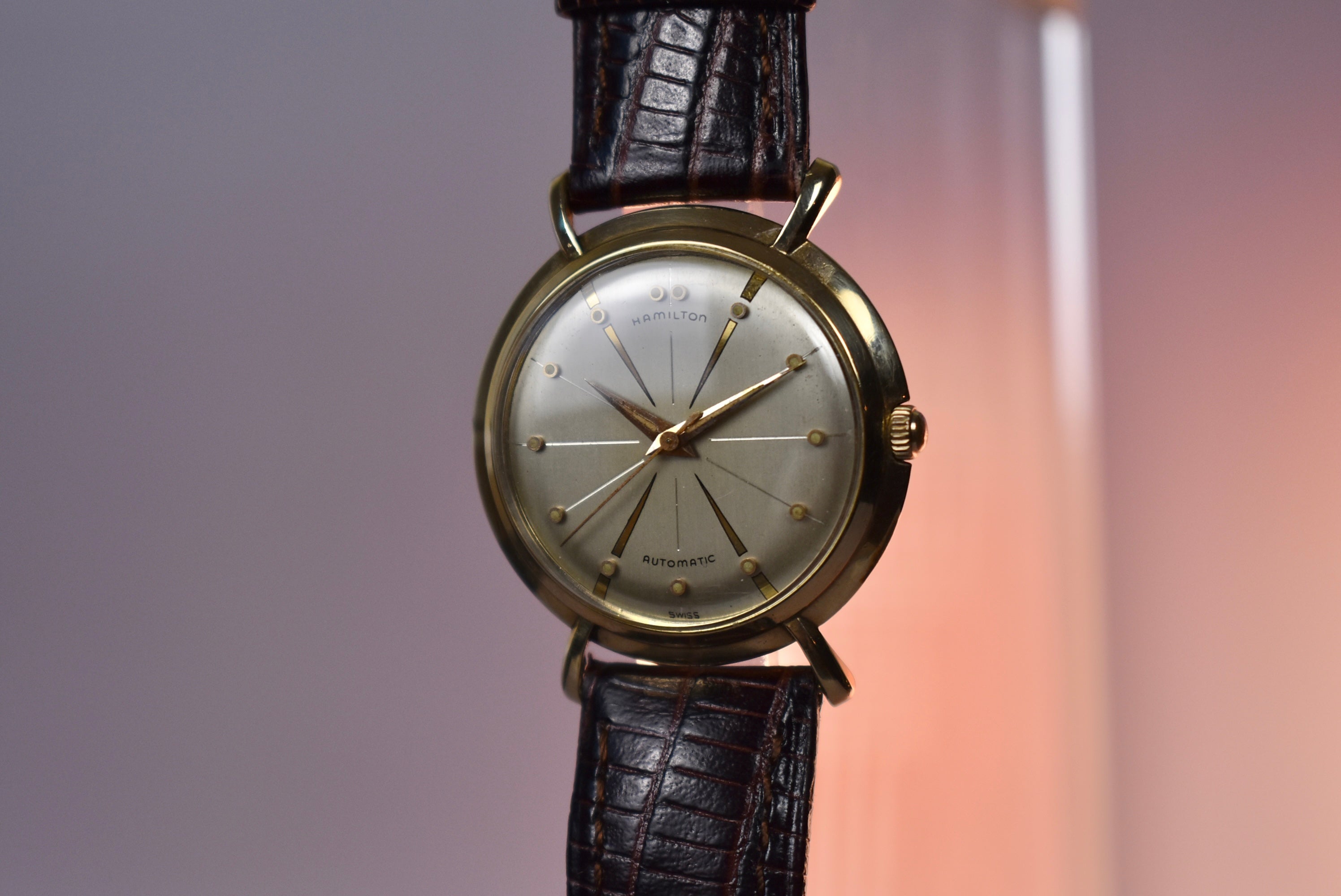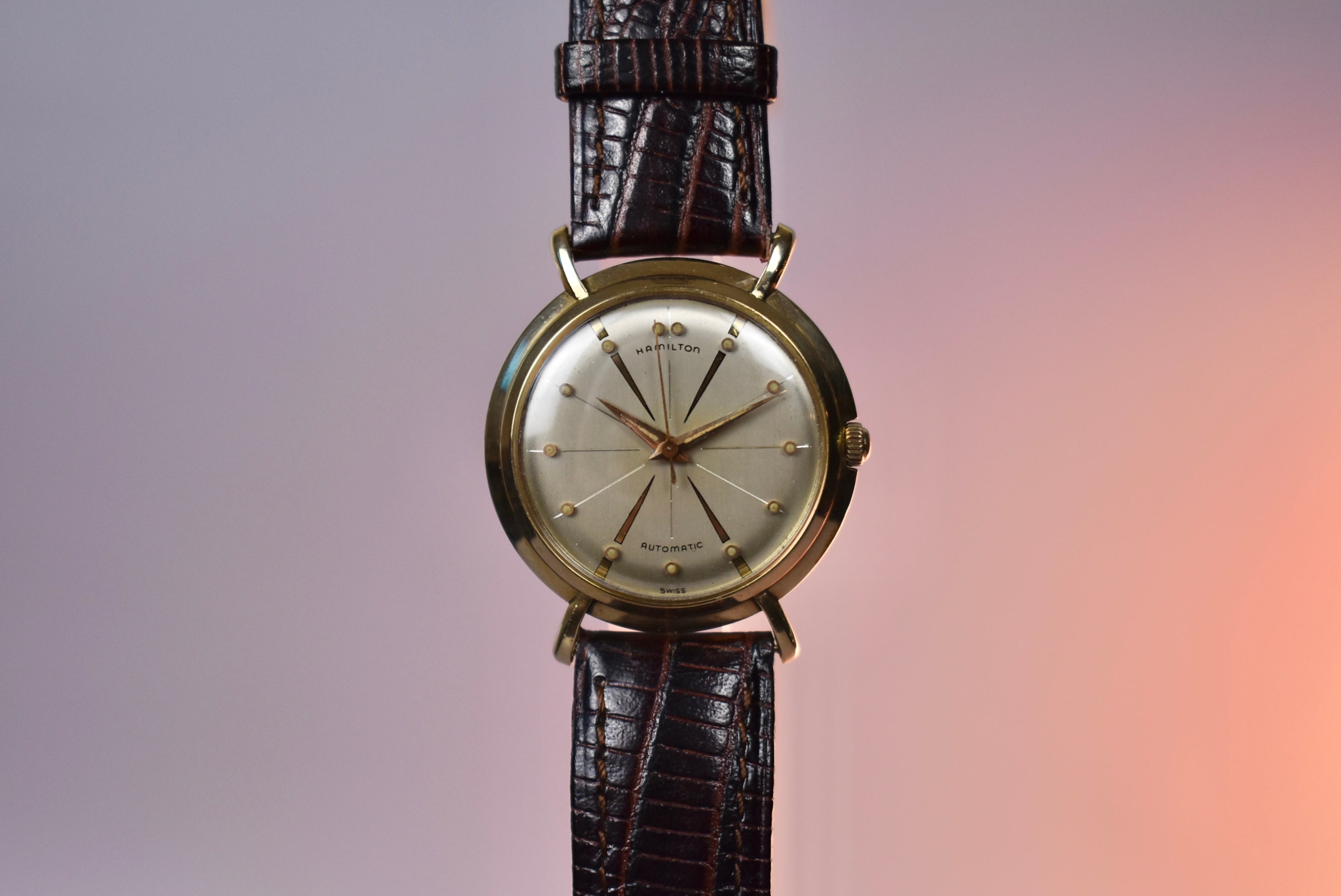 A beautiful example from the '50, this Hamilton Sputnik has a very unique and classy design. Resembling the Sputnik Satellite, the case with its 'X' lugs, has the same design carried out through the dial. A personal favorite part of this watch is the very cool applied circle hour markers making this dress style piece very legible.