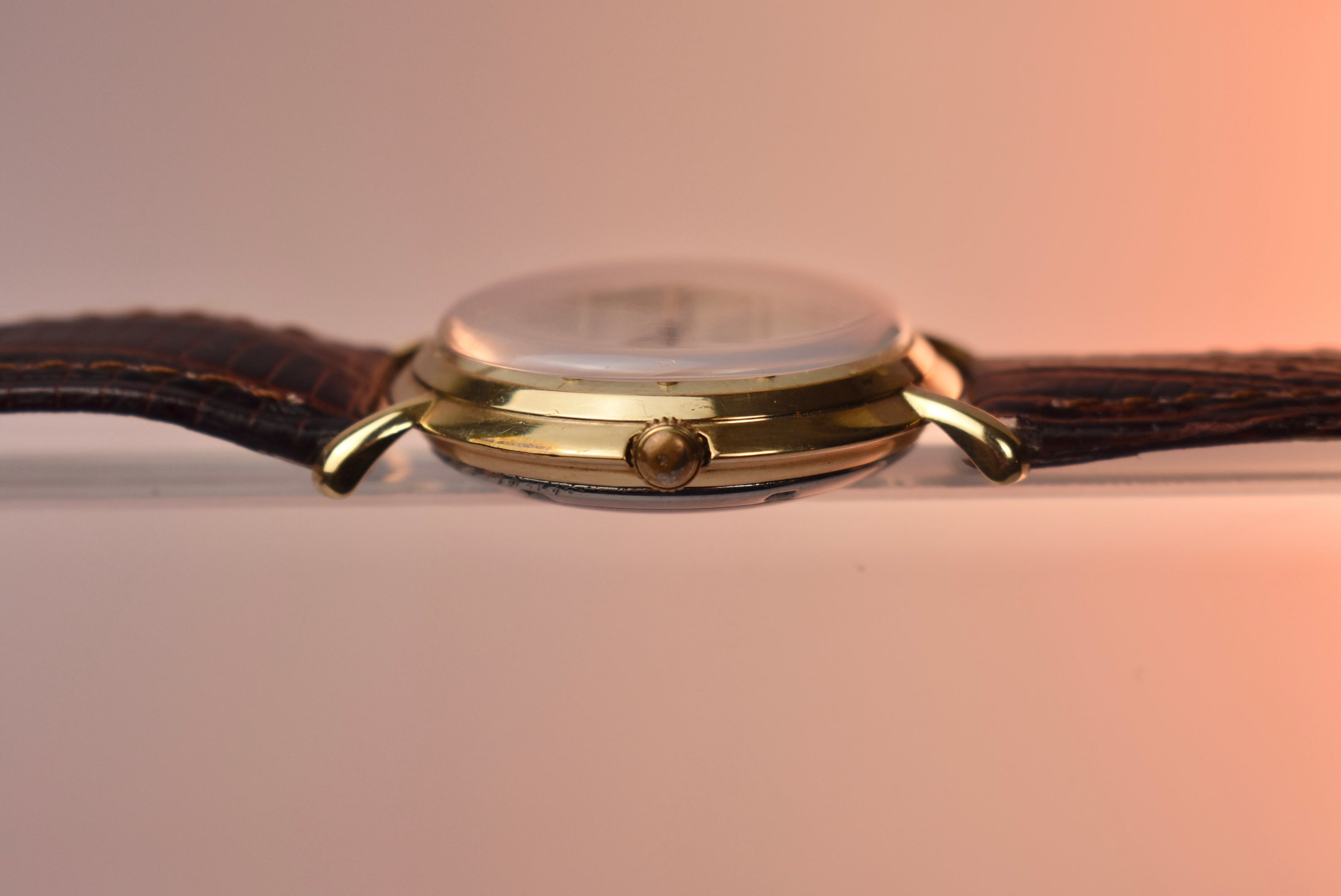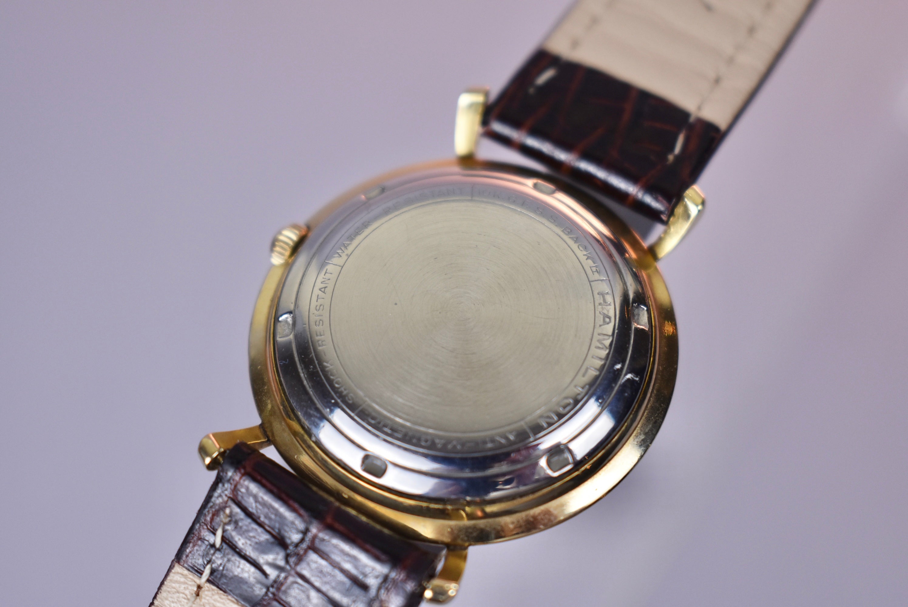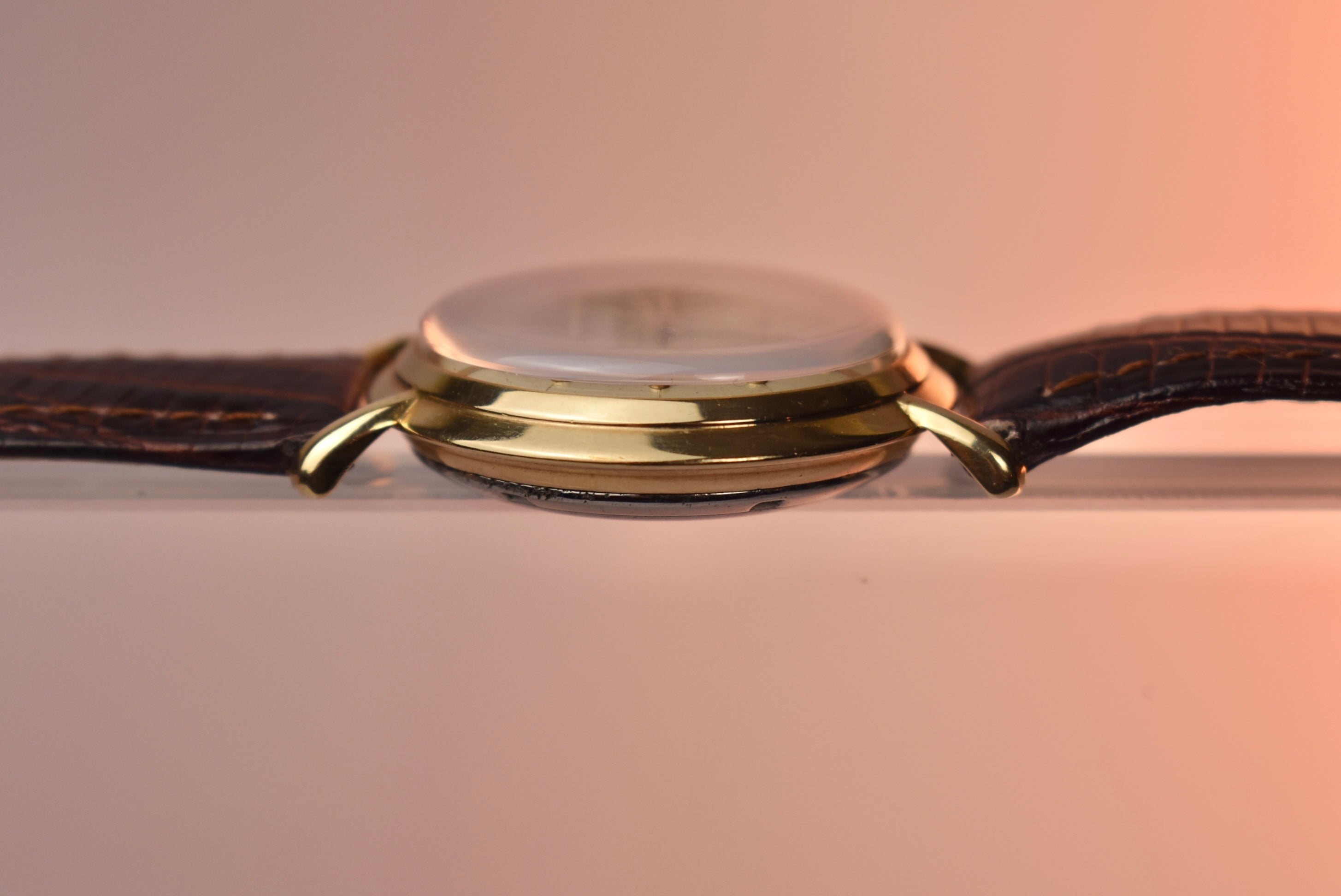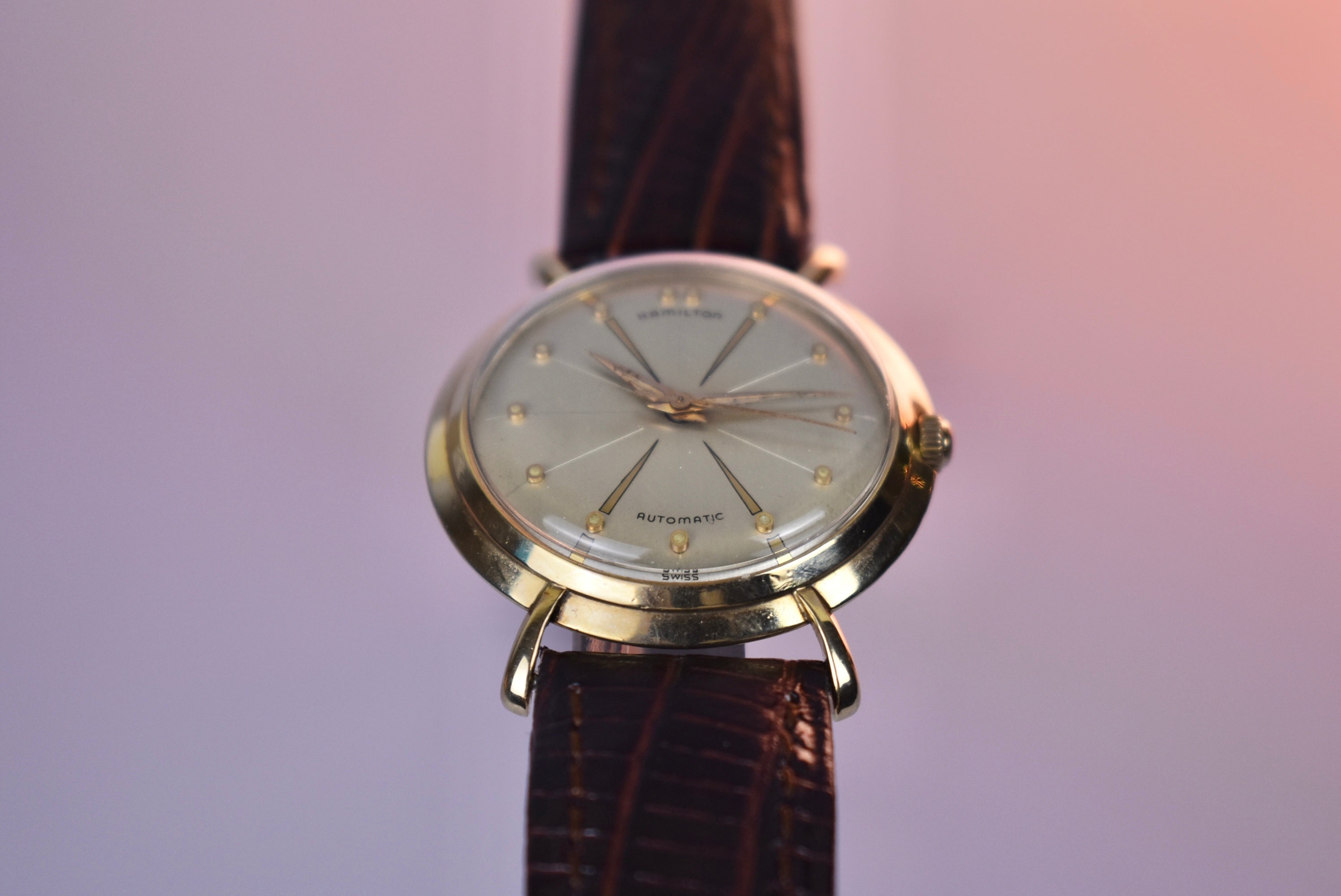 A beautiful example from the '50, this Hamilton Sputnik has a very unique and classy design. Resembling the Sputnik Satellite, the case with its 'X' lugs, has the same design carried out through the dial. A personal favorite part of this watch is the very cool applied circle hour markers making this dress style piece very legible.